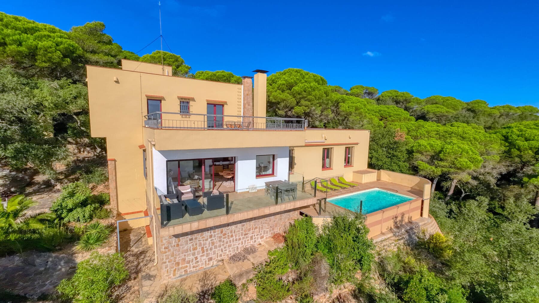 Enclavada en un entorno natural privilegiado, esta exclusiva villa combina elegancia, confort y unas vistas espectaculares al mar Mediterráneo. Rodeada de pinos y vegetación mediterránea, ofrece un ambiente de absoluta tranquilidad, a solo 5 minutos en coche de la idílica playa de Cala Salions.