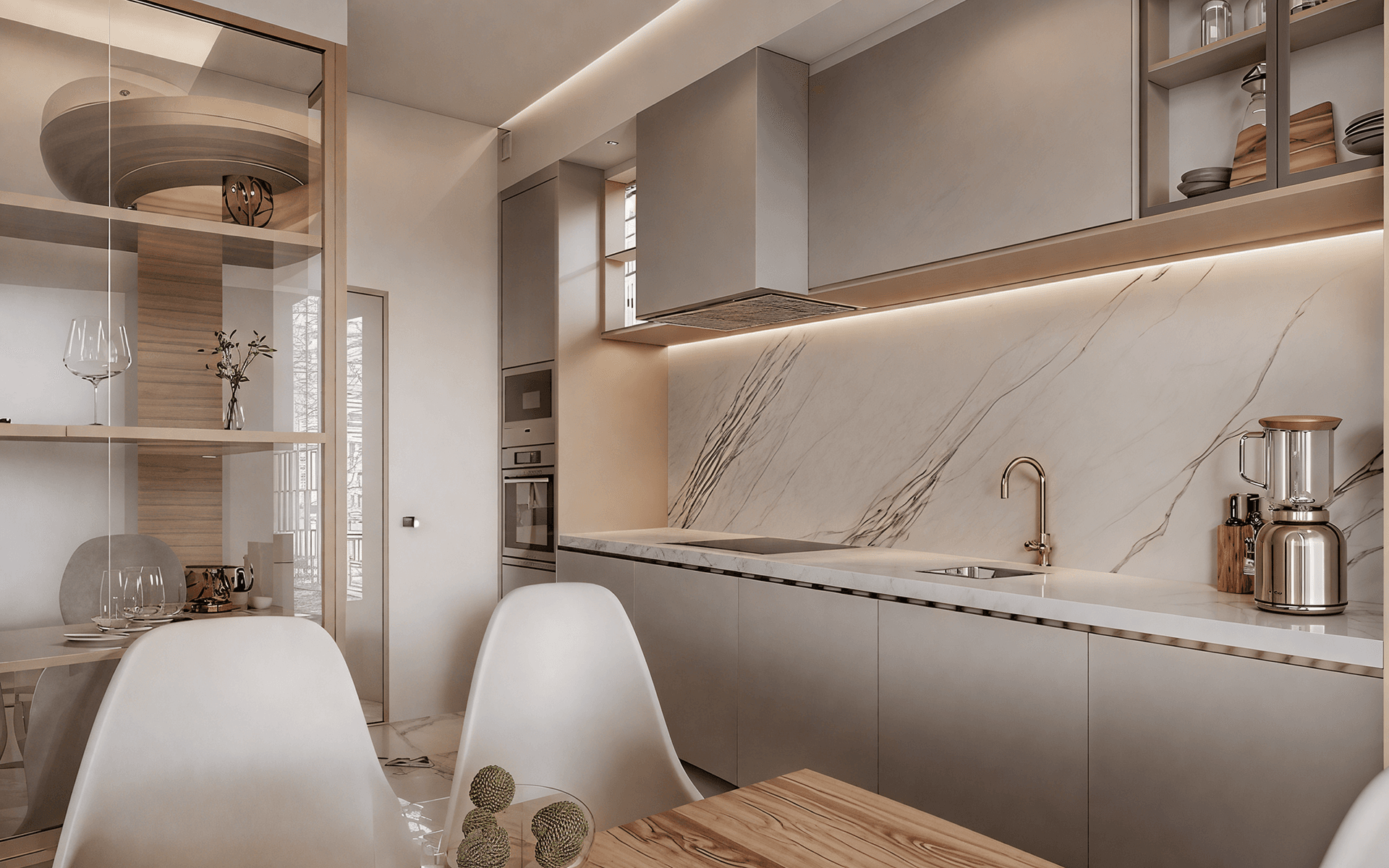 Cuisine équipée avec des meubles hauts et bas à grande capacité. Avec des designs selon la typologie, y compris des appareils électroménagers ; réfrigérateur, four, micro-ondes, plaque de cuisson, hotte, lave-vaisselle et lave-linge. Lire la suite