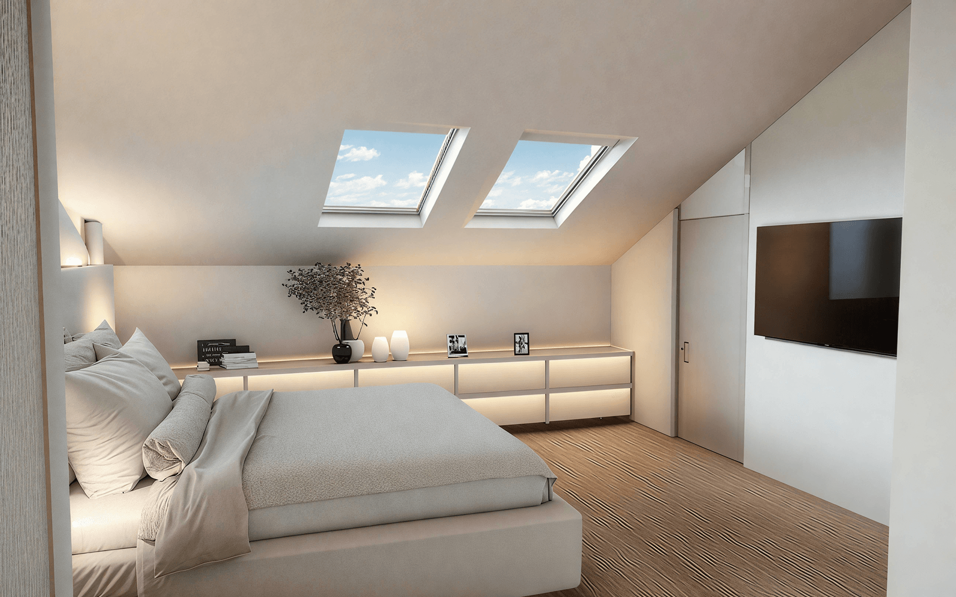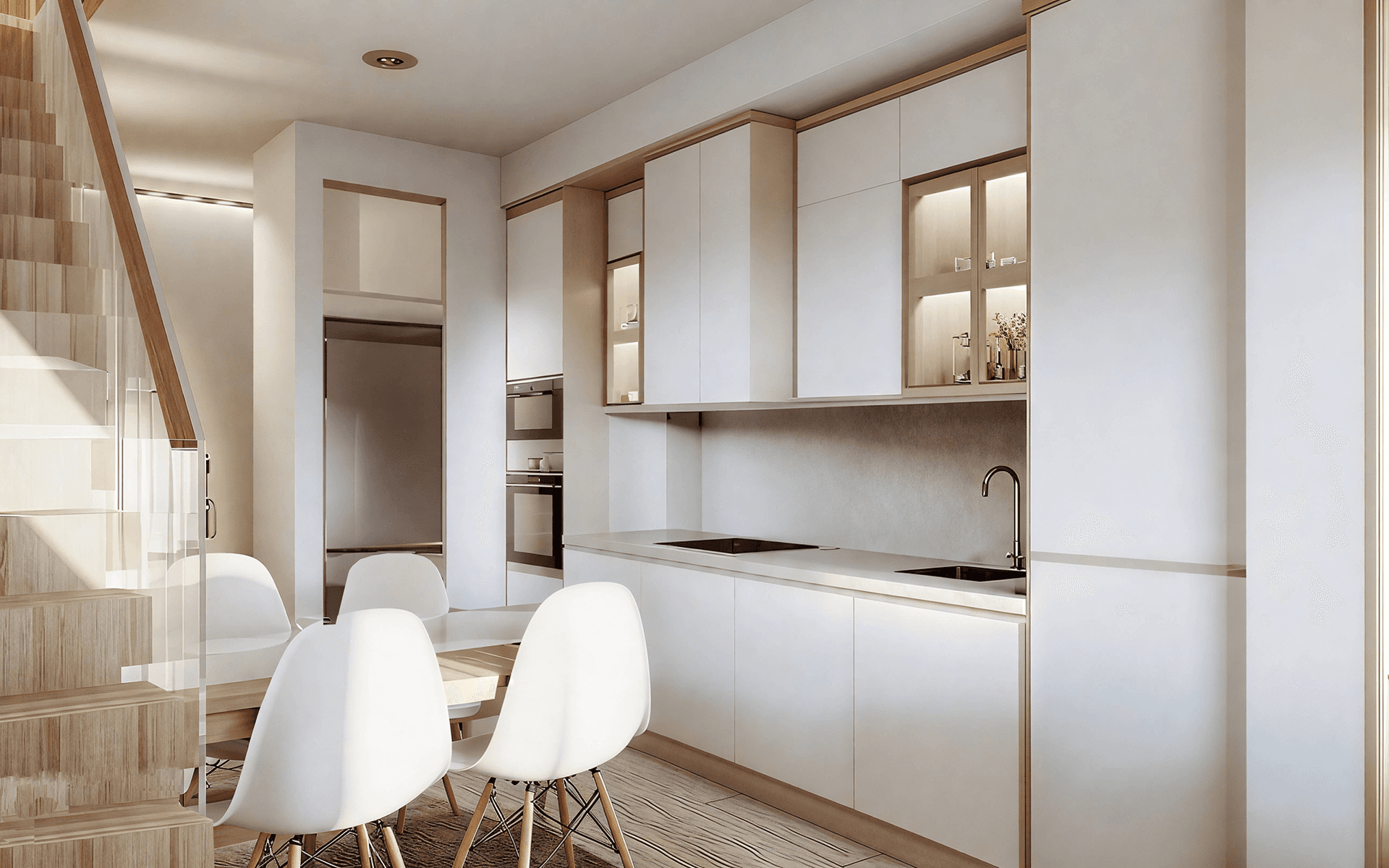 Cuisine équipée avec des meubles hauts et bas de grande capacité. Avec des designs en fonction de la typologie, y compris des appareils électroménagers ; réfrigérateur, four, micro-ondes, plaque vitrocéramique, hotte aspirante, lave-vaisselle et lave-linge. Lire la suite