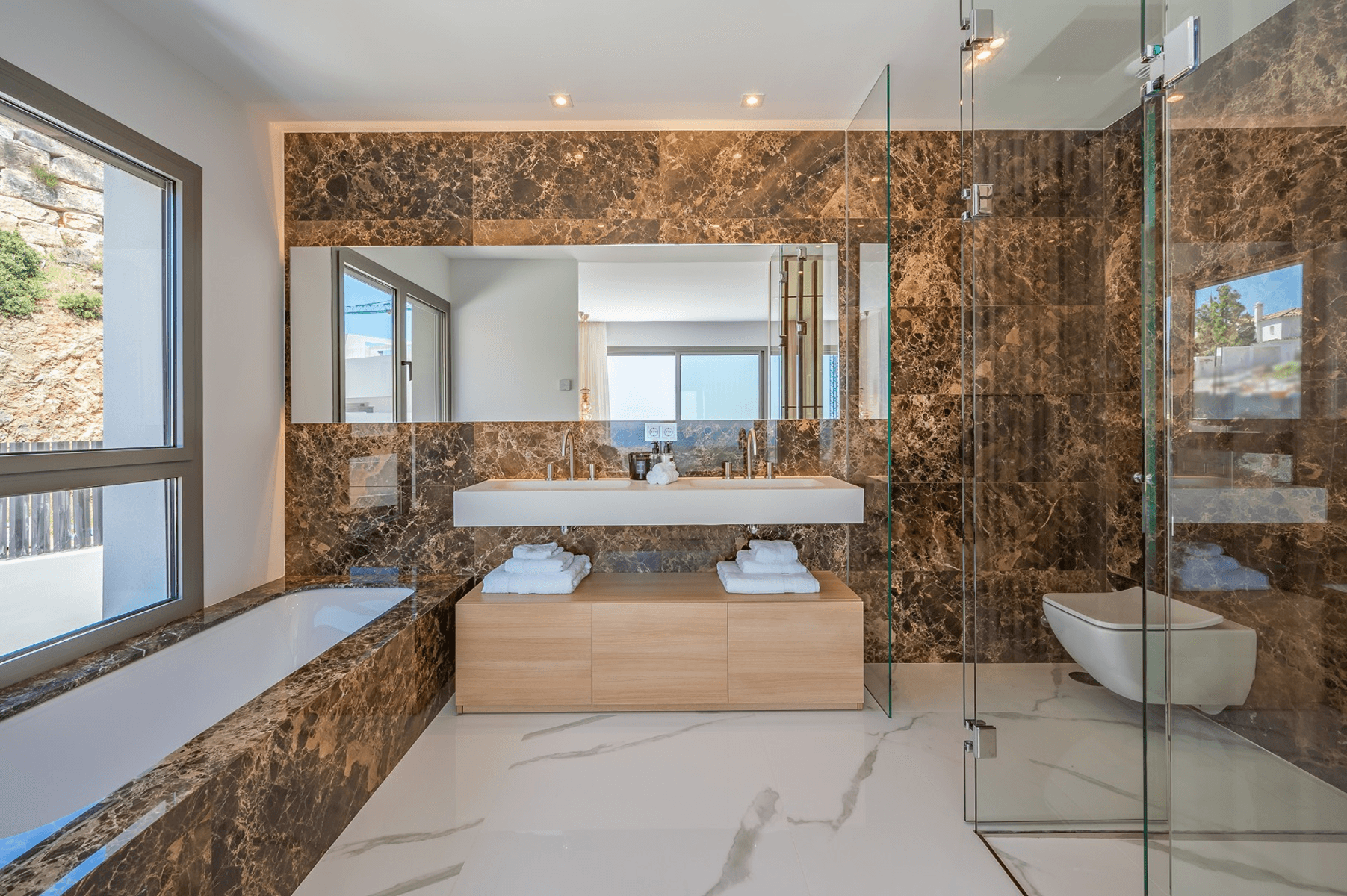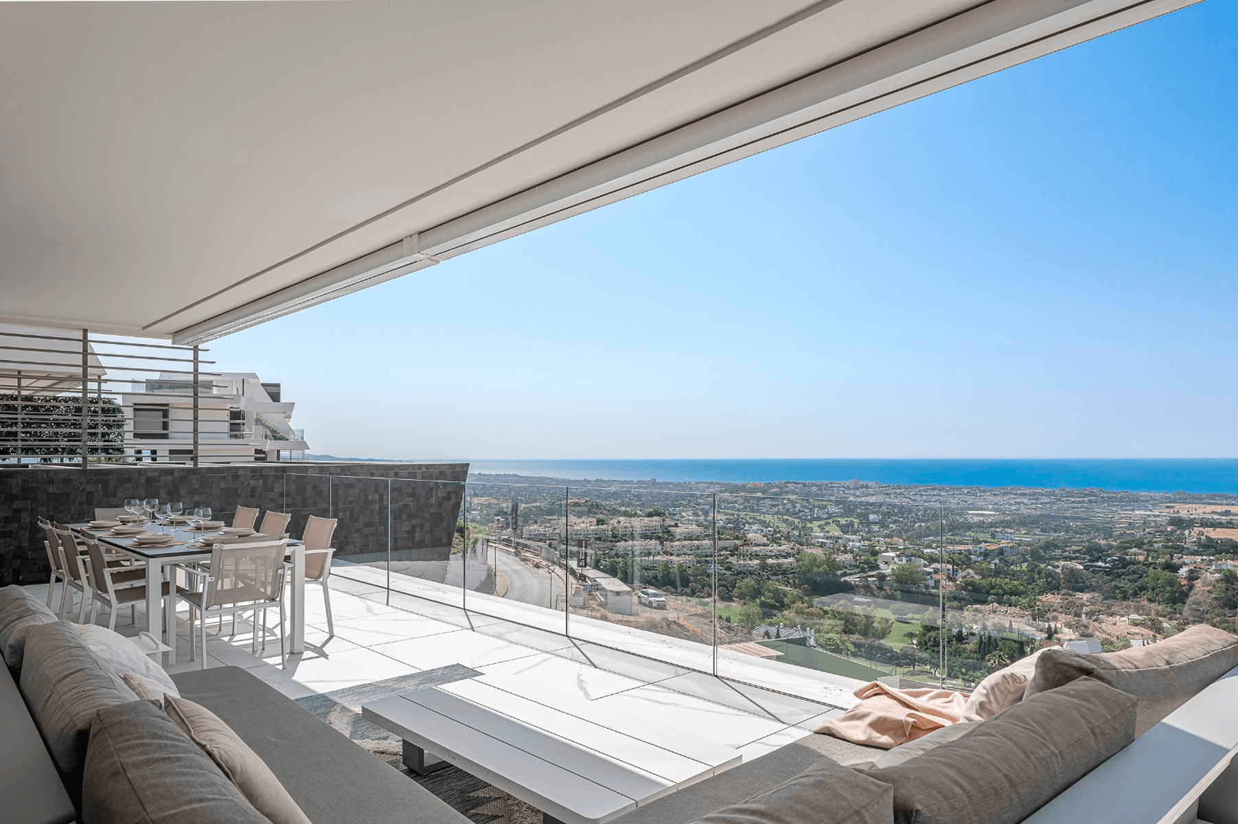 A modern corner apartment is presented, located in Byu Hills, Benahavís, with panoramic views of the golf course and the sea.