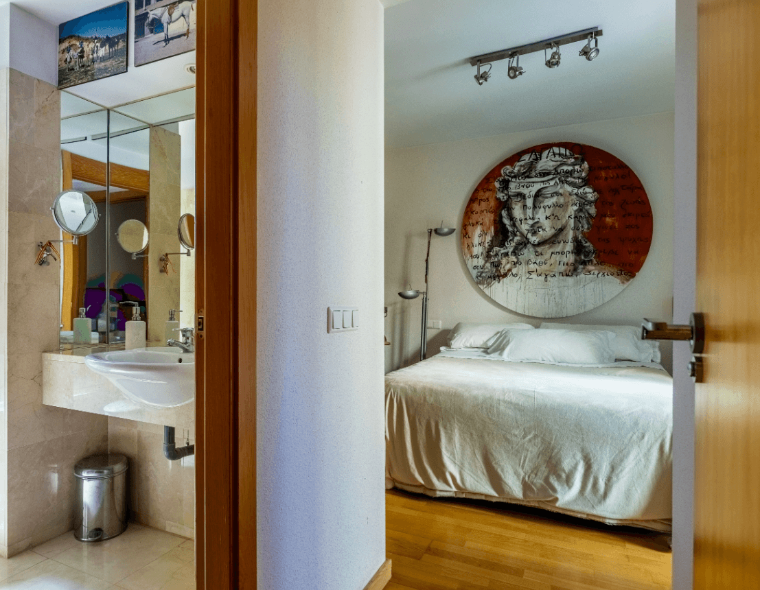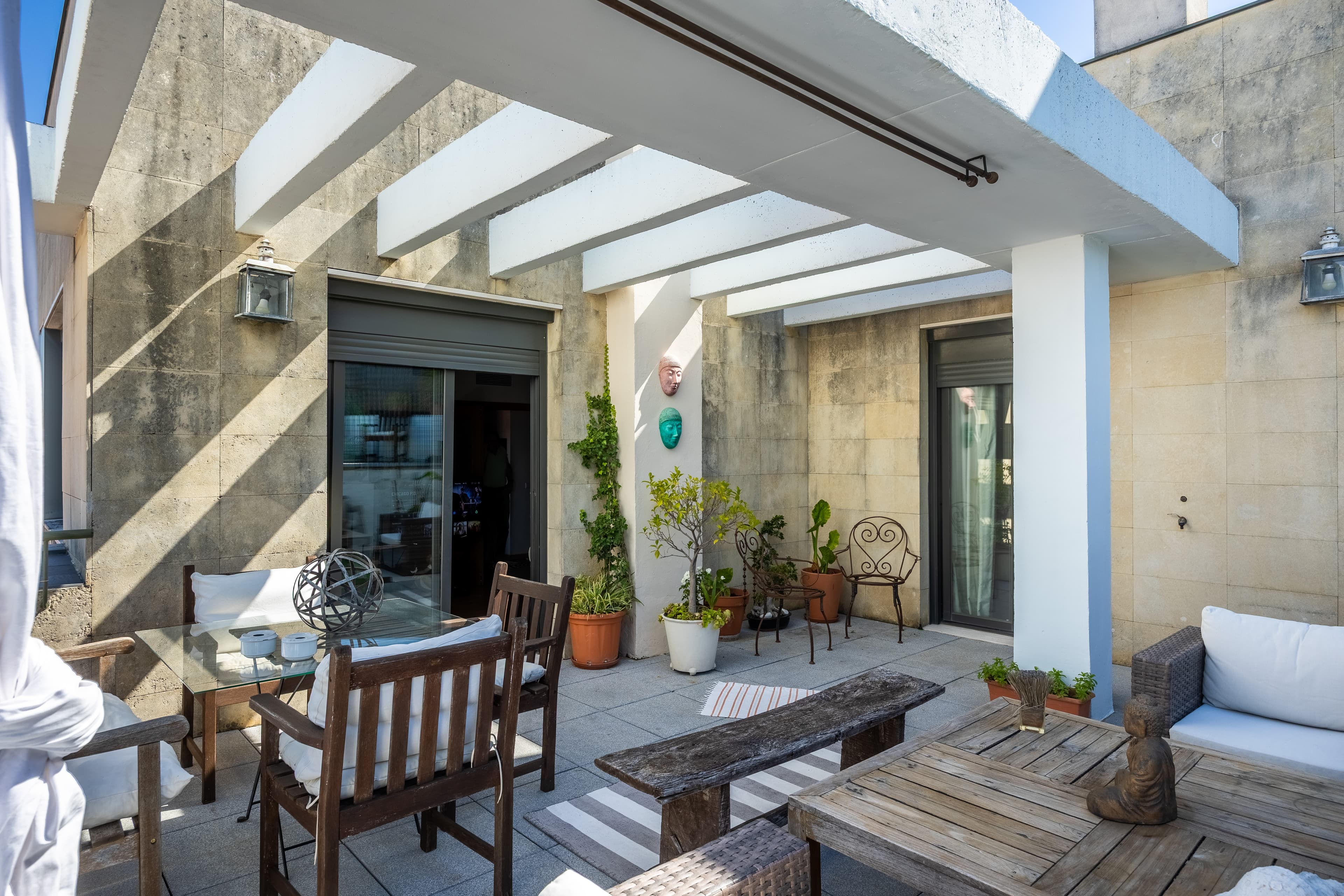 Located in the residential area of Vega del Rey, a five-minute drive from the center of Seville and the Triana neighborhood, this penthouse offers a built area of 114.5 m² and a private terrace of 67 m² with a pool. The property is part of a gated community with gardens and security measures. It was built in 2010 by the well-known construction company Ferrovial.