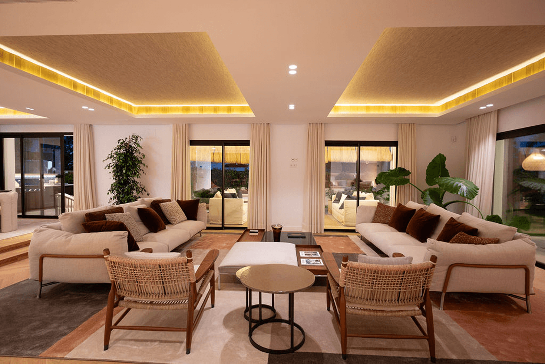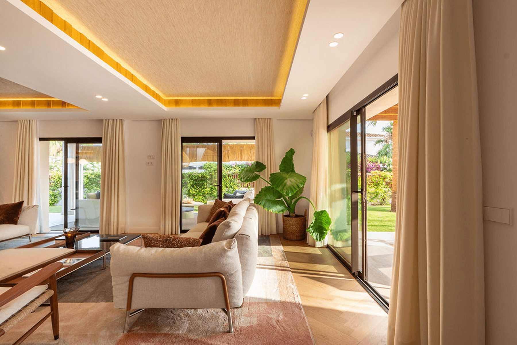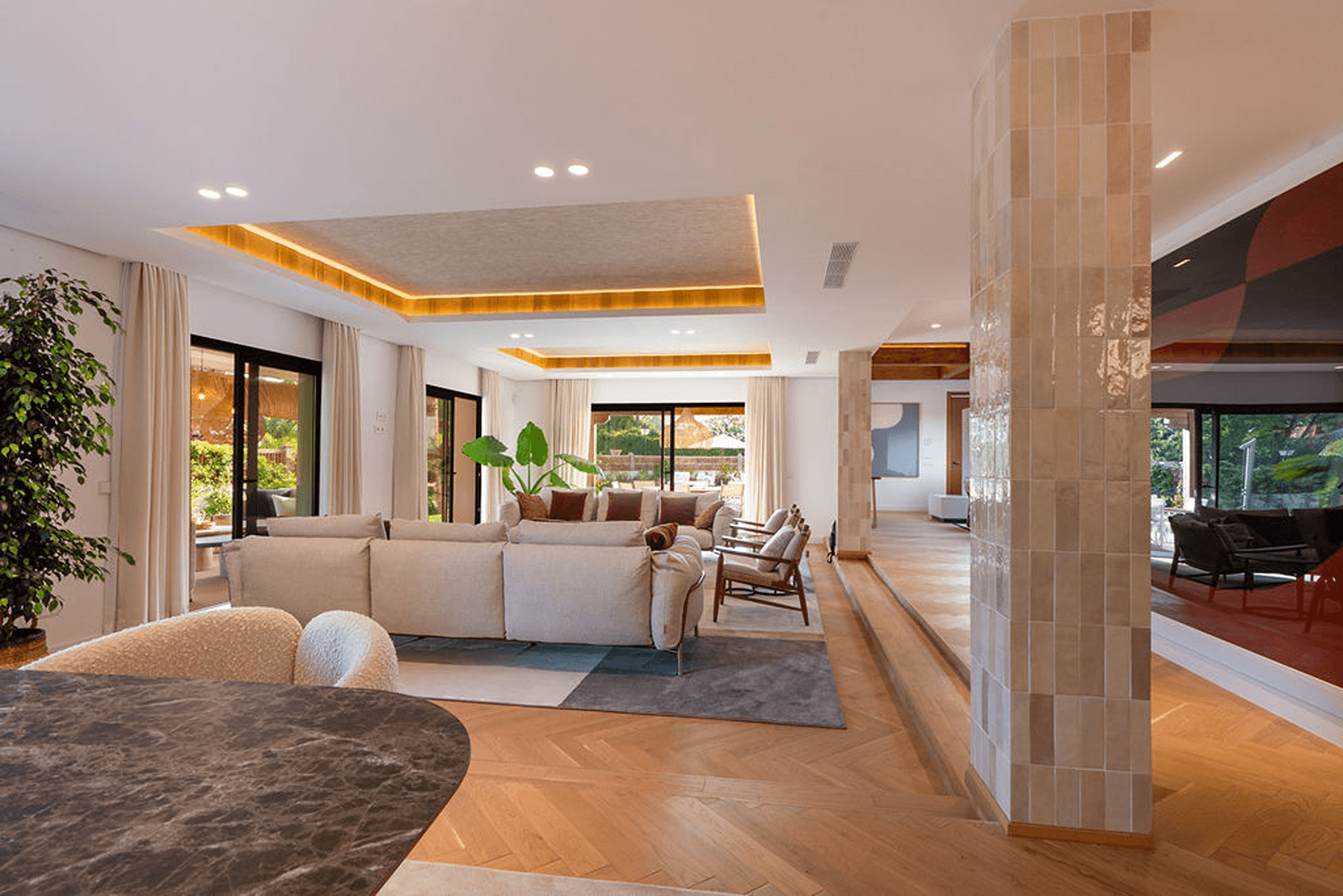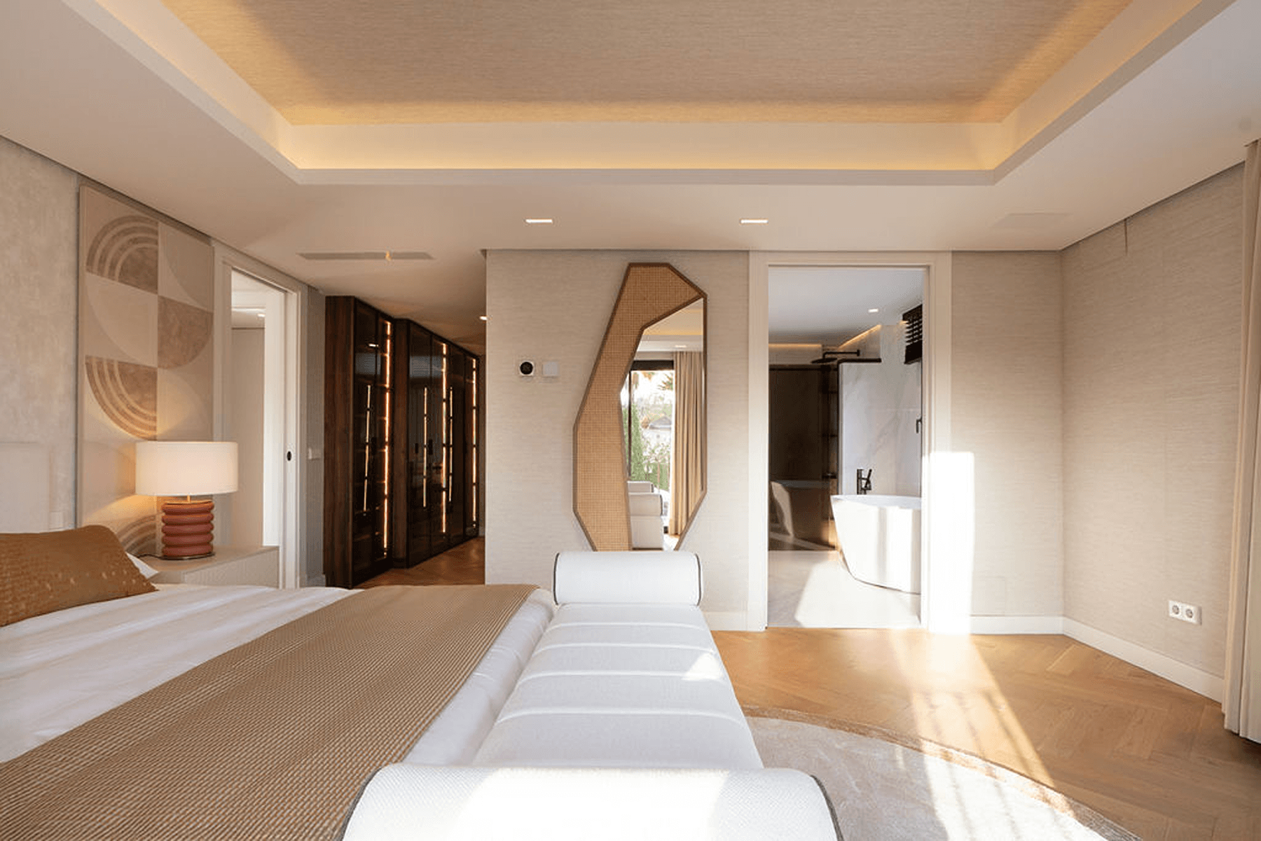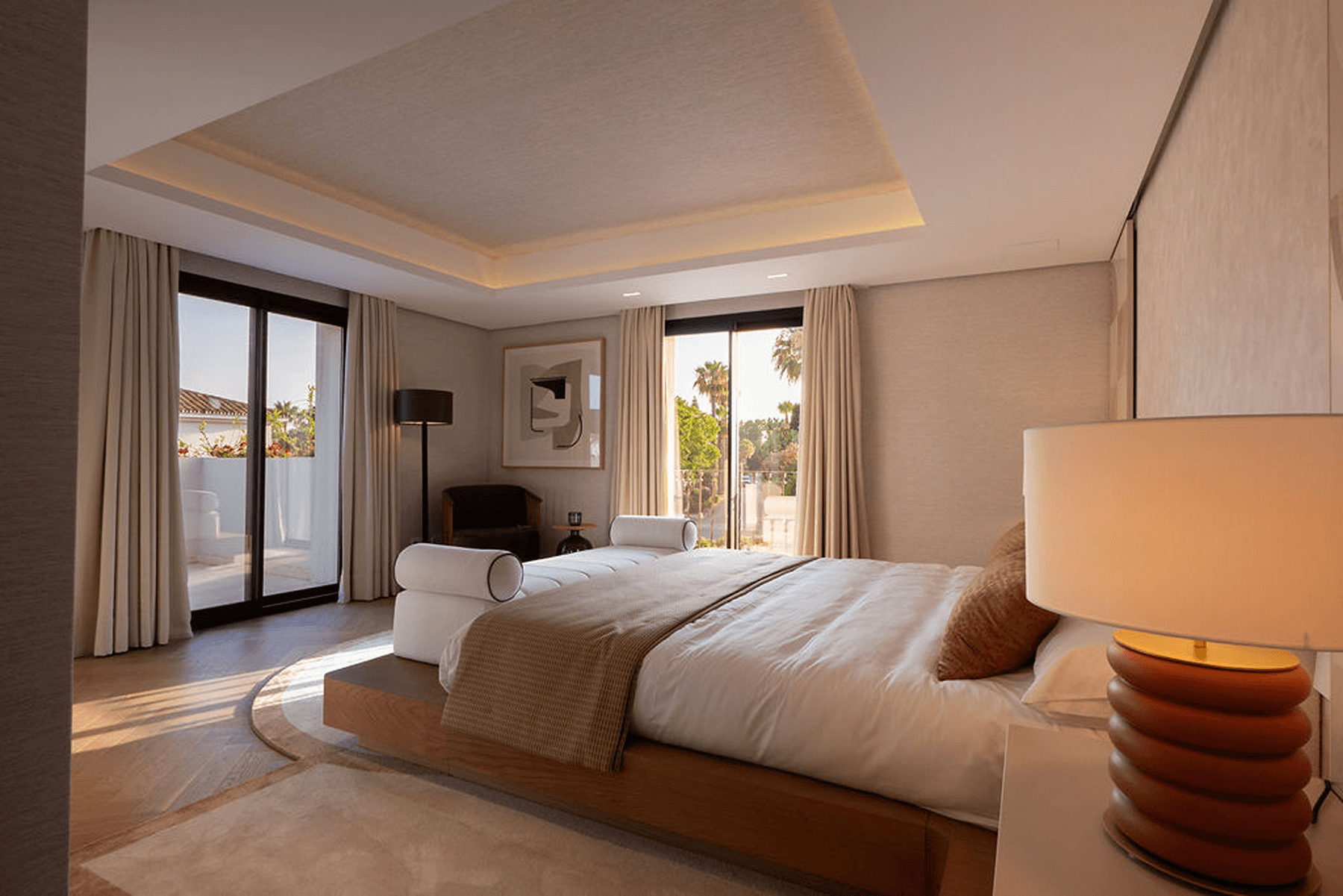 Just 300 meters from the beach, this contemporary villa in Casasola combines architectural elegance with coastal living. Located on a 1,050 m² plot with 560 m² built, the property offers six bedrooms, including a master suite with a dressing room, five bathrooms, a study/office, guest and staff rooms, and multiple living spaces. The interiors, designed by Pedro Peña, stand out for the use of refined materials, beamed ceilings, and an open plan, centered around a Siematic kitchen with Bosch appliances, breakfast bar, and central island.