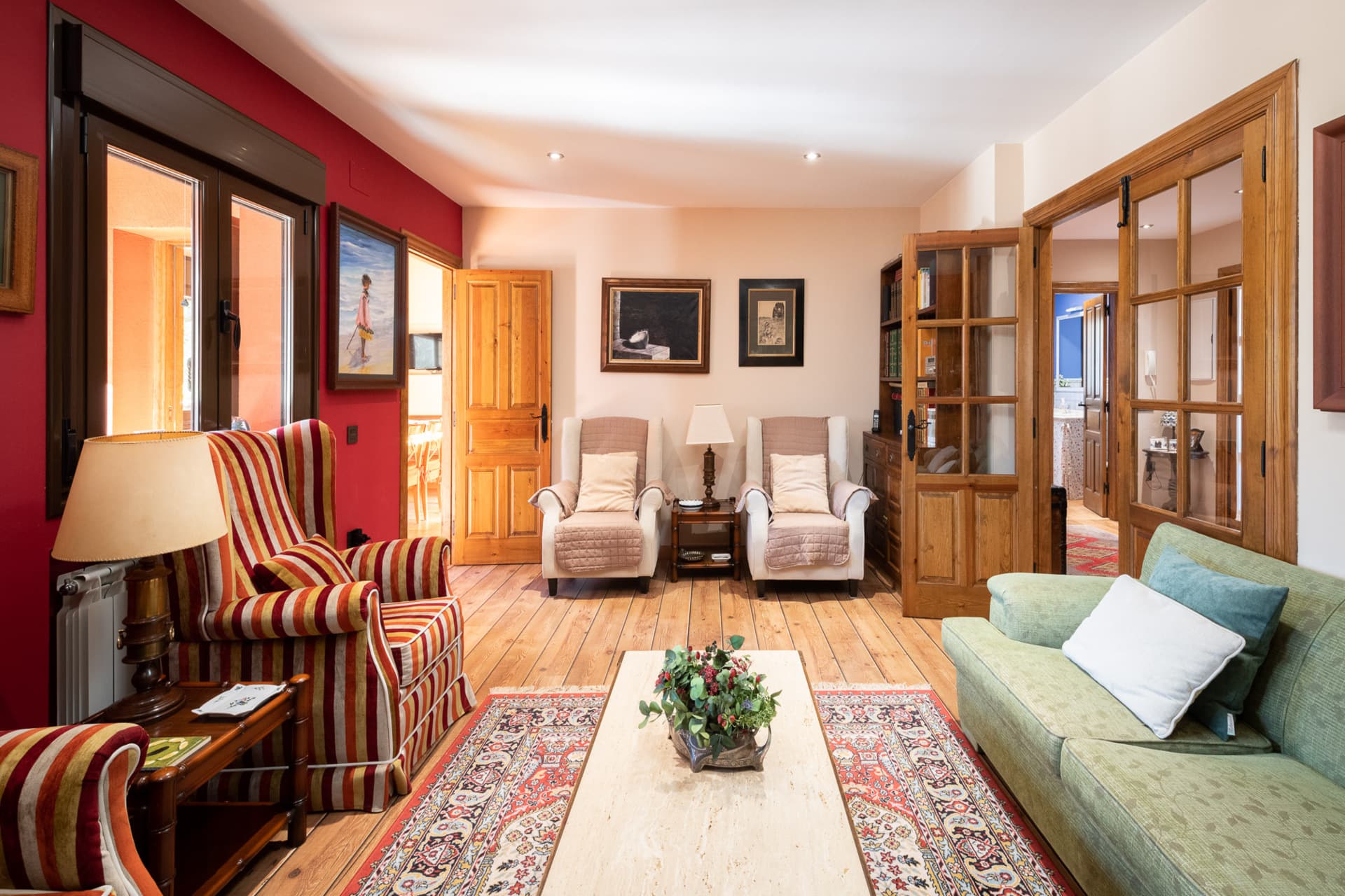 The house has a spacious and well-maintained garden, from which you can enjoy unobstructed views of the mountainous landscape. On the main floor, there is a bright living room with a fireplace, a kitchen with an office and pantry, a guest toilet, and the master bedroom with an en-suite bathroom. A closed terrace with large windows connects directly to the outside, offering a smooth transition to the garden area. Read more