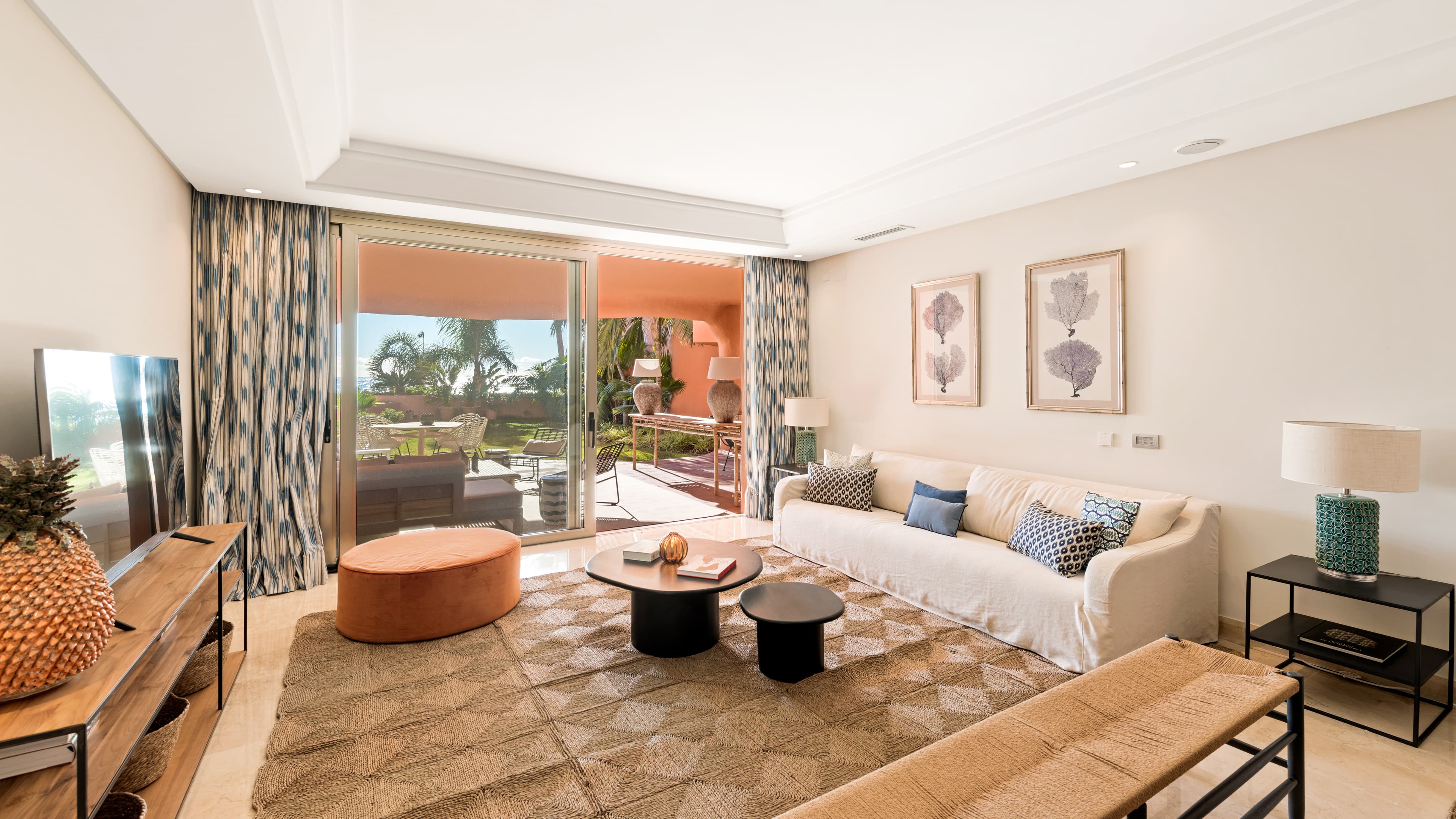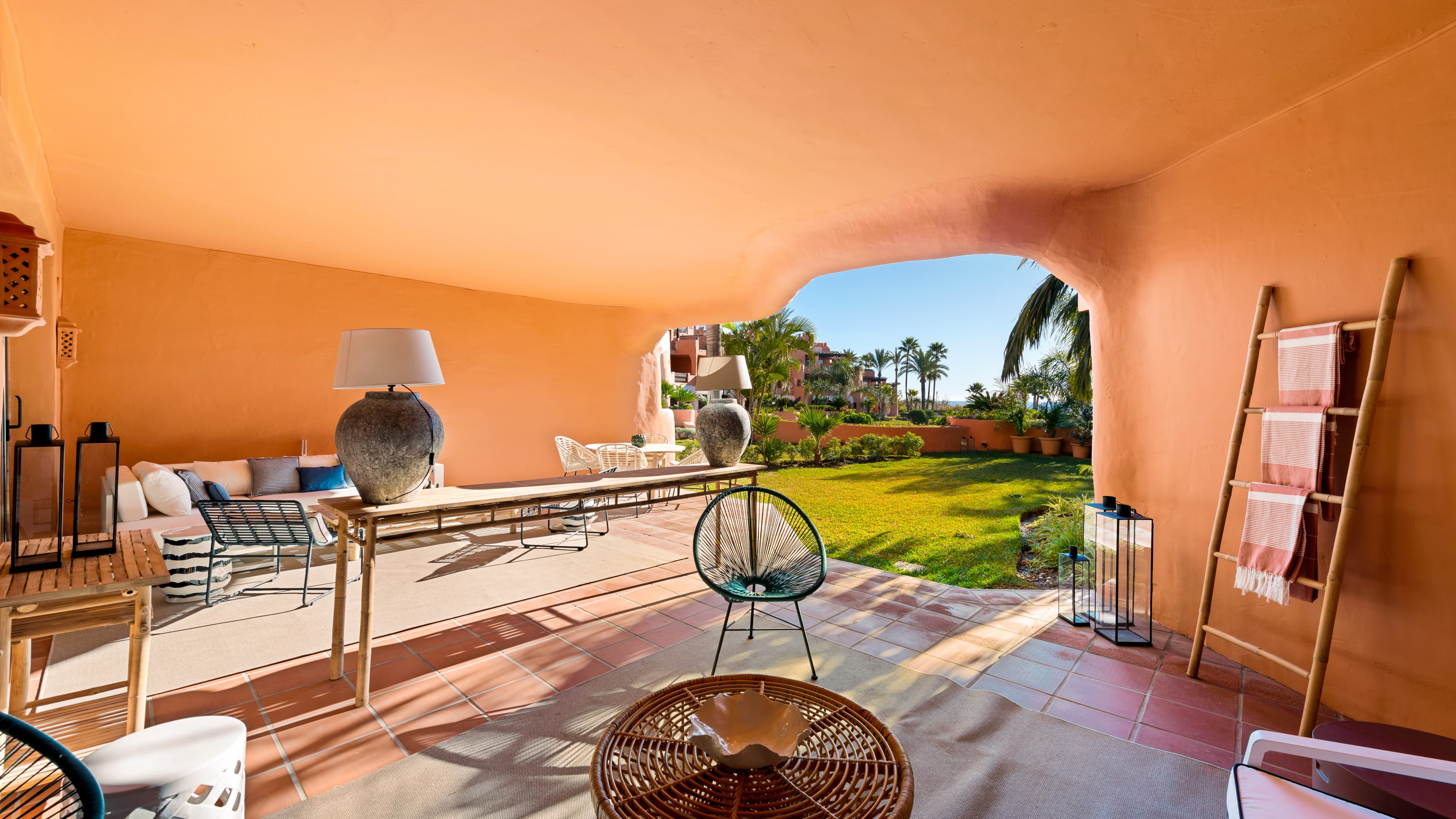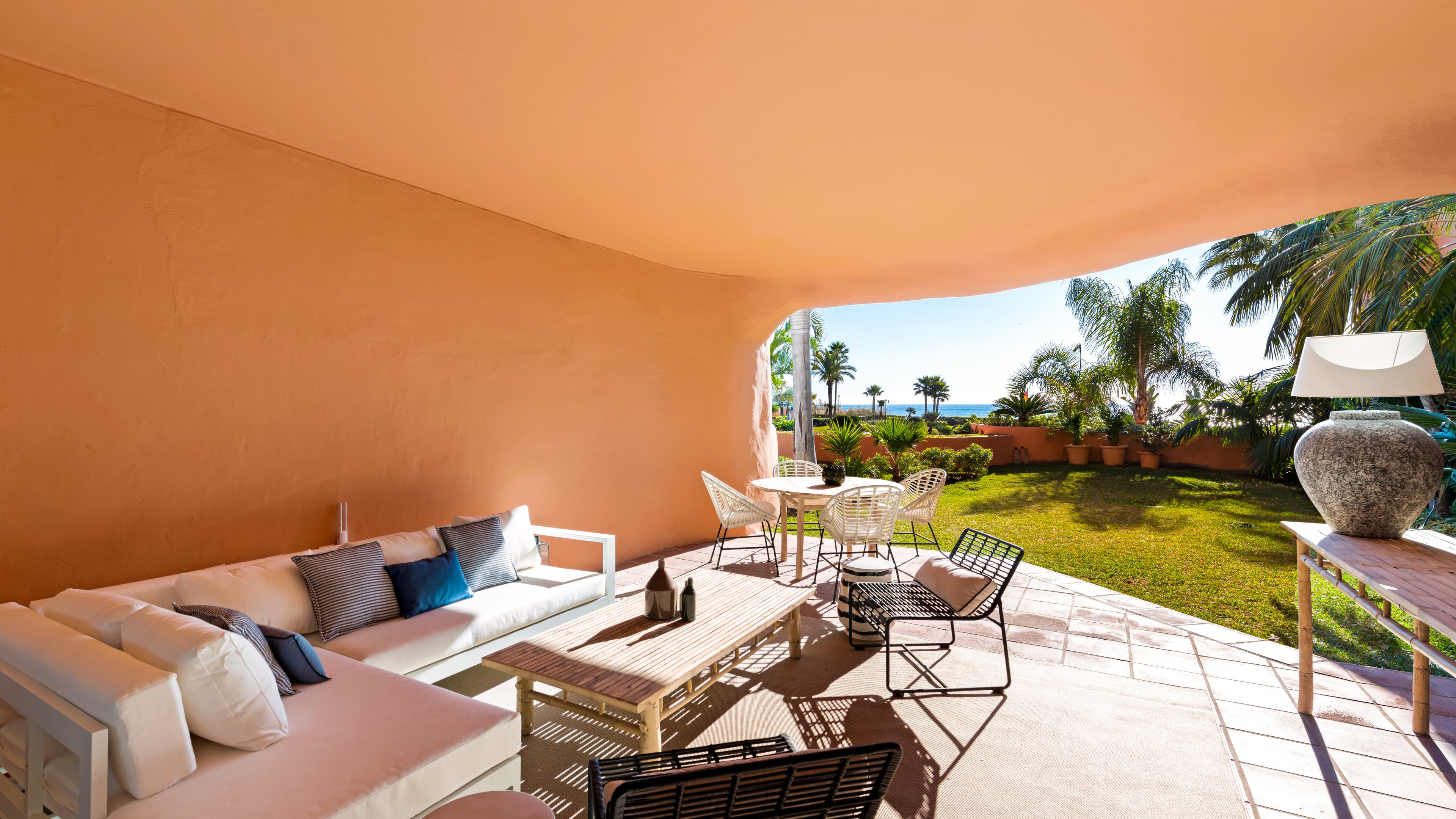 Duplex penthouse within the prestigious seafront community La Morera, holding a prominent place among the most exclusive complexes of its kind. The community is known for its meticulously maintained tropical gardens, including indoor and outdoor pools, a well-equipped gym, and a sauna. The penthouse, strategically located, captures impressive views of the lush gardens and the Mediterranean Sea. The property is elegantly decorated with custom-designed furniture, included in the price. Upon entering, a spacious lobby elegantly transforms into an open-plan living room, seamlessly integrating the kitchen with its central island and the dining area. The large main terrace enjoys sun all day long, with panoramic views of the sea and the extensive communal garden. The main level houses three en-suite bedrooms, each with a unique design. On the upper level, there is the spacious master bedroom, featuring a walk-in closet and a private terrace complete with a jacuzzi, enhancing the experience of luxury living. Additional amenities include underfloor heating, a state-of-the-art B&O sound system, and an energy-efficient hot and cold air conditioning system. Complementing the appeal of this property are 2 designated parking spaces and a storage room within the underground communal garage. This offer presents a unique opportunity for those seeking an exclusive frontline residence with stunning views.