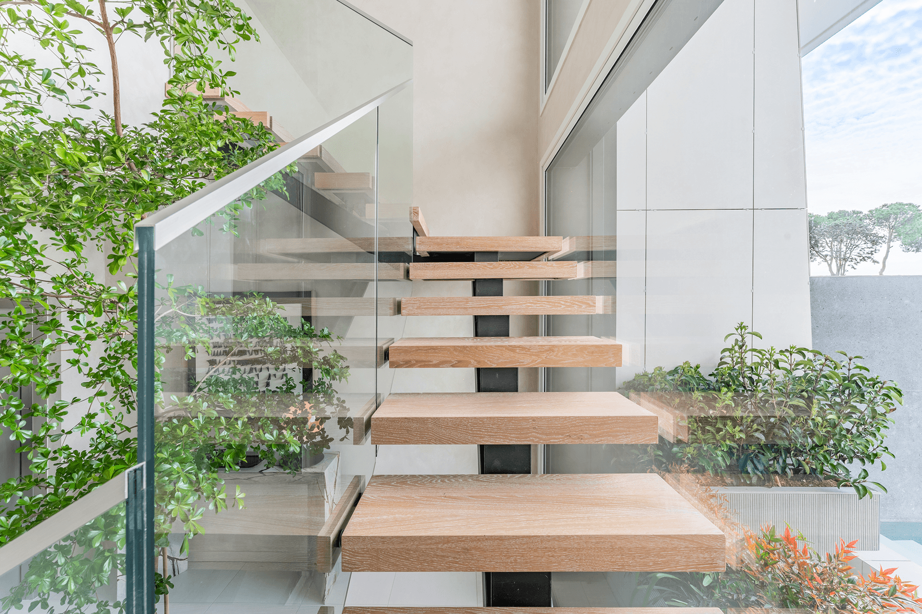 The daytime area, facing south, opens onto a 160 m² terrace-garden with a private pool and seating areas to the north and south. The 40 m² living-dining room integrates with a large open kitchen, while the service area includes a pantry, laundry room, drying area, a service bedroom with a bathroom, and a guest toilet. The double height and large windows allow exceptional brightness and views towards the garden. Read more