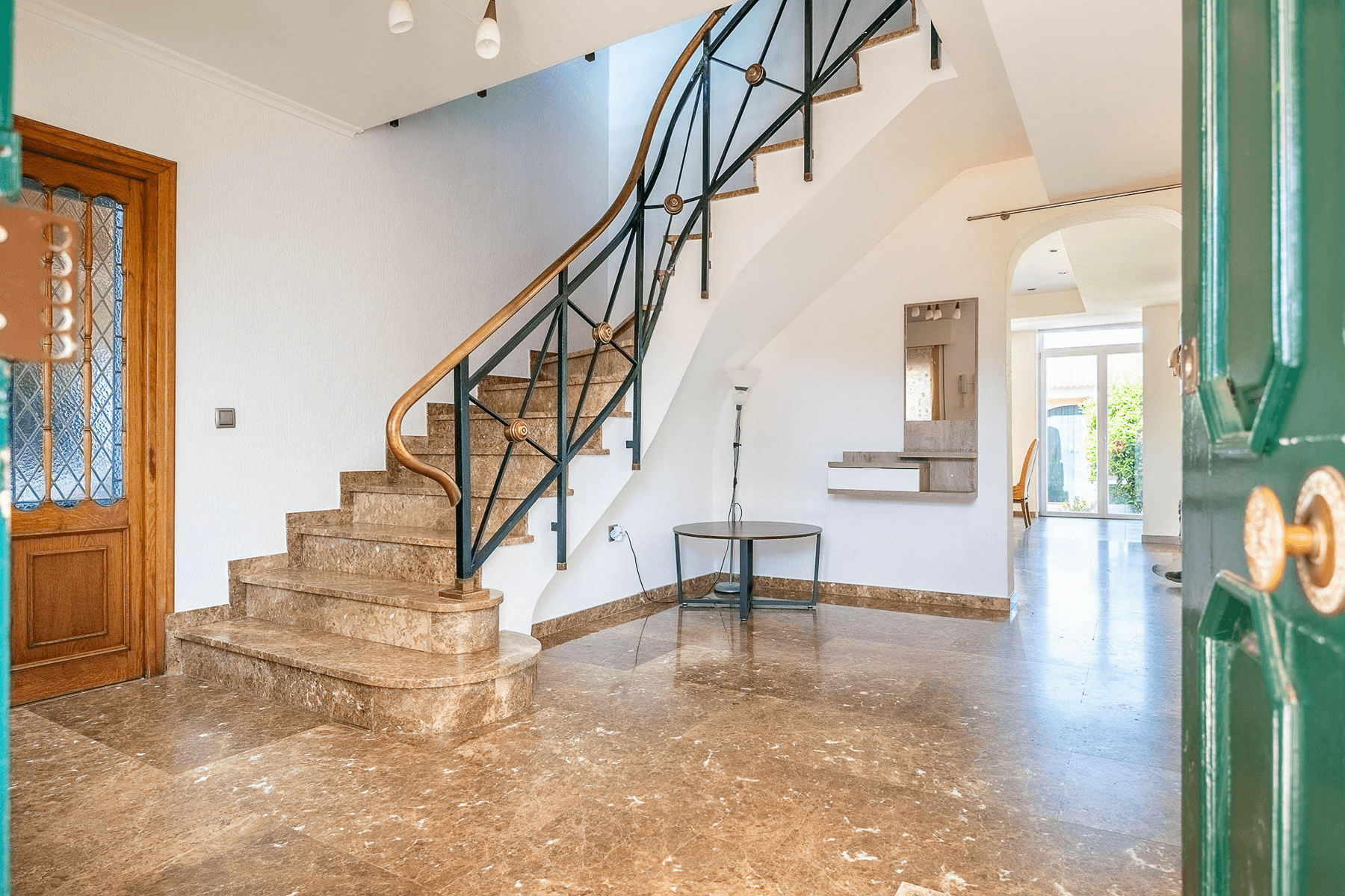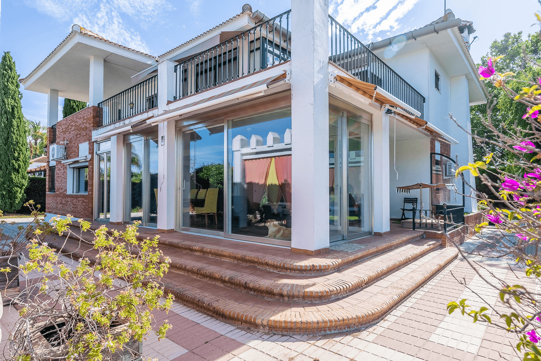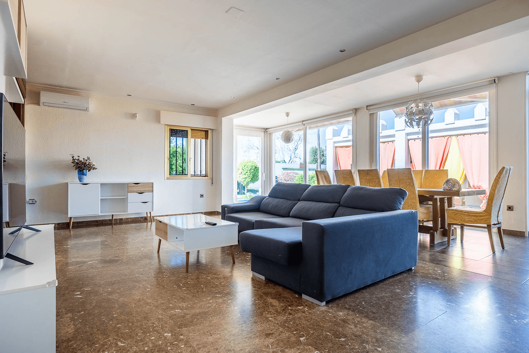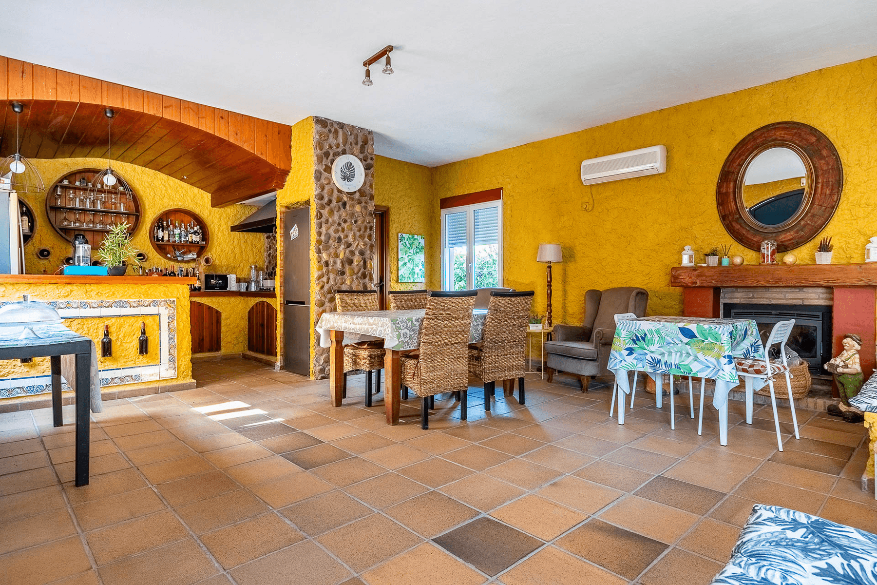 The property, with 485 square meters built on a 2,200 square meter plot, stands out for its elegant and functional design. Upon entering, a spacious hall leads to a bright L-shaped living-dining room with a fireplace and direct access to a porch that connects to the garden.