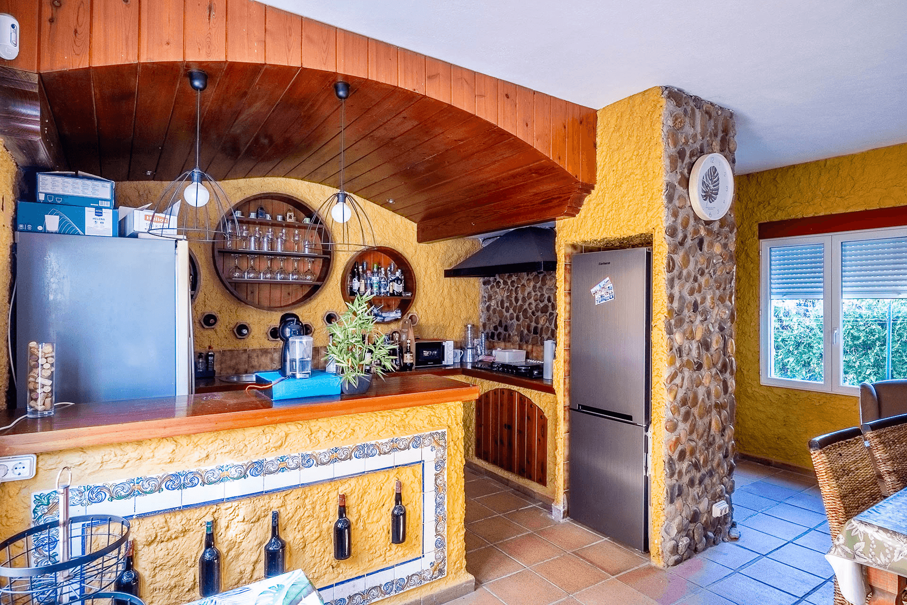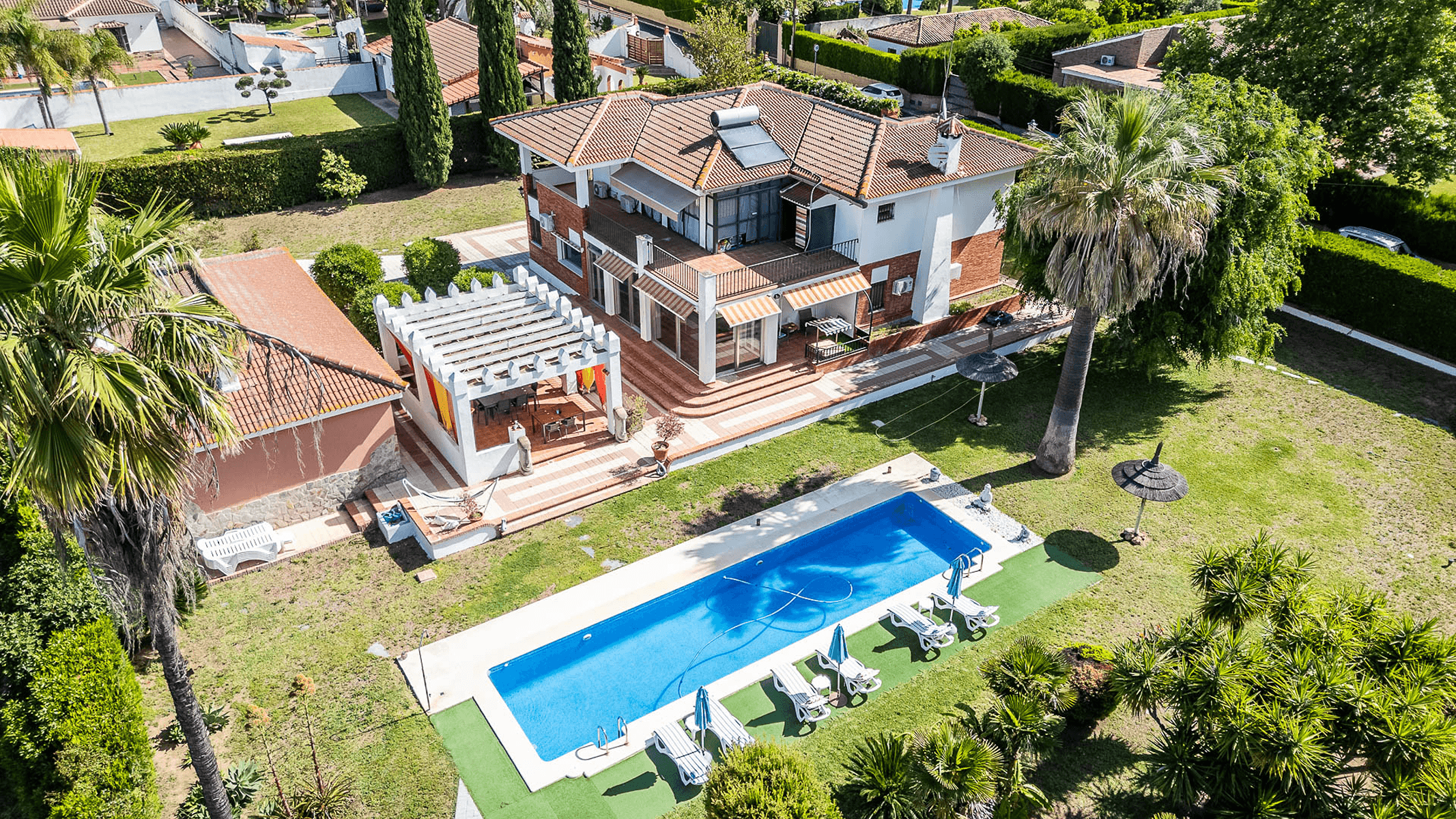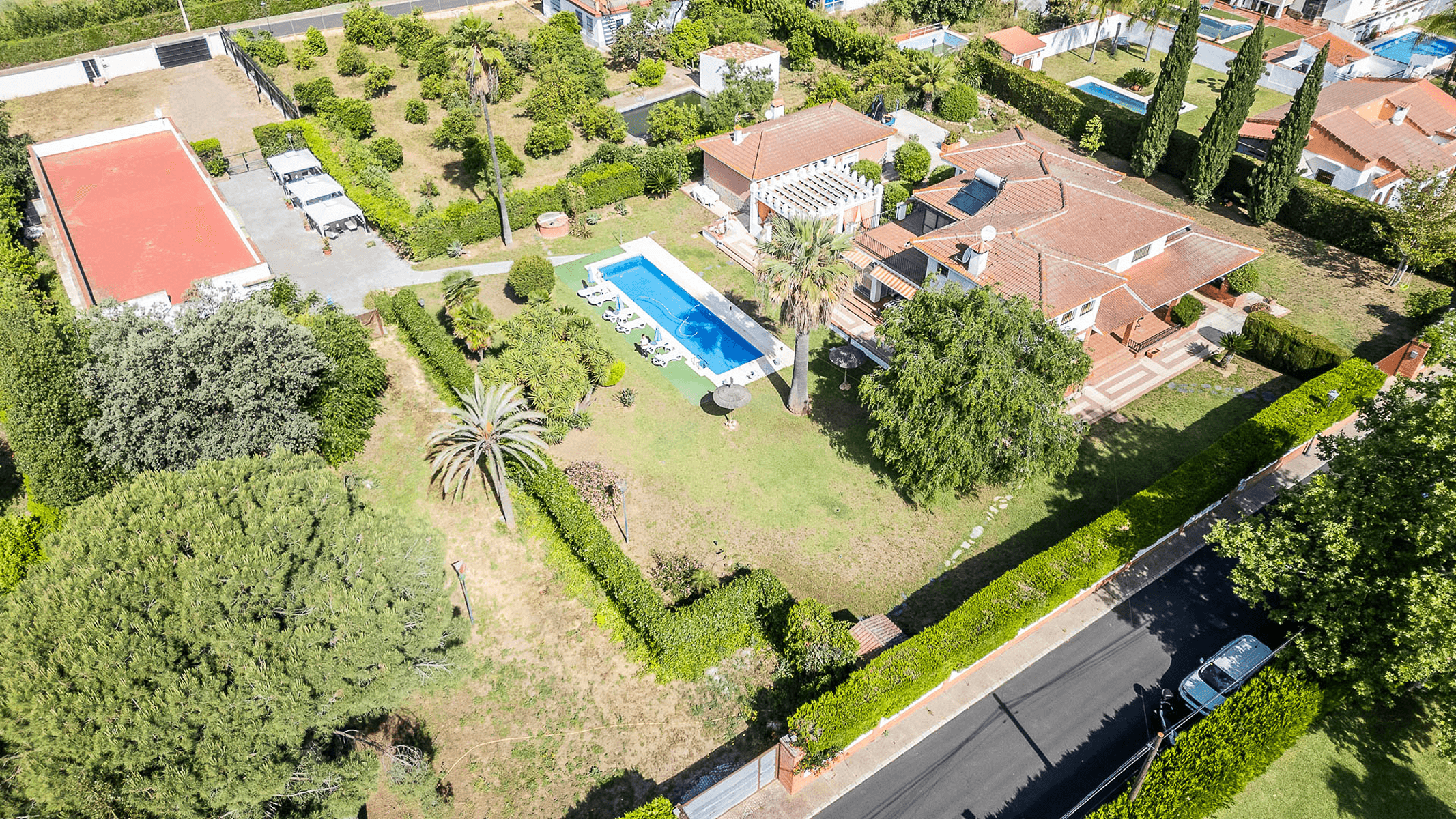 The property, with 485 square meters built on a 2,200 square meter plot, stands out for its elegant and functional design. Upon entering, a spacious hall leads to a bright L-shaped living-dining room with a fireplace and direct access to a porch that connects to the garden.