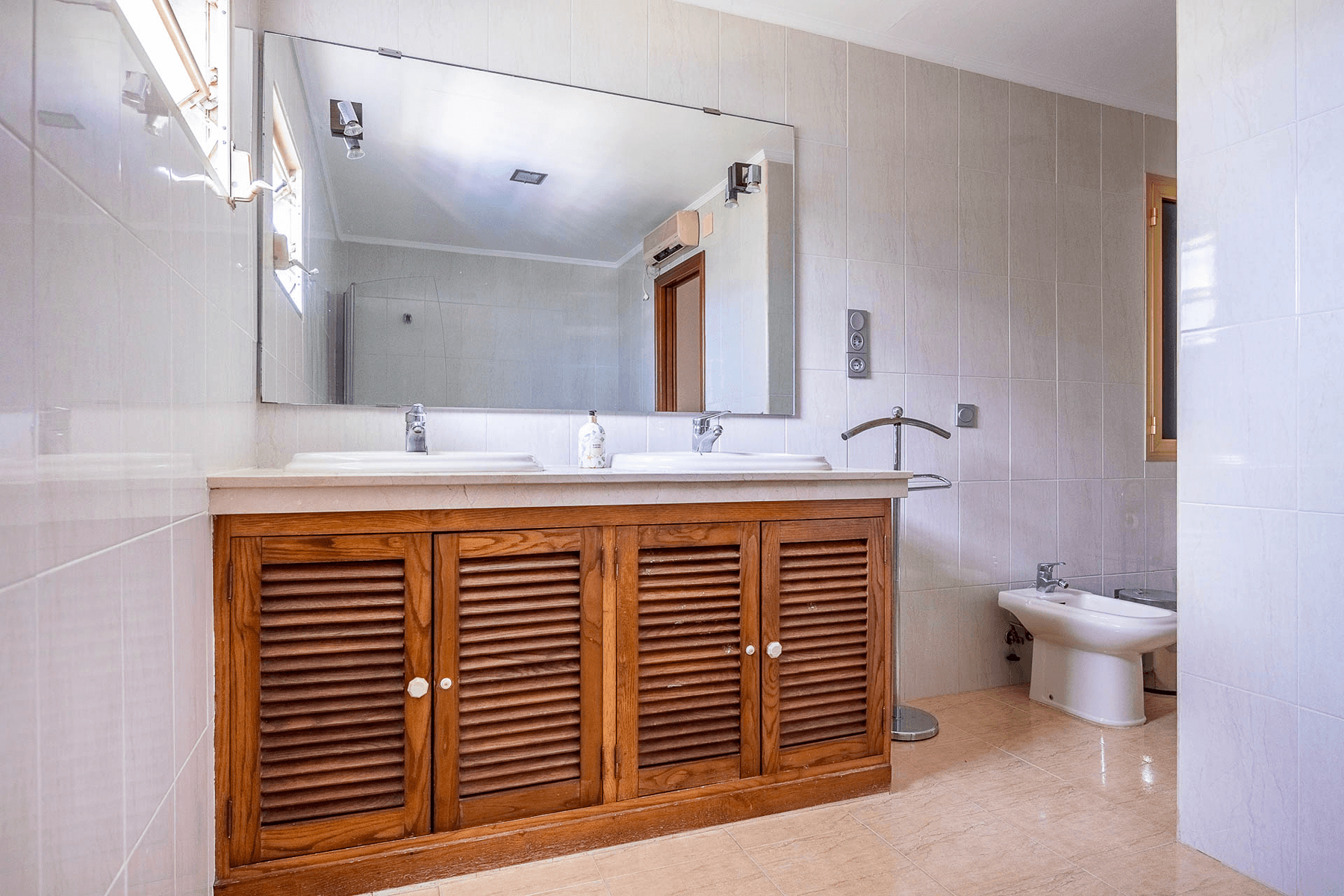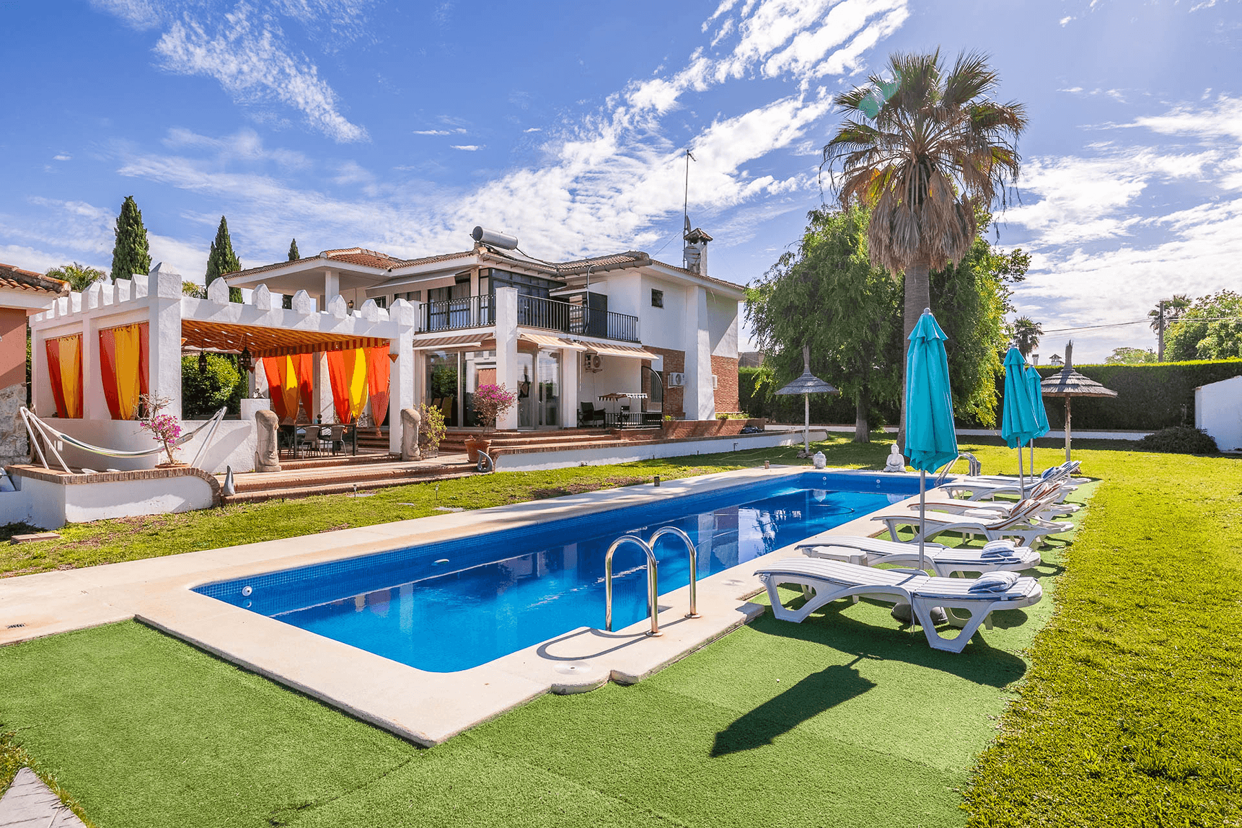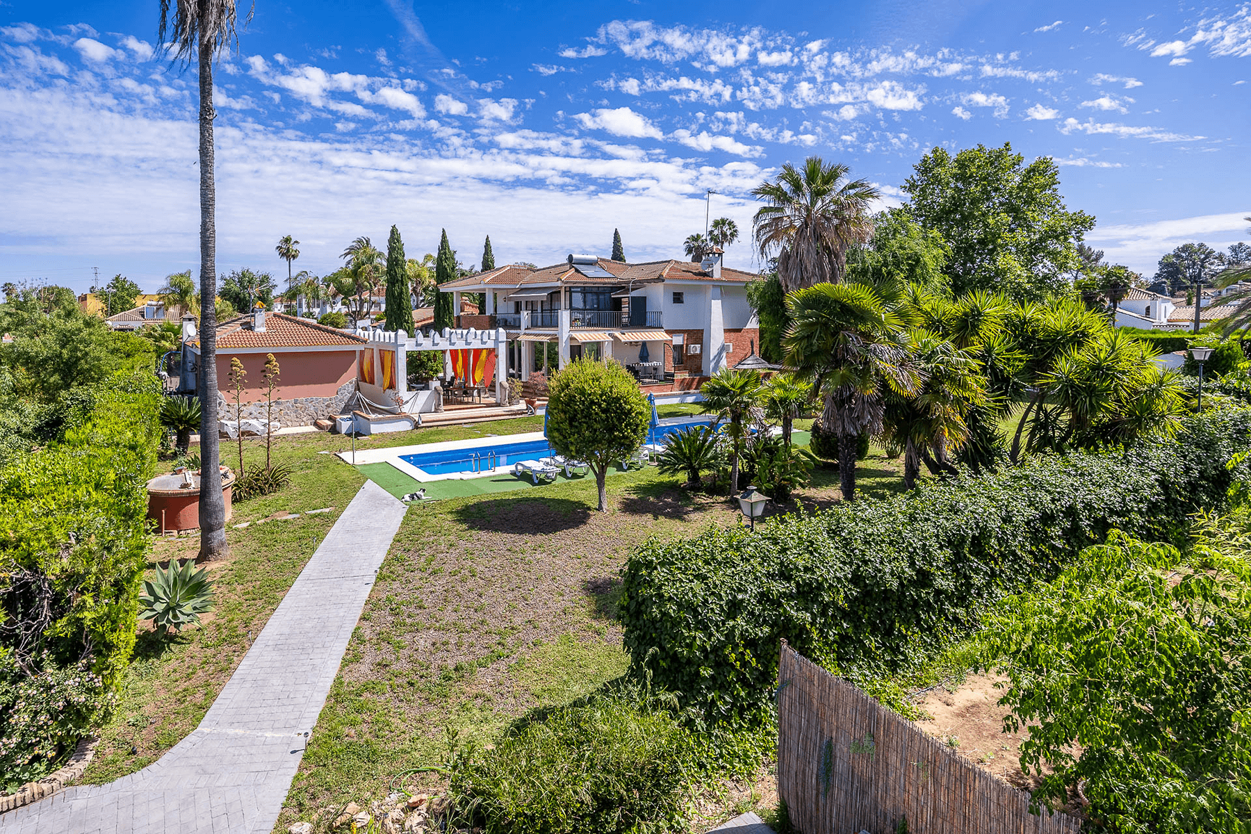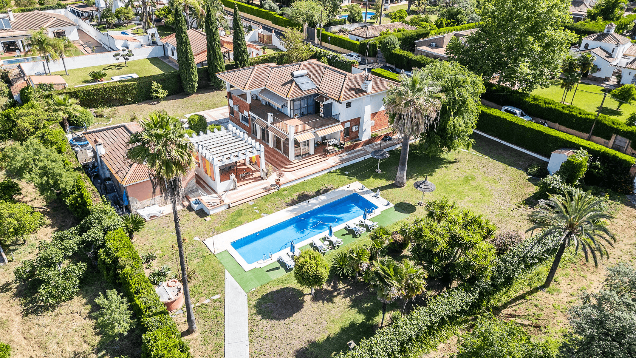 The property, with 485 square meters built on a 2,200 square meter plot, stands out for its elegant and functional design. Upon entering, a spacious hall leads to a bright L-shaped living-dining room with a fireplace and direct access to a porch that connects to the garden.