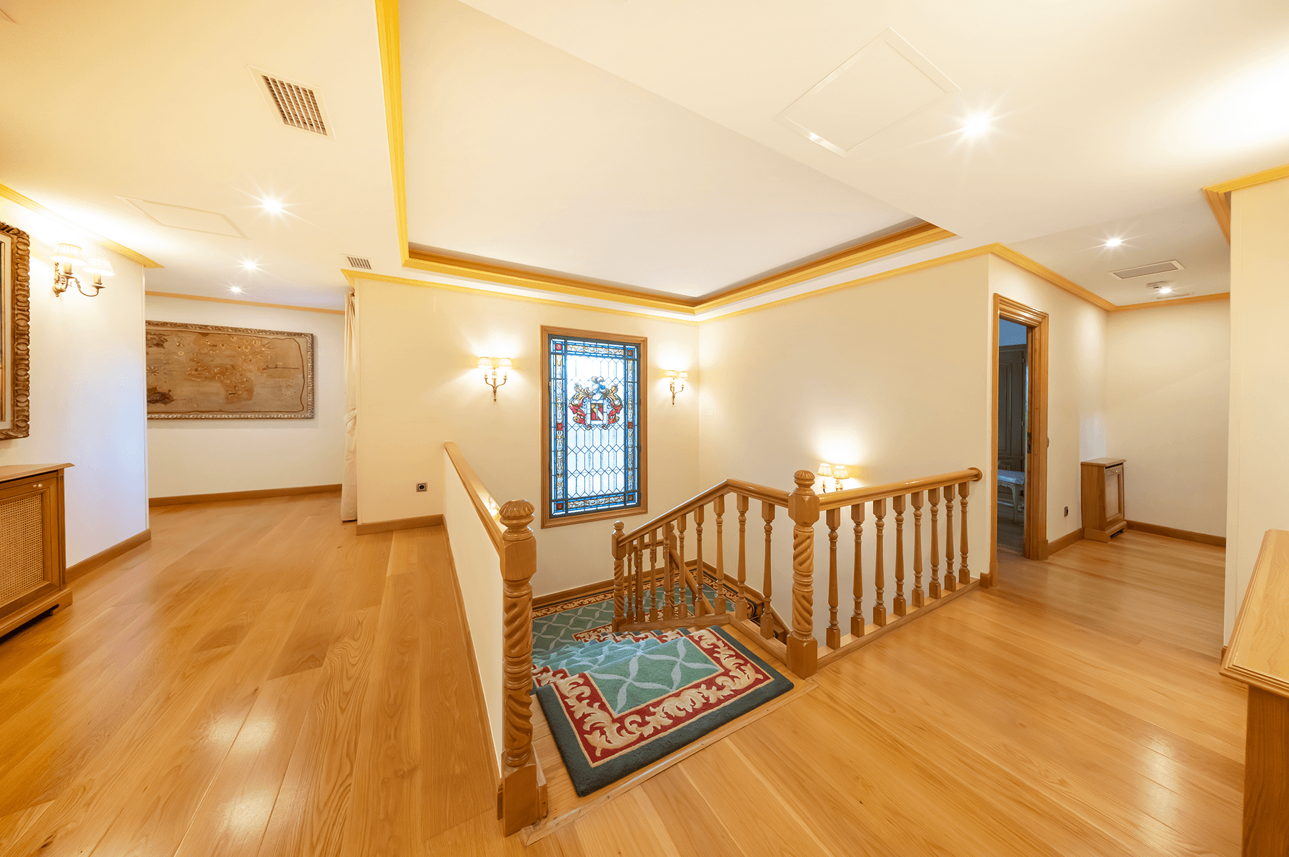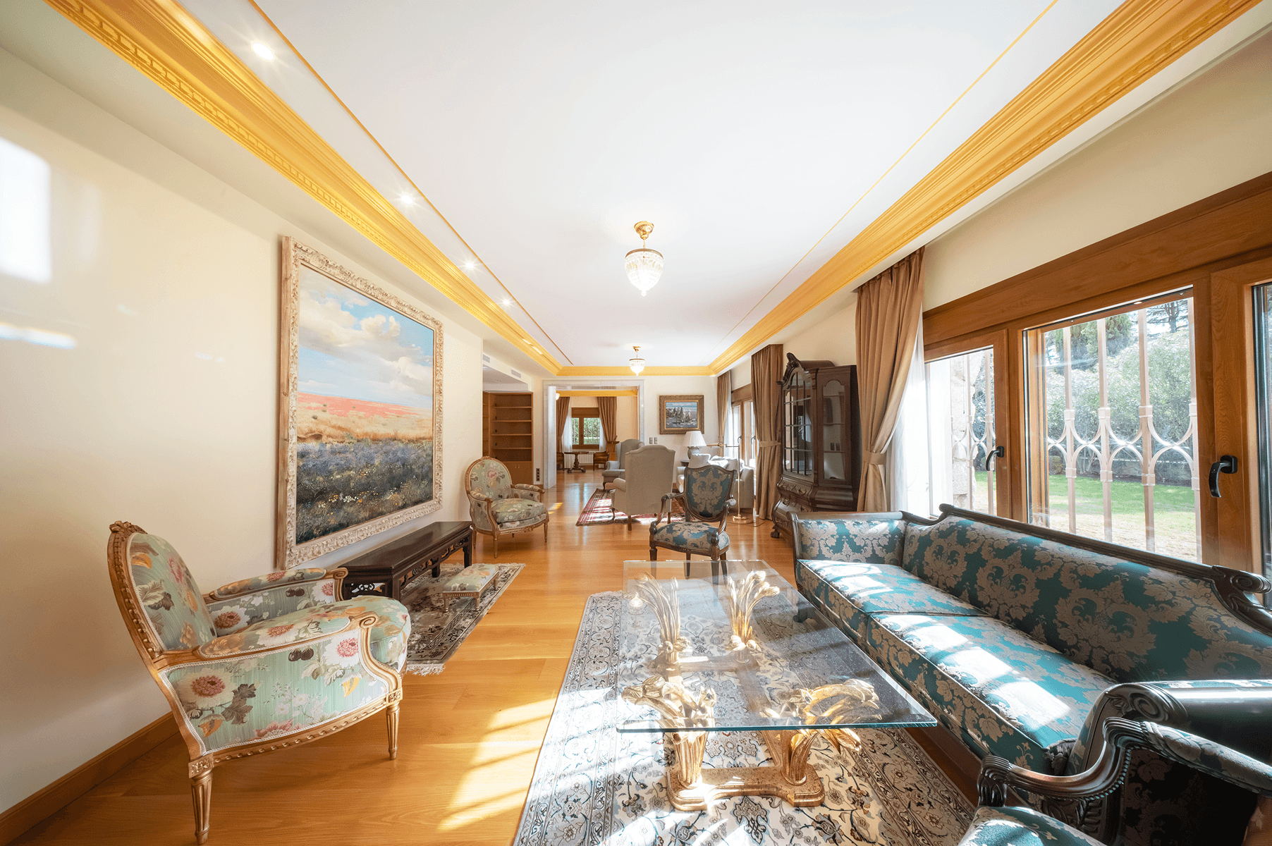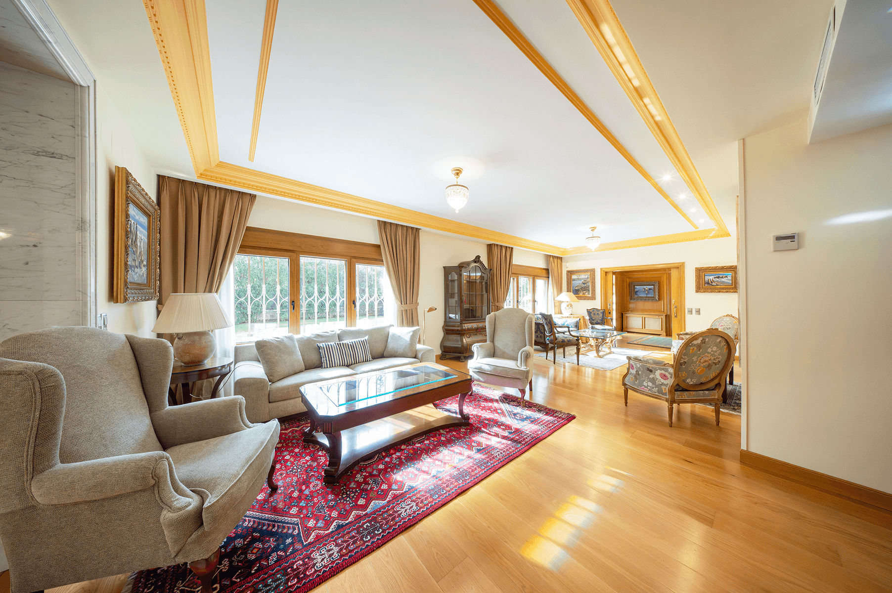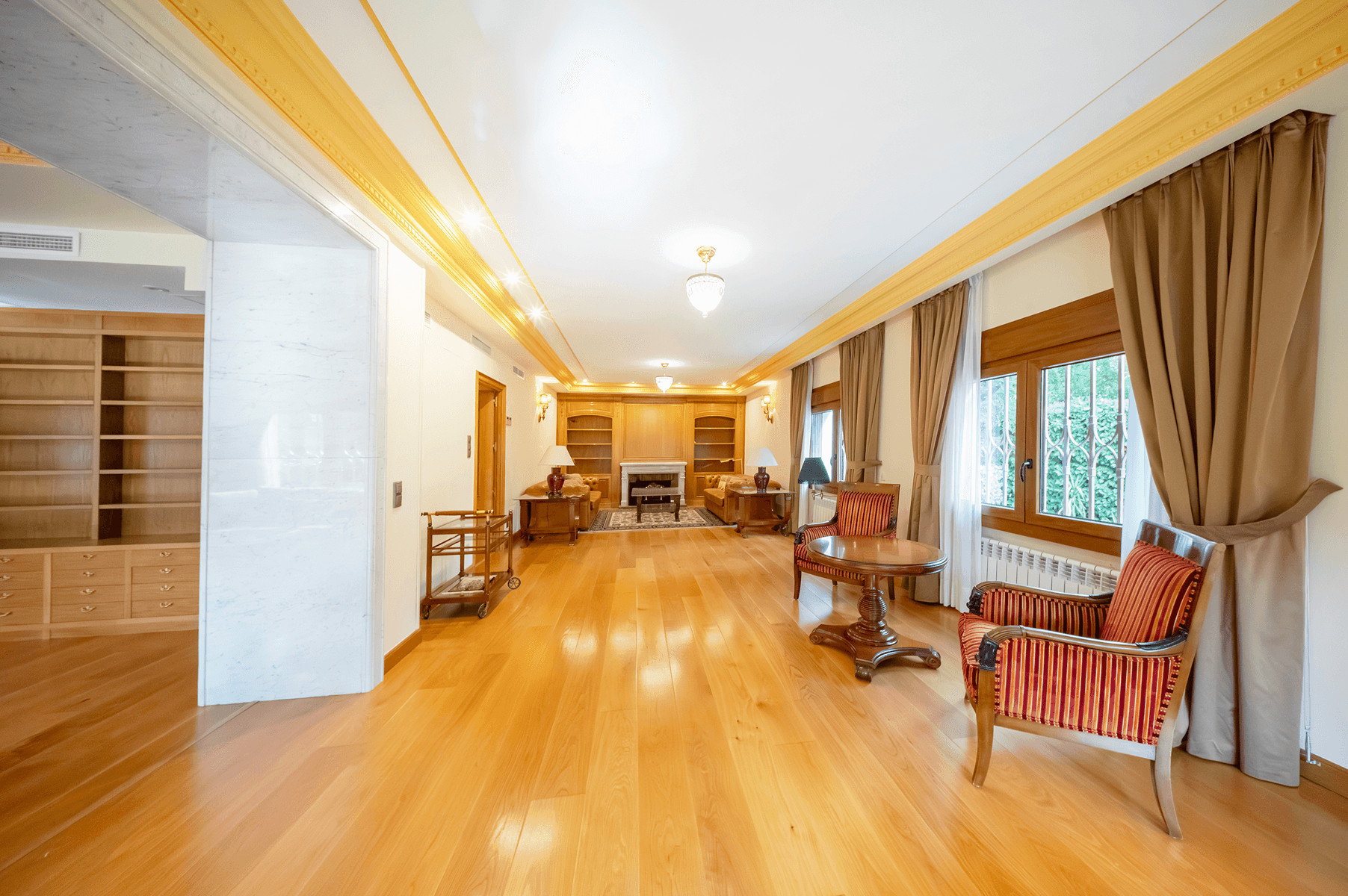On the main floor, there are various spaces designed to enjoy family life: a large double living room, a cozy library with a fireplace, and an elegant formal dining room.