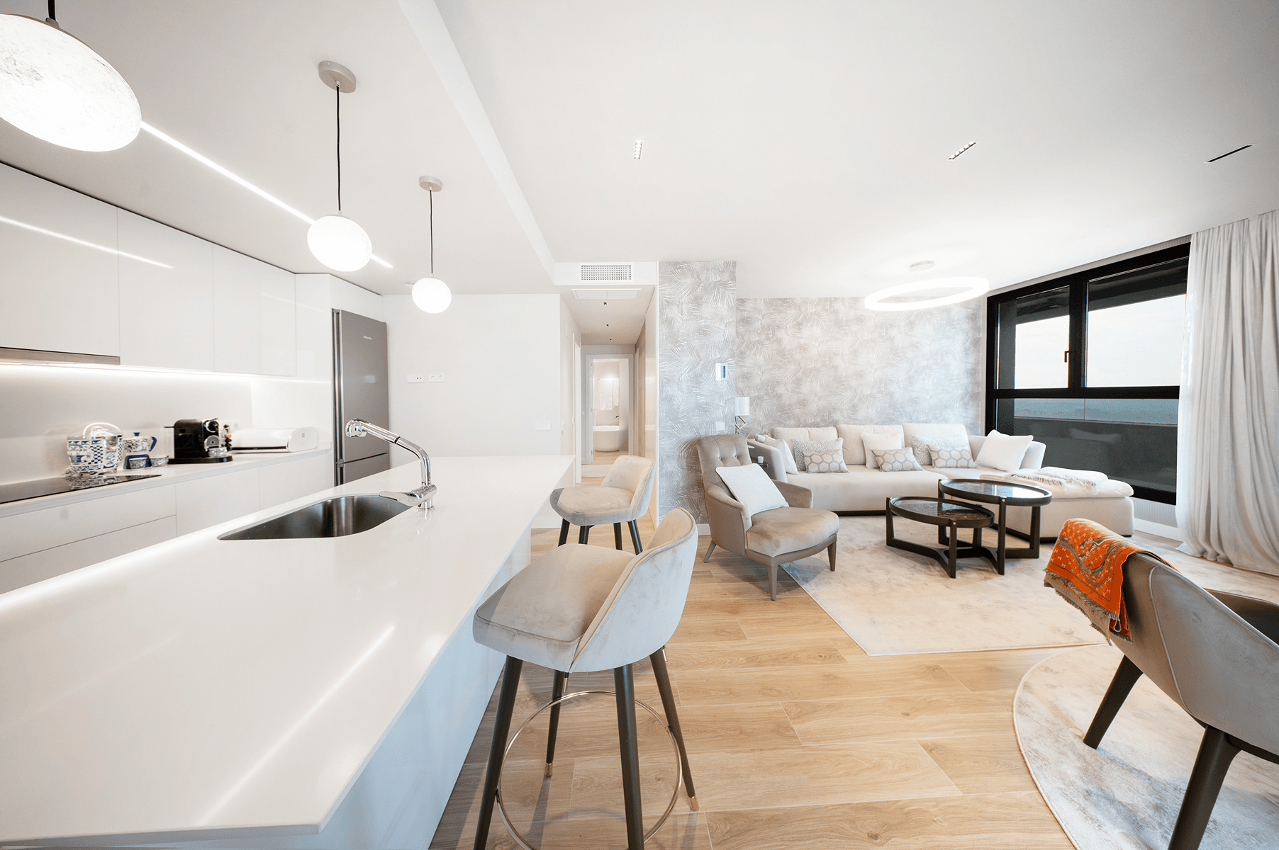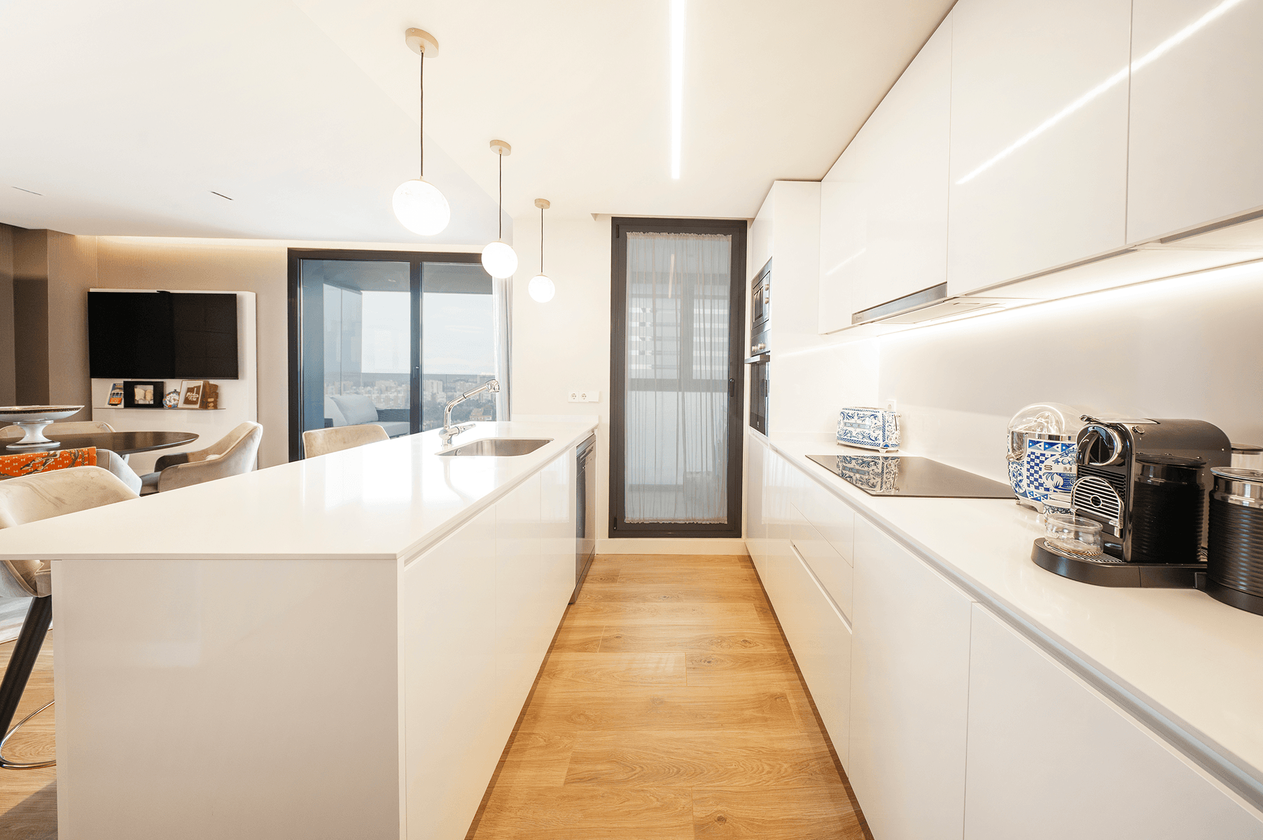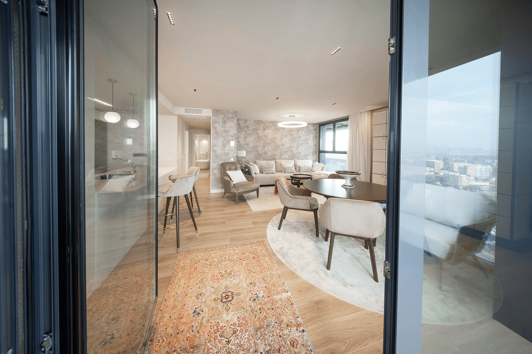 With 150 m², the apartment offers a spacious and bright living room with access to a private terrace of 10 m² with unobstructed views of the city and the mountains. The open-plan designer kitchen is equipped with premium appliances, custom furniture, and also has a practical laundry area. Read more