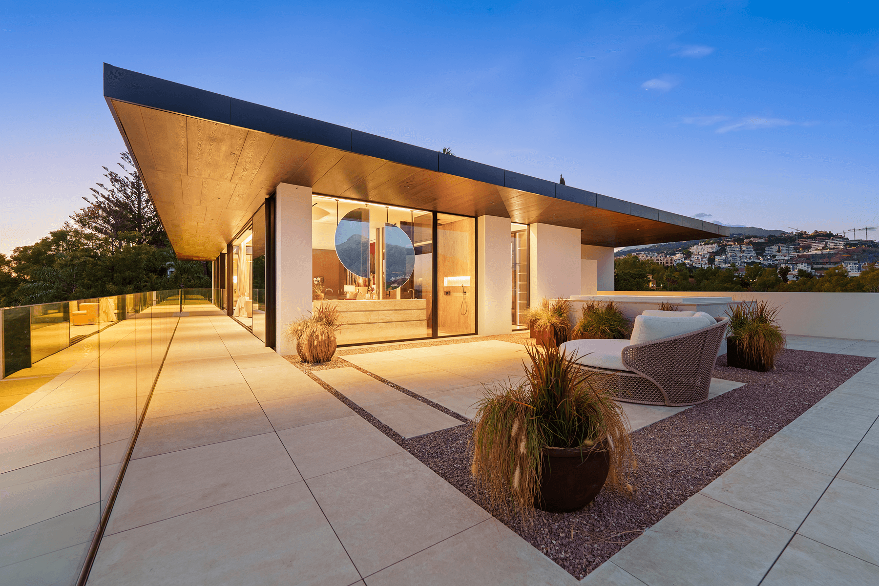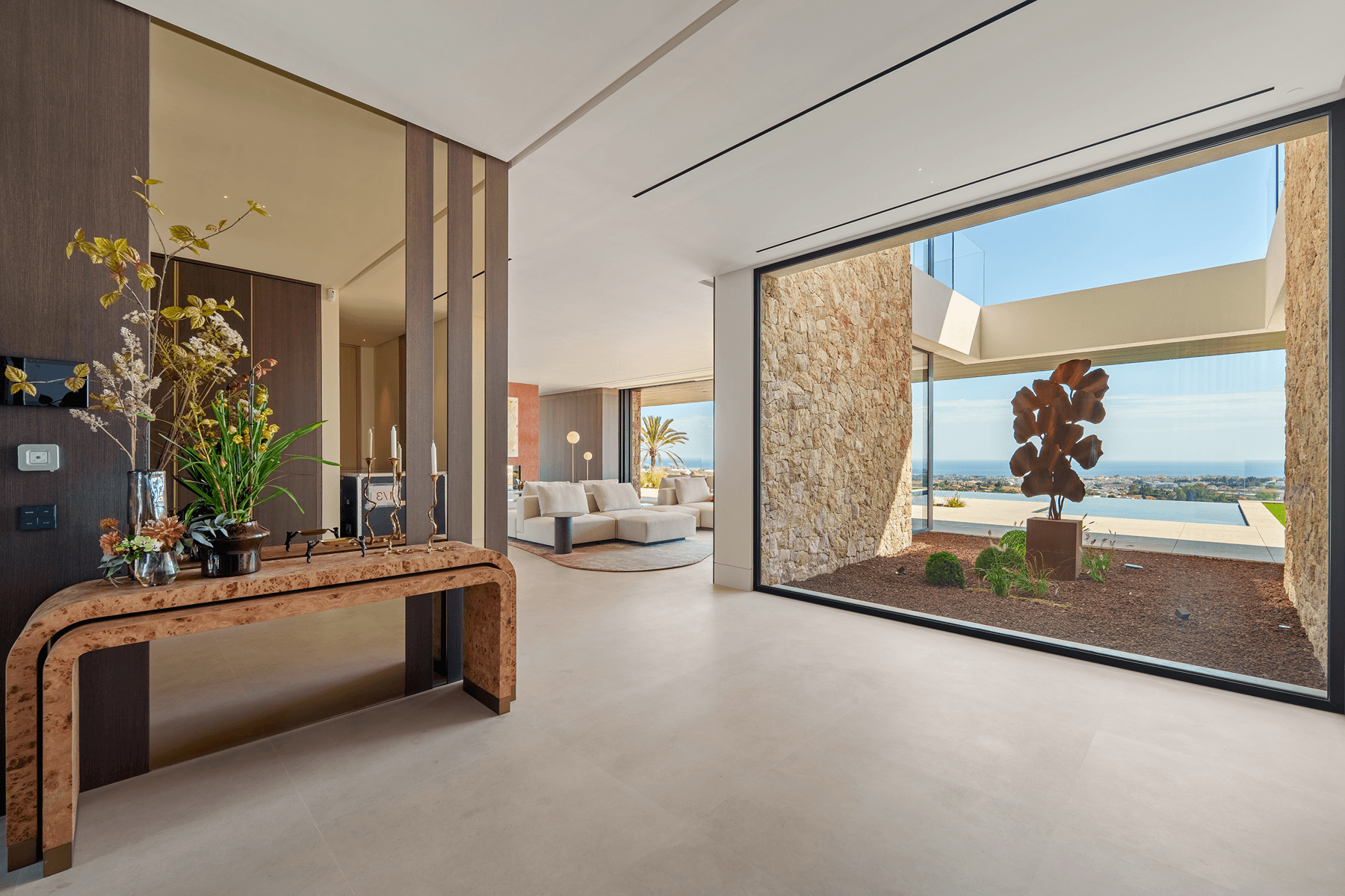 The journey to this house begins on the pretty tree-lined roads of El Herrojo Alto, a gated and secure urbanization, which leads you directly to its imposing entrance. A wide access road welcomes you to a modern design home with very well integrated natural materials.