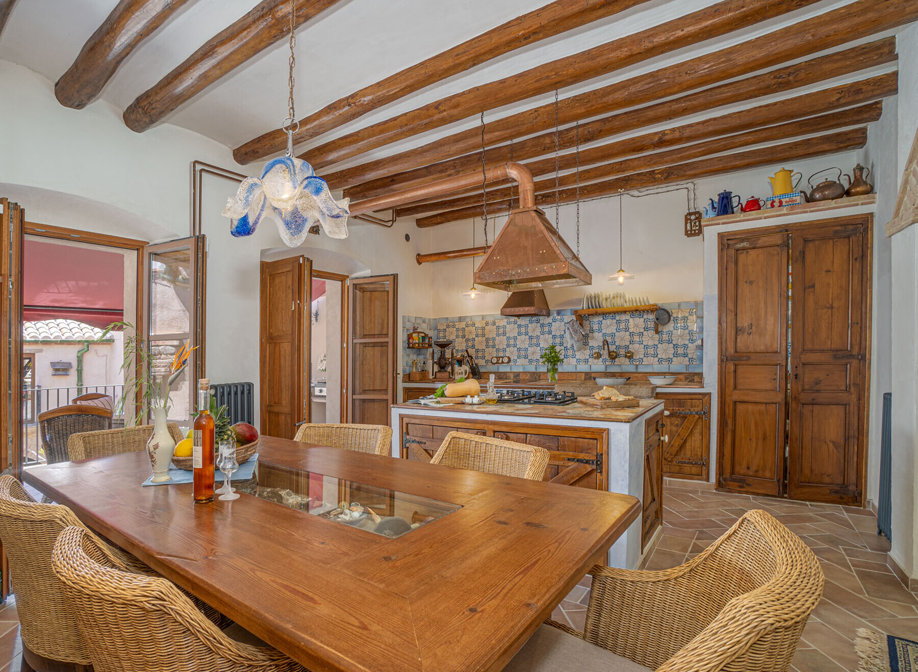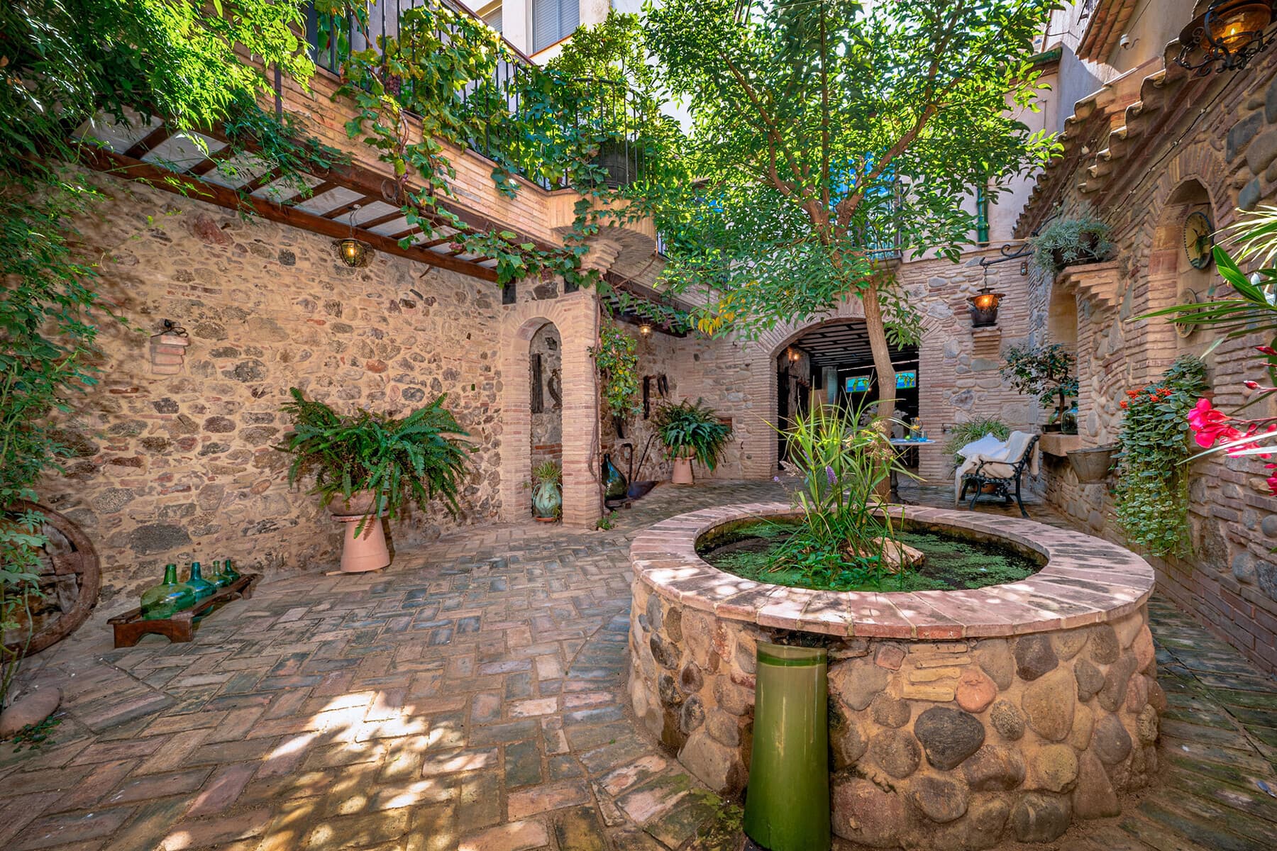 In the historic center of Castelló d'Empúries, just a few minutes from the beaches of the Costa Brava, is this exceptional town house from 1887. Two harmoniously united buildings surround a protected courtyard with fountain, water lily pond and a pleasant summer dining room: the real heart of the property.