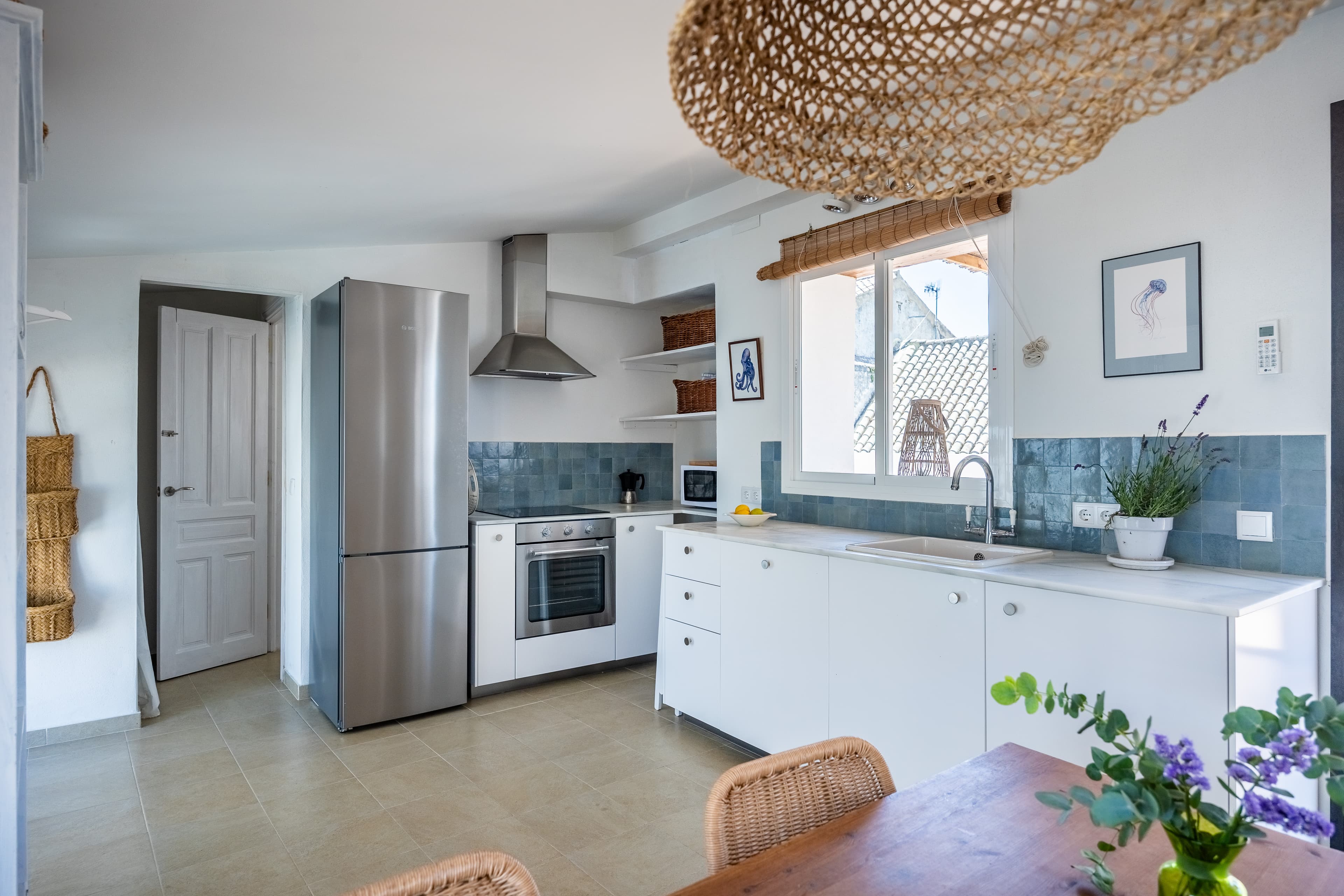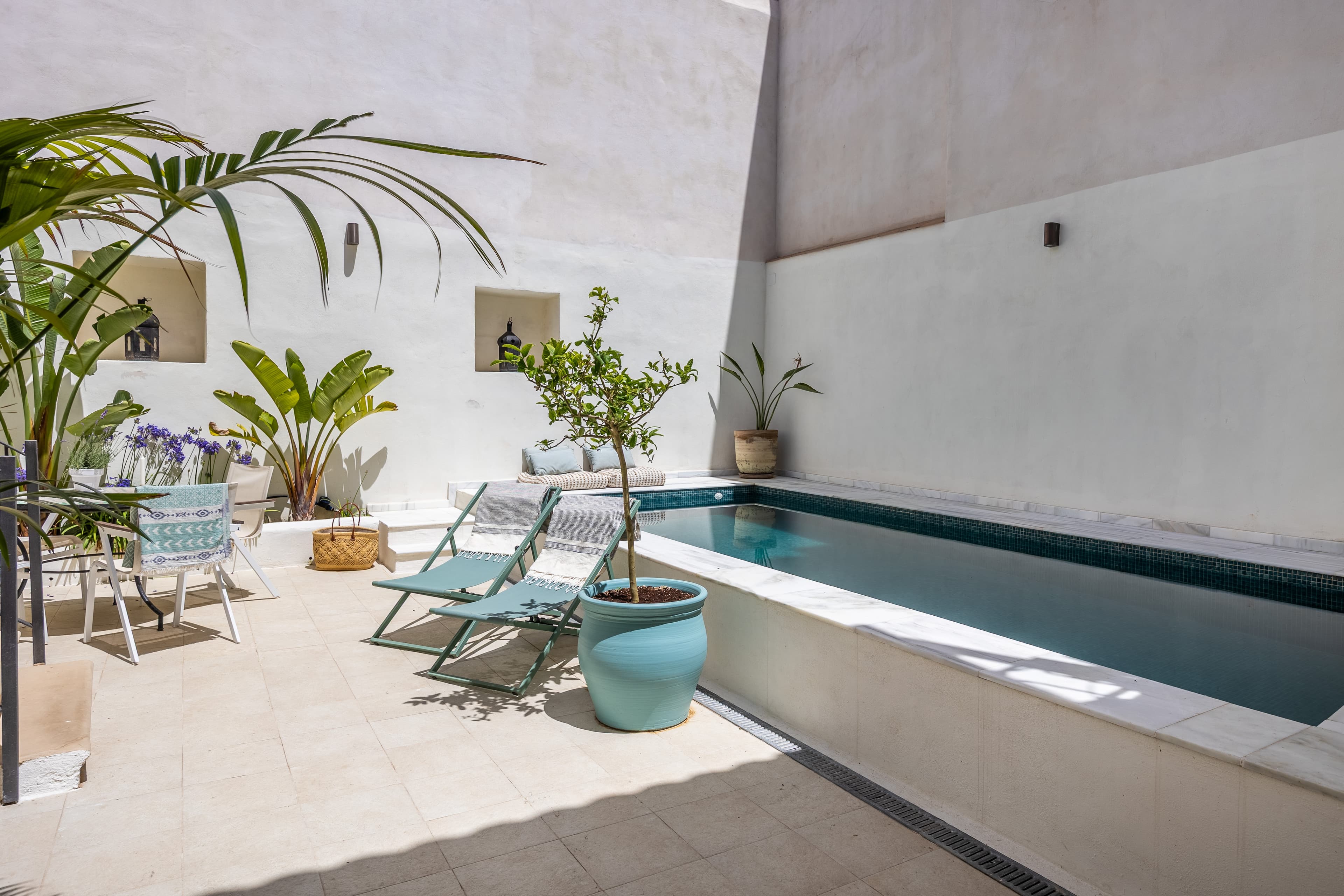The main house is organized around the central courtyard with lemon trees and bougainvillea. On the ground floor, there are a kitchen and dining area, a courtyard with aromatic plants, a living room with integrated work area, and access to a second patio with exotic vegetation and a private saltwater pool. The upper floor features three bedrooms, two full bathrooms, an additional room with the option of a dressing room, office, or game room, and a terrace overlooking the courtyard. Read more