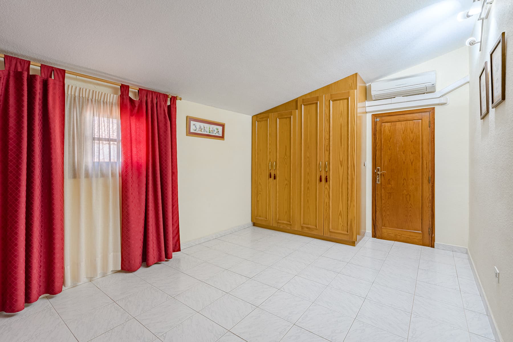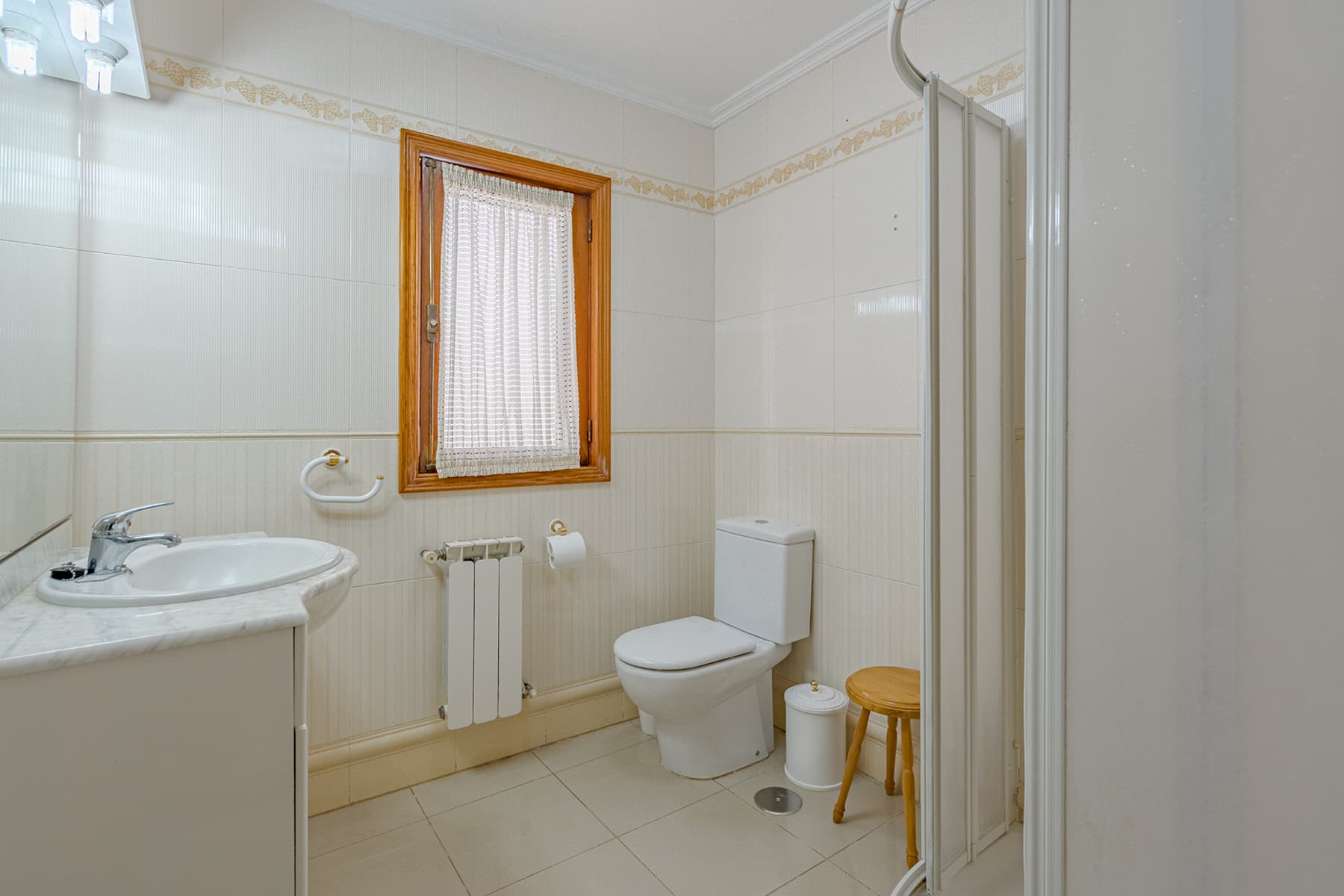 On the ground floor there is a bright living room with large windows and a space dedicated to library or study. The kitchen, equipped with a central island, offers direct access to the outdoor porch. A hallway distributes access to three bedrooms and a full bathroom, highlighting one of the bedrooms that includes an en suite bathroom.