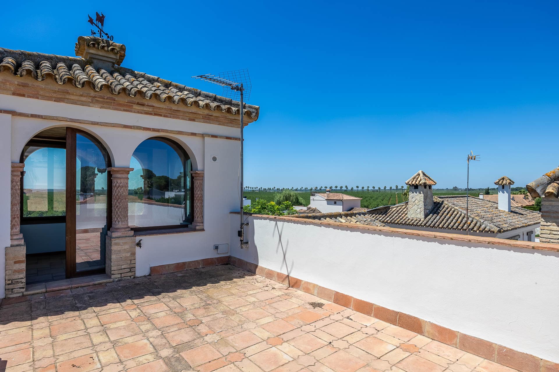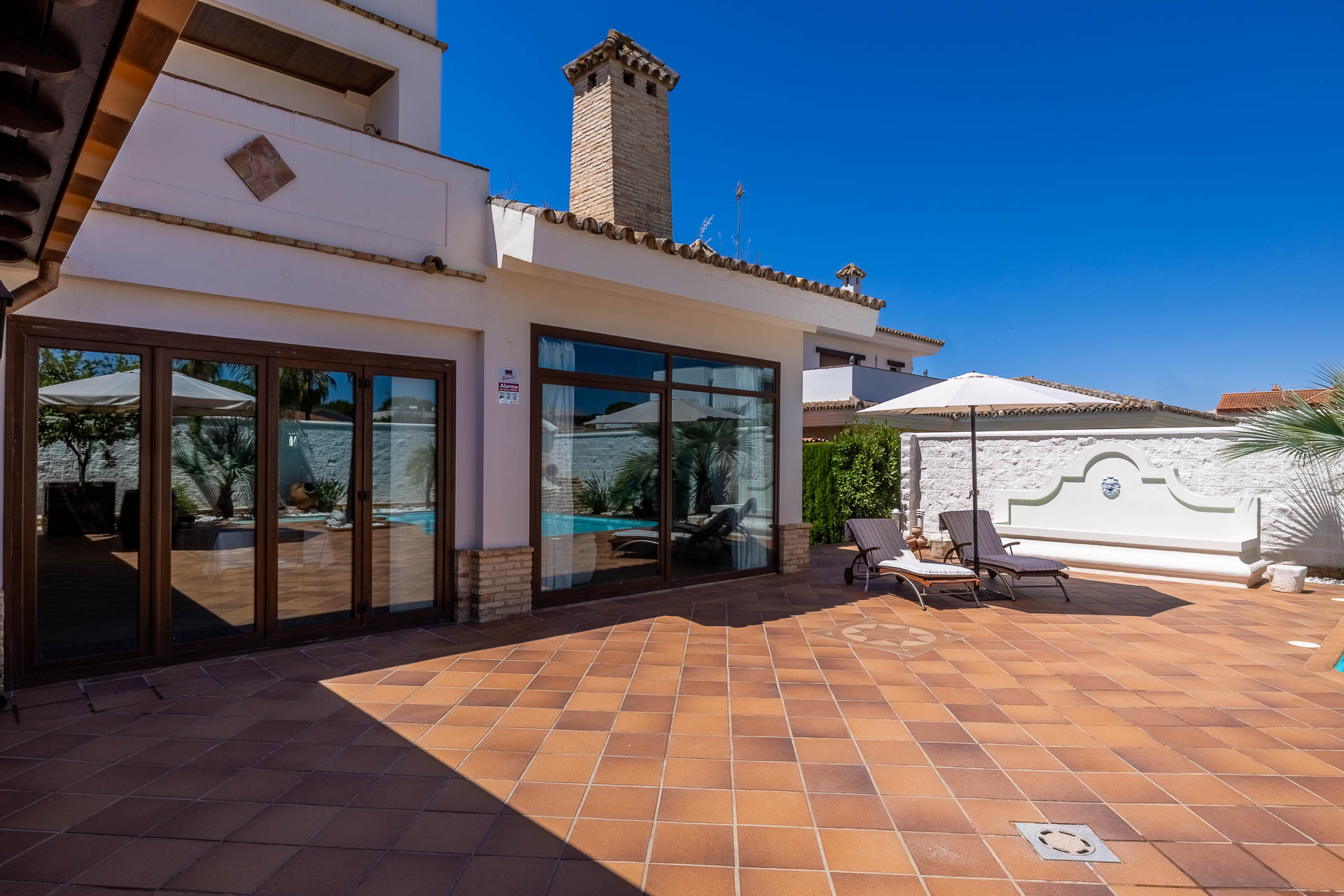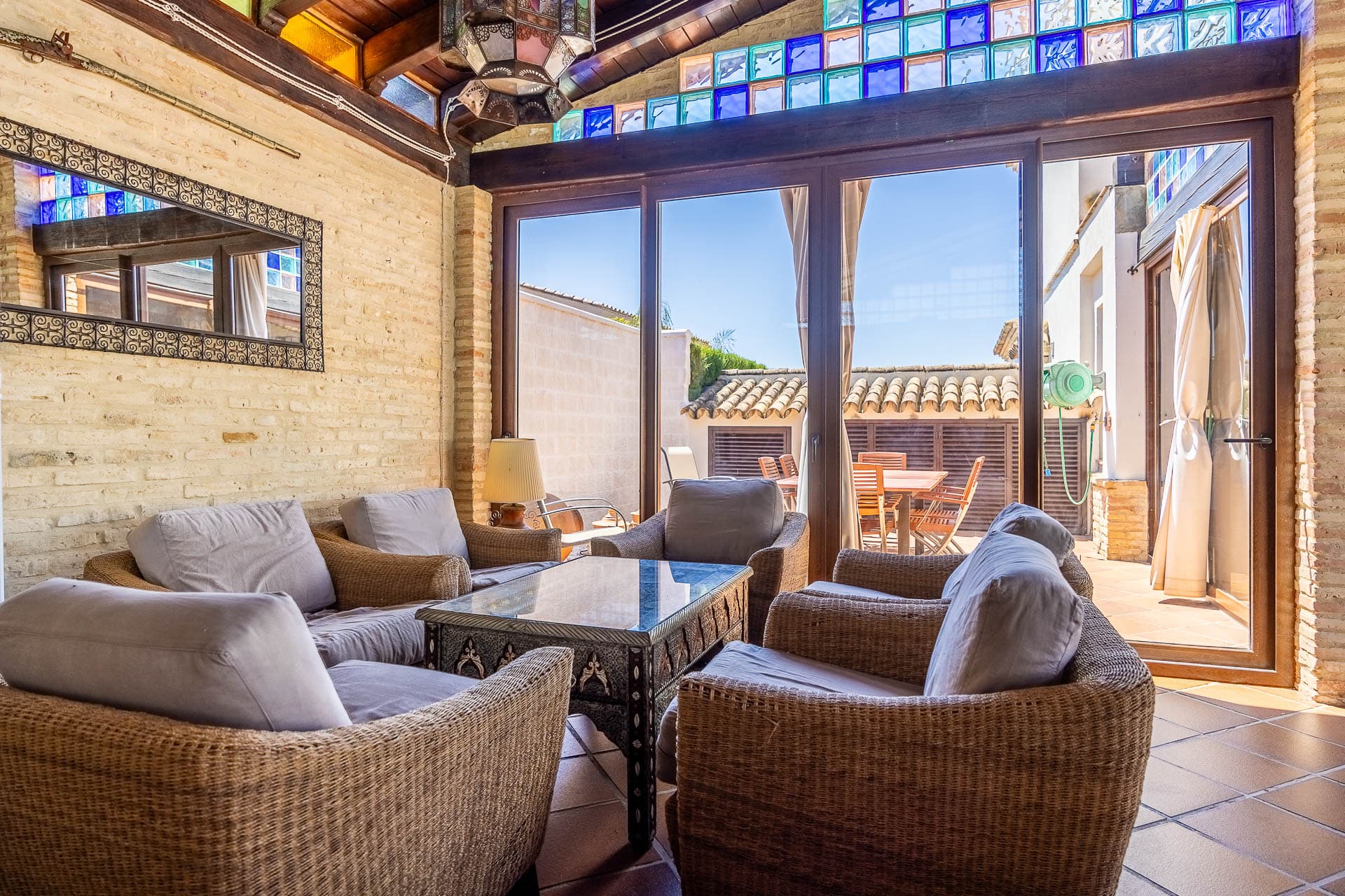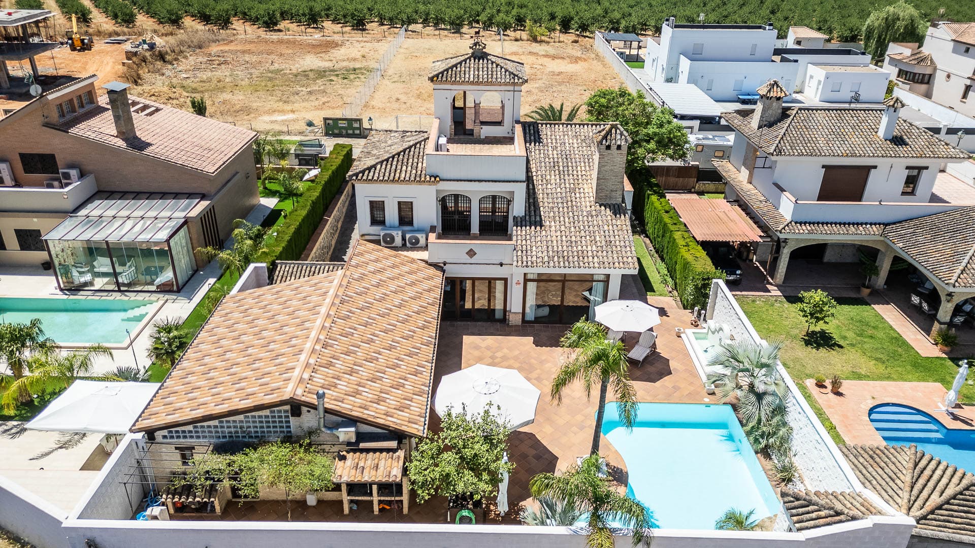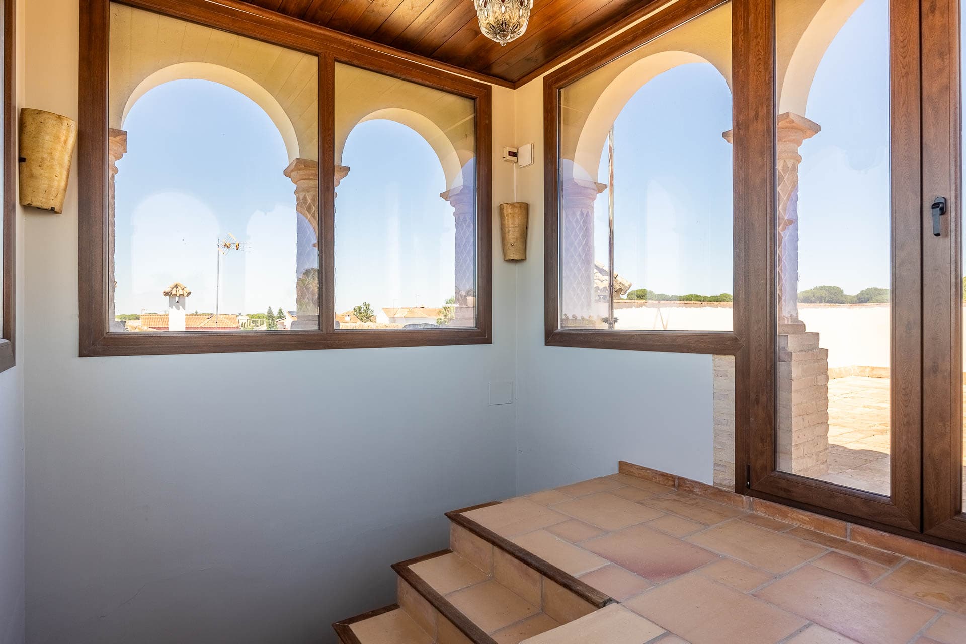 Detached chalet of 538 square meters built on a plot of 782 square meters, located in the prestigious private urbanization of La Juliana, in a privileged environment surrounded by pine trees and centuries-old holm oaks, just 15 km from Seville. The house is distributed over four levels: basement, ground floor, first floor, and second floor with a tower and solarium.