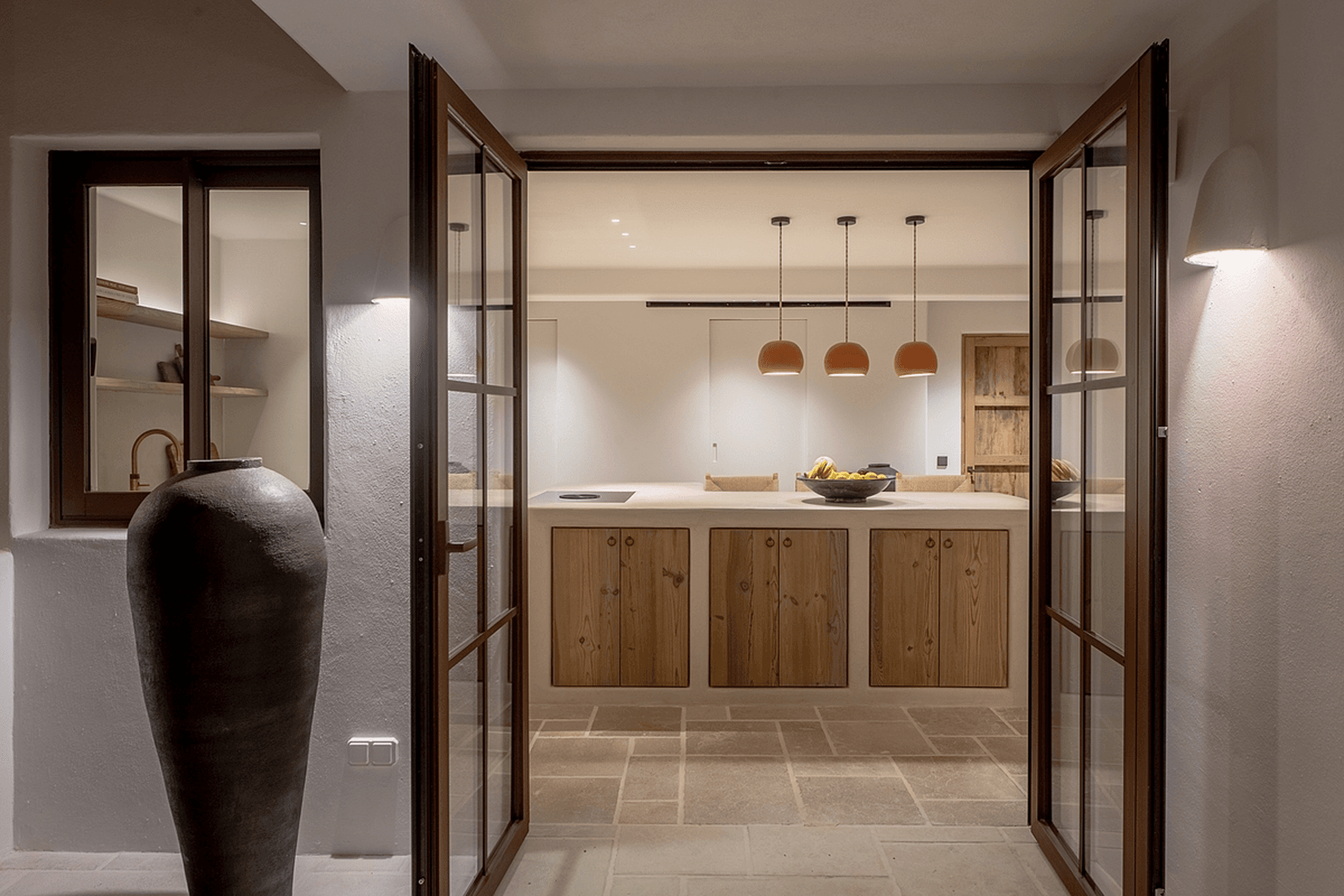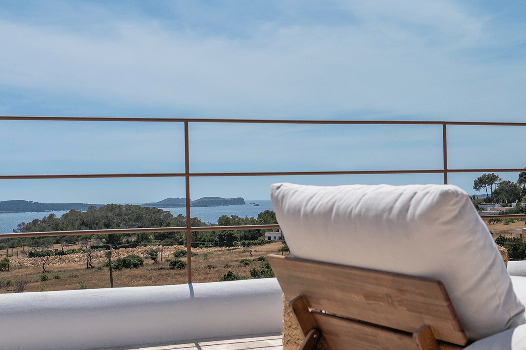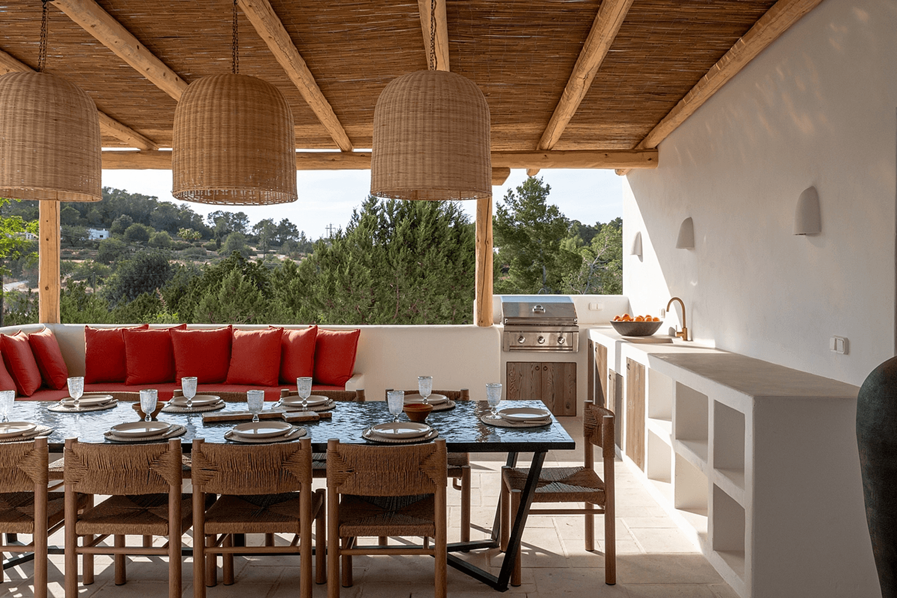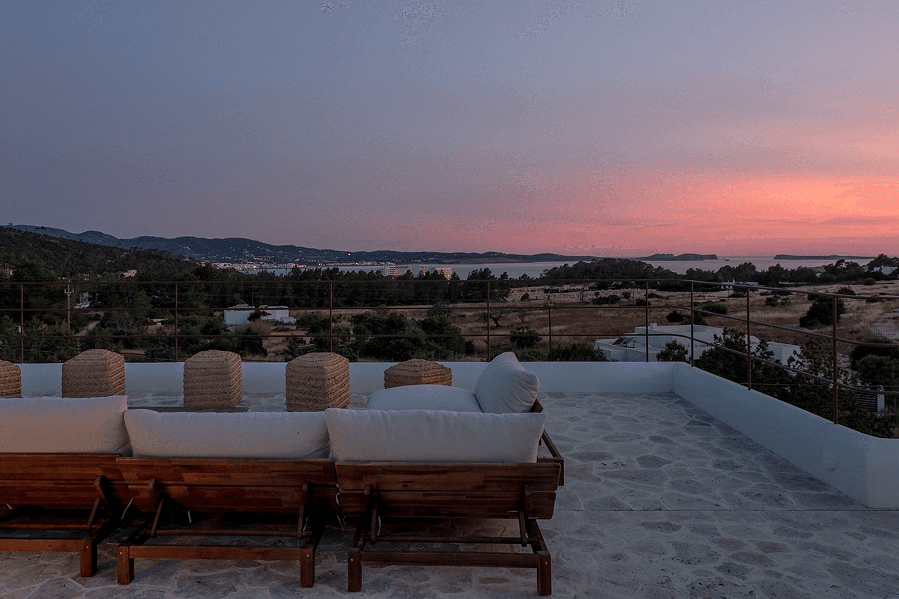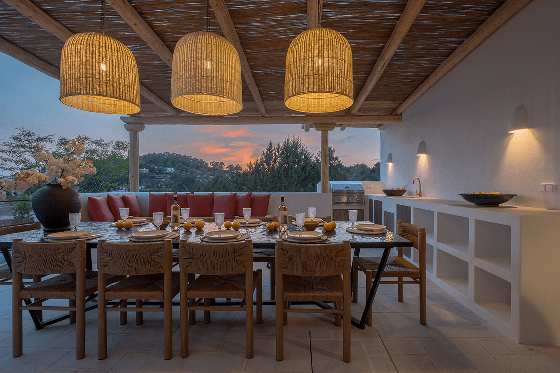 Ibiza-style villa that combines elegance and comfort in Ibiza, located in a quiet area with breathtaking views of the sea and mountains. The residence has a built area of 327 m² and is situated on a 2200 m² plot, offering a sophisticated design and quality construction.