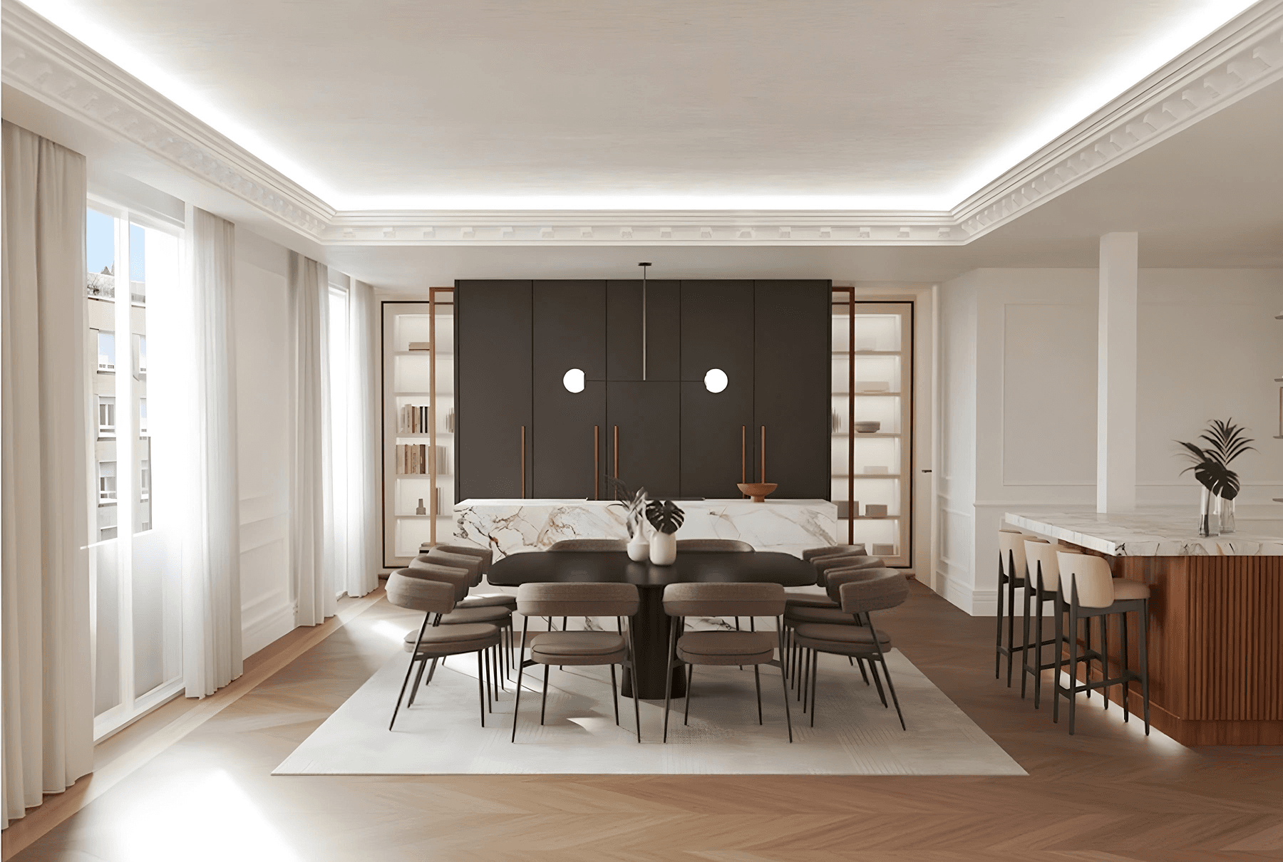 The residence, located on a bright fifth floor and with an approximate area of 487 m², is a unique piece that combines traditional architecture with contemporary design and meticulous attention to detail in a balanced way. Its spacious entrance hall leads to a majestic main living room bathed in abundant natural light, as well as a designer kitchen equipped with Gaggenau appliances. Read more