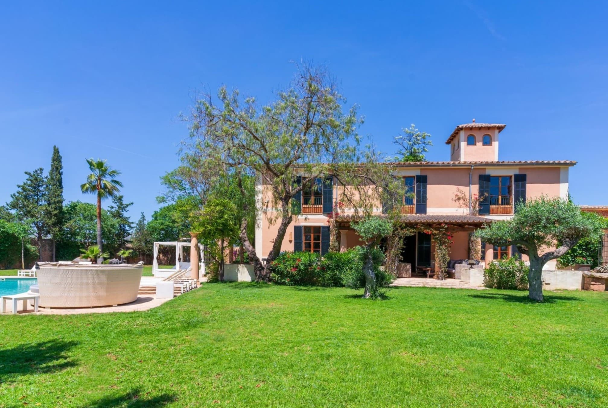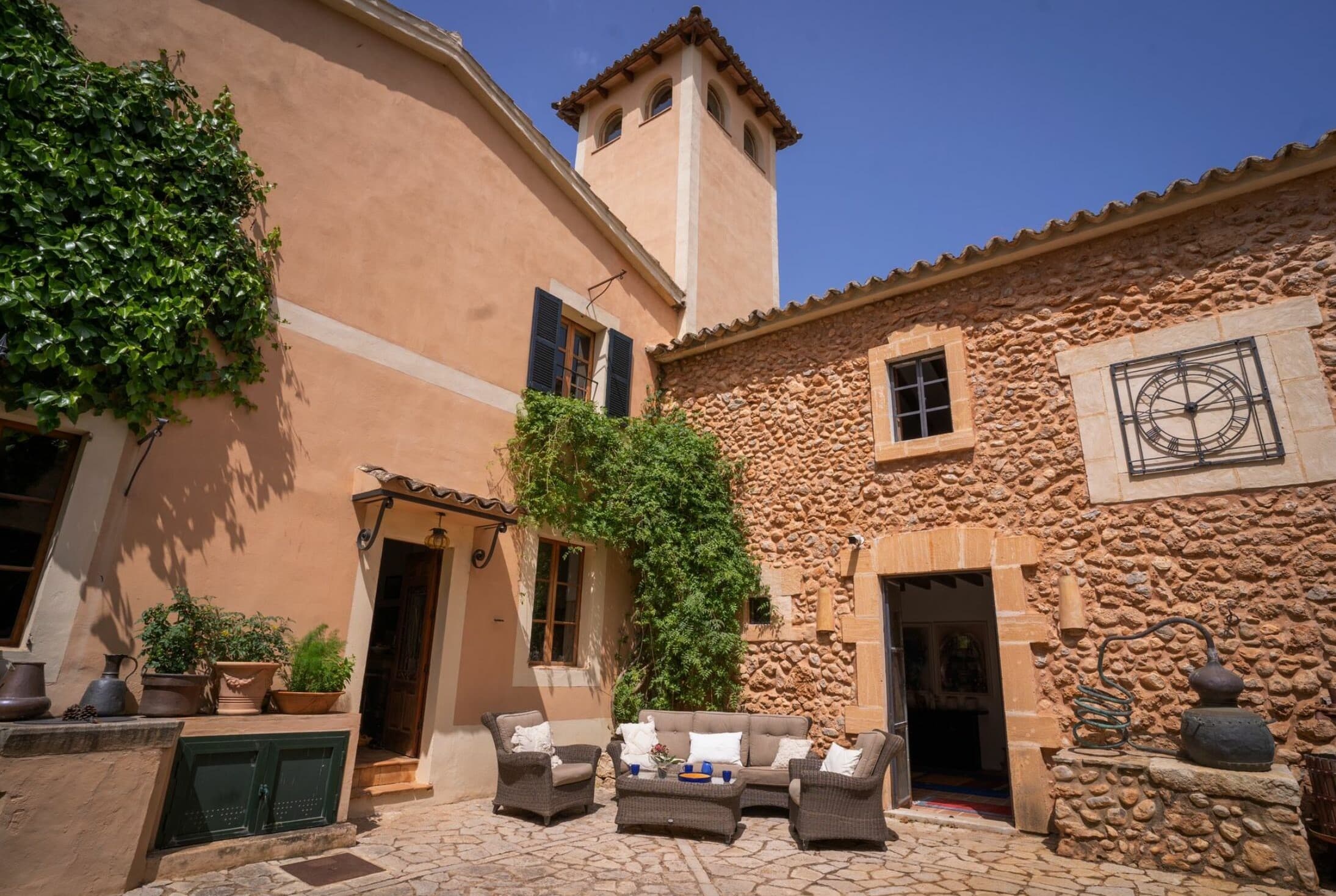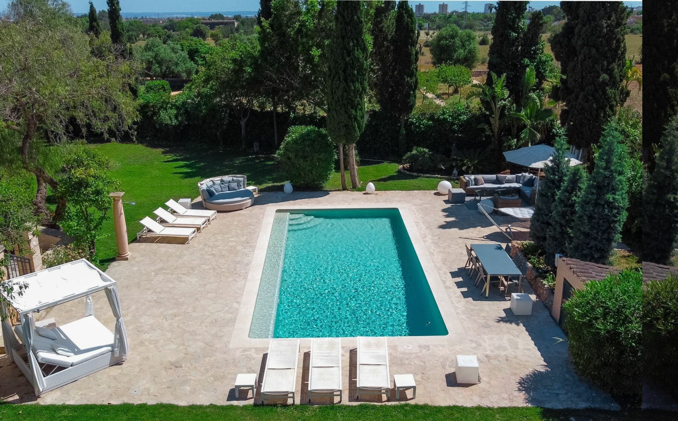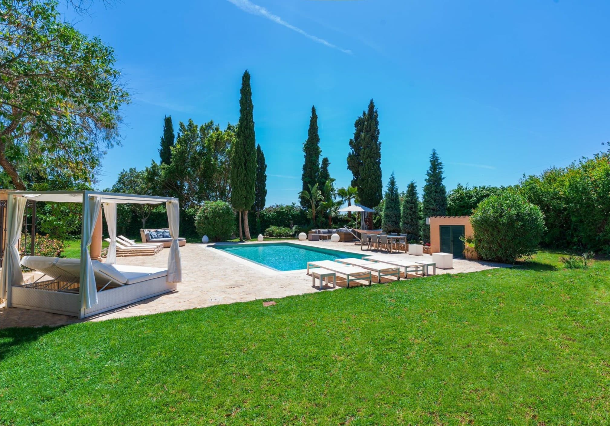This distinguished rural estate is located in the serene and bucolic agricultural area of Marratxí, just a few kilometers north of Palma. The property is available for monthly rental. The rental price varies depending on the season, and the website lists it as “from €…”. A security deposit for possible damages is also required.