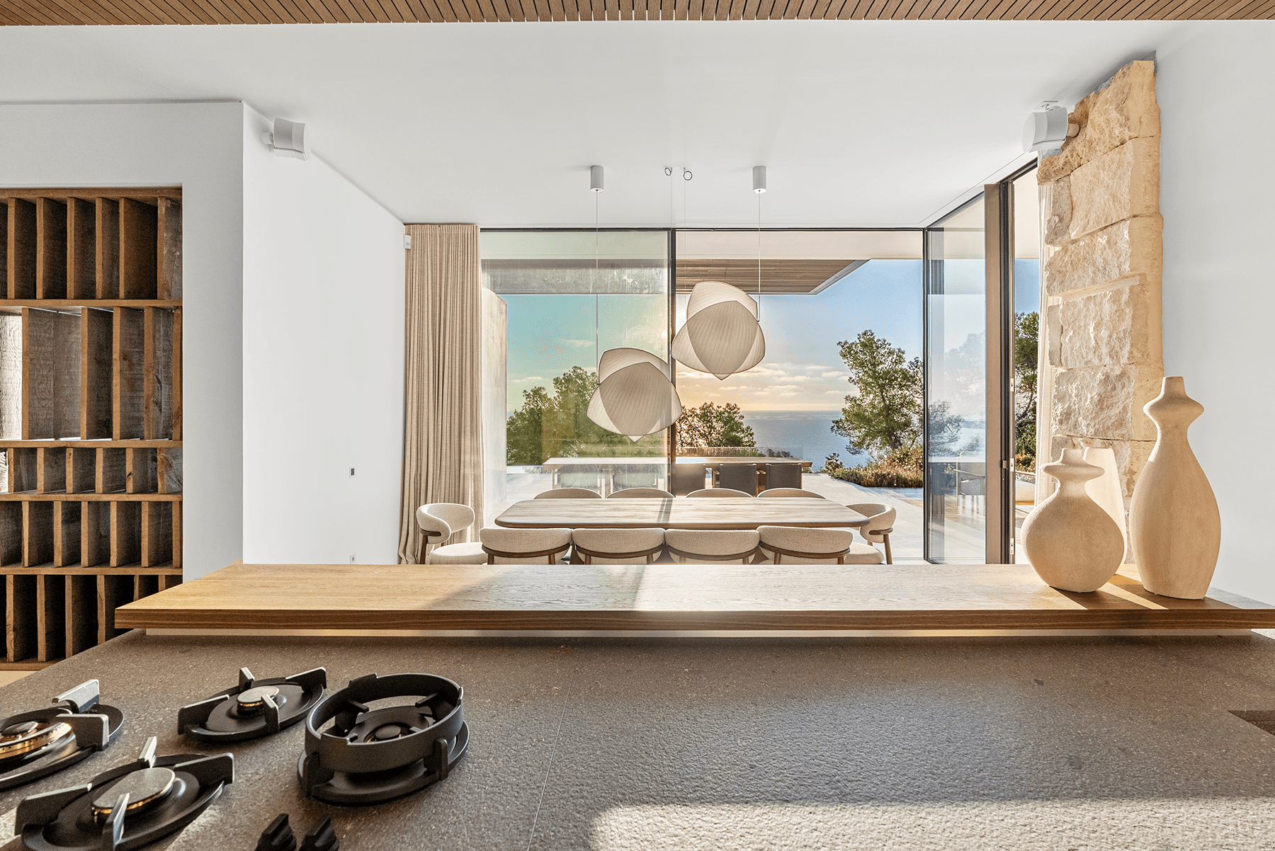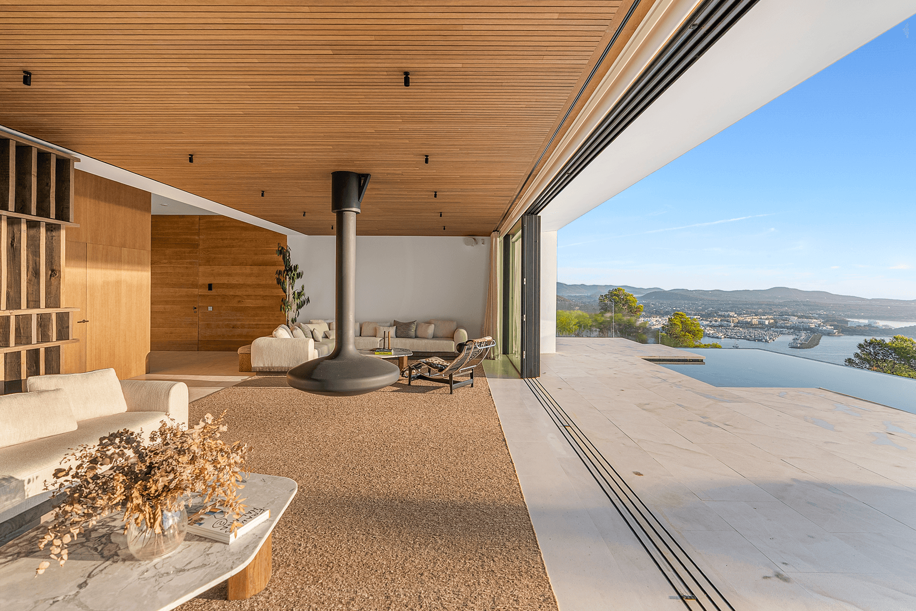 Casa Rise is presented as a residence located in a natural and peaceful environment near Santa Eulalia, surrounded by gentle hills and the essence of the Mediterranean landscape.