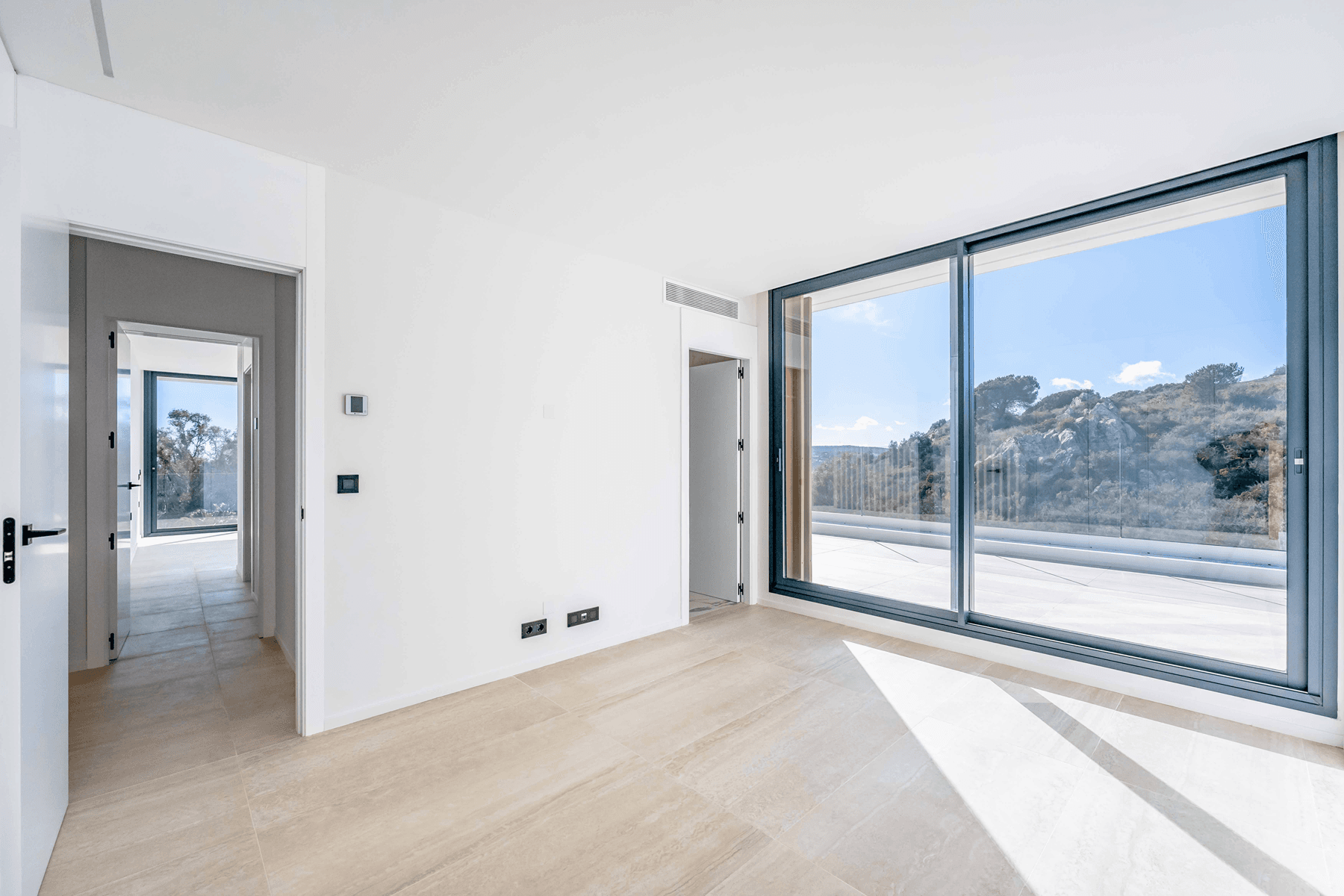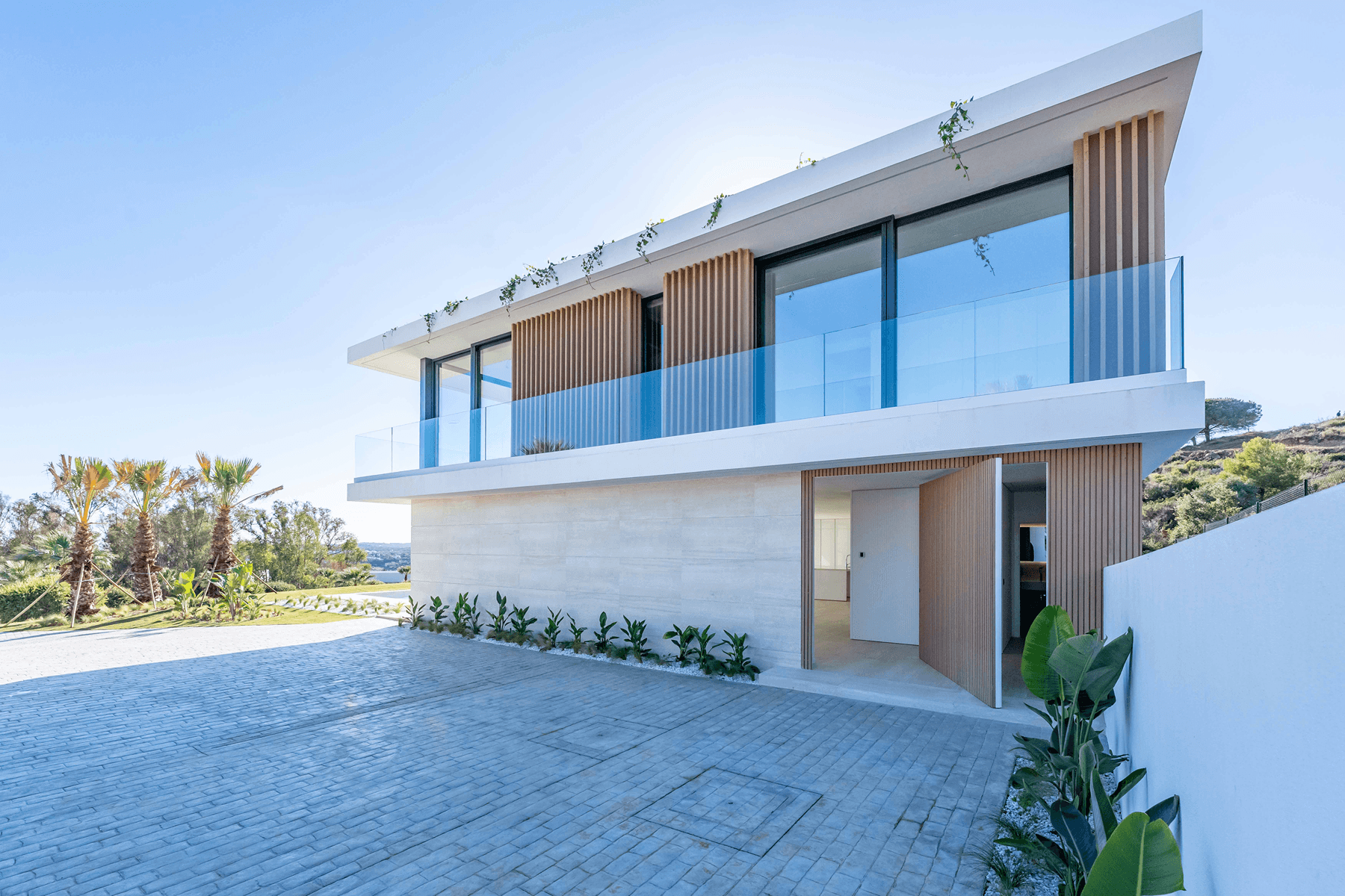 Villa Mimosa is a newly built contemporary residence set on an elevated south facing plot in La Reserva’s exclusive Zona M. The property sits on 2,305 m² and enjoys uninterrupted views of the Mediterranean Sea, the surrounding hills and the natural green zones that define this part of Sotogrande. Its design follows a clear minimalist aesthetic where clean lines, natural materials and abundant light create a calm and refined living environment.