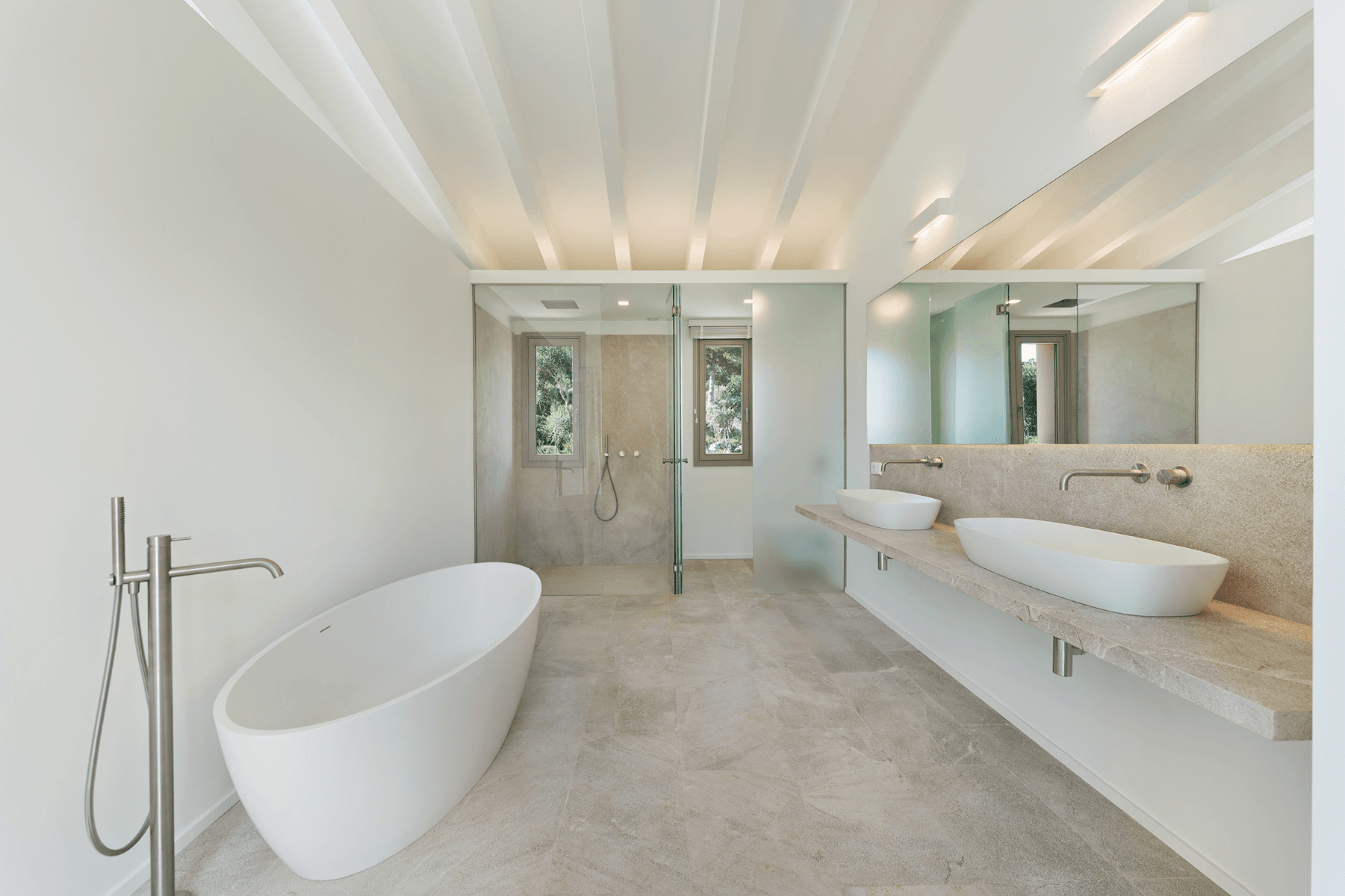 The house opens up through a light-flooded foyer thanks to its floor-to-ceiling panoramic windows. To the left is a spectacular living-dining room with a fireplace, high ceilings, and direct access to the SieMatic – Pure kitchen, a space with clean lines and contemporary elegance that leads to a guest bathroom. On the right wing, a well-curated library introduces the sleeping area, consisting of four suites, all with direct access to the garden, high-quality built-in wardrobes with interior lighting, and bathrooms lined with natural stone; the master bedroom also includes a Vostok freestanding bathtub that enhances the feeling of serenity. Read more