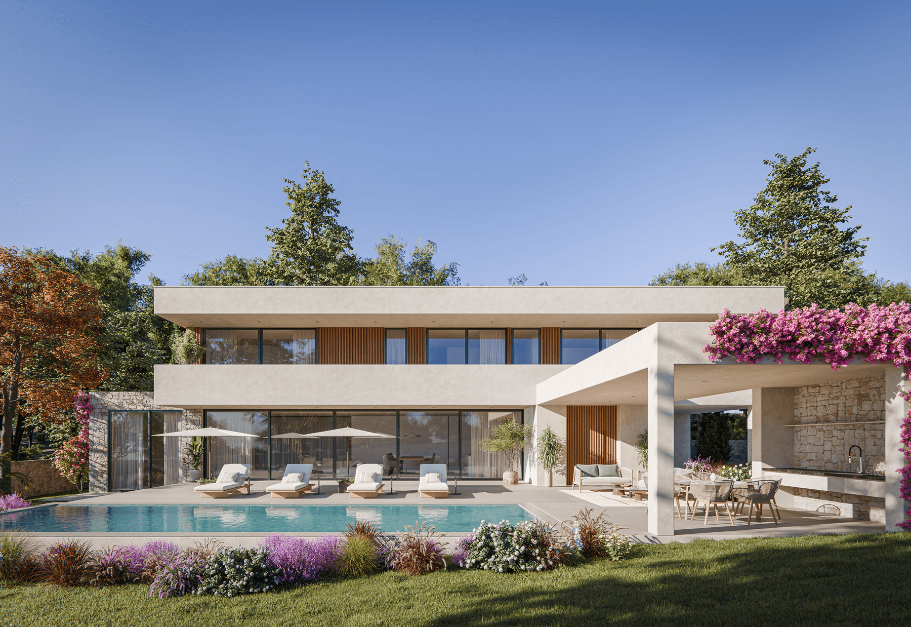 This 390 m² villa combines Mediterranean and contemporary design with a natural environment of native vegetation, offering spacious and bright spaces distributed over two floors. It has an illuminated swimming pool and wooded garden, fully equipped indoor and outdoor kitchens, high-quality finishes such as oak wood flooring, large format pavement, wood coatings, and lacquered cabinets. The lighting has been carefully studied, including indirect LED in mirrors, showers, and recesses, as well as recessed spotlights in ceilings. The house integrates advanced air conditioning and KNX home automation systems, underfloor heating, touch control panels, and technology for telecommunications, sound, and security, combining comfort, functionality, and energy efficiency. The facade and exteriors feature masonry stone and natural wood, creating a Mediterranean retreat that invites rest and contemplation. Read more
