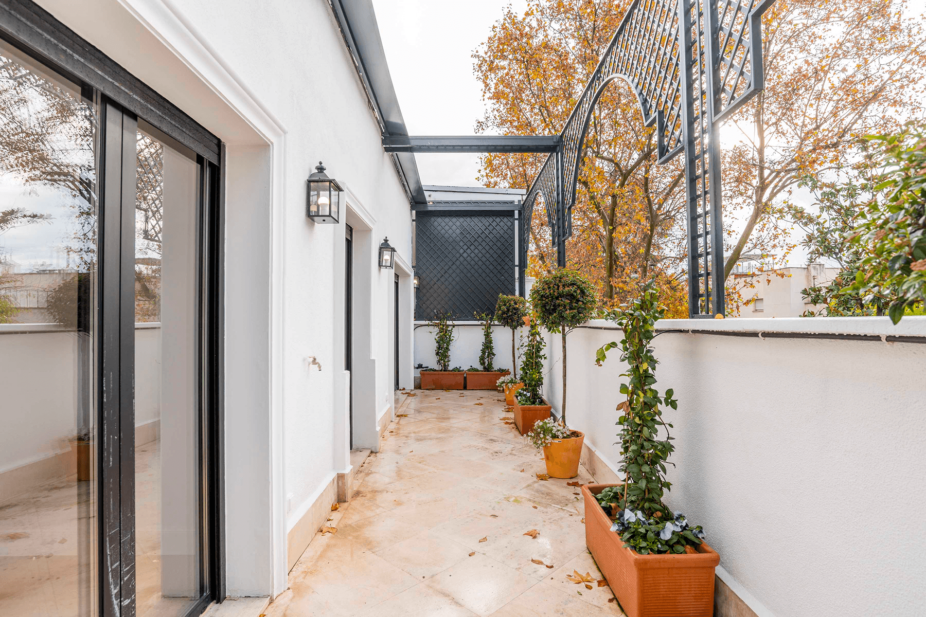 The semibasement level houses a garage with access from the street, a high-end kitchen fully equipped with Bosch, Siemens, and Haier appliances, a laundry and ironing area, a service room with an ensuite bathroom, a guest toilet, and a spacious outdoor space suitable for outdoor dining. Read more
