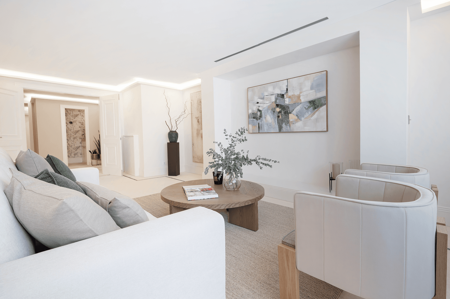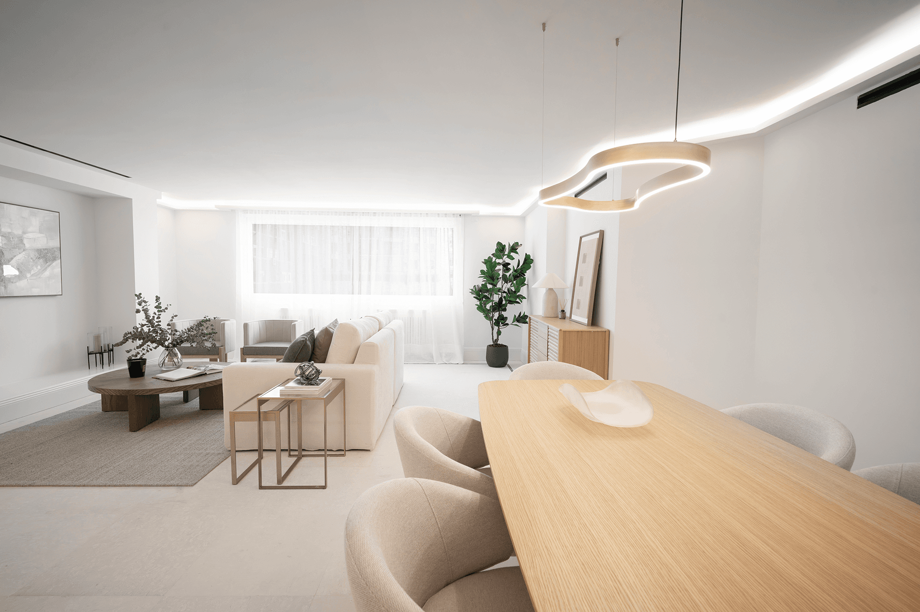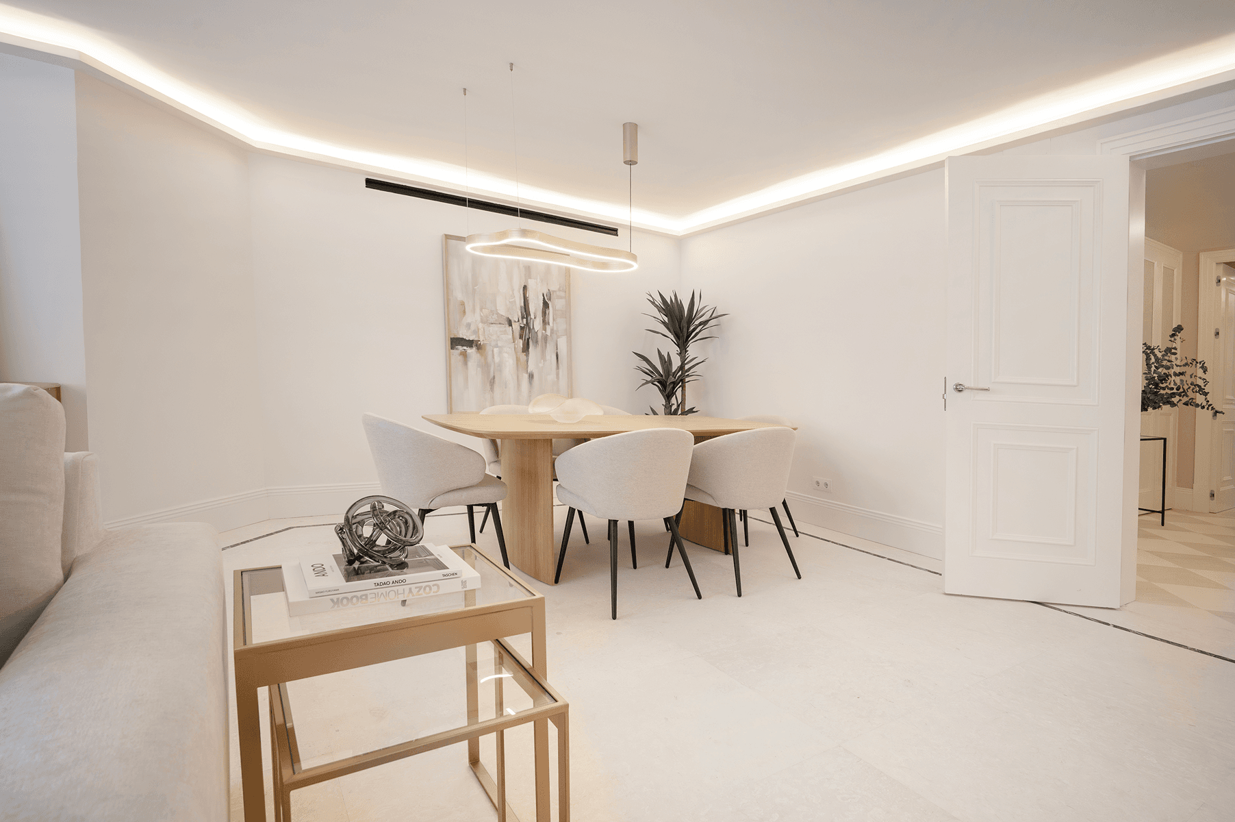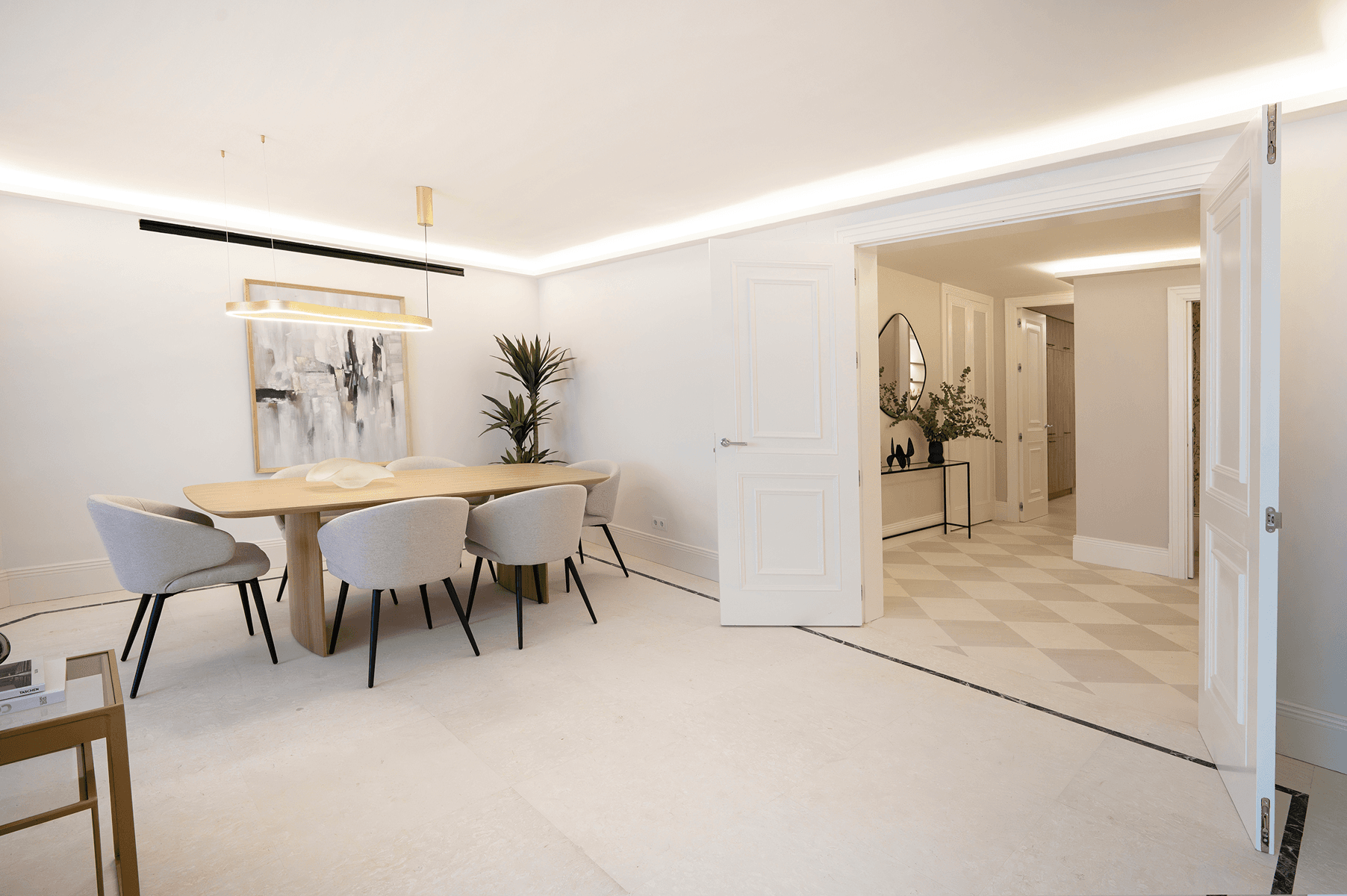 On Miguel Ángel Street, in the heart of the Almagro neighborhood, is this 176 m² home that combines the character of classical Madrid architecture with a contemporary and functional interior design.