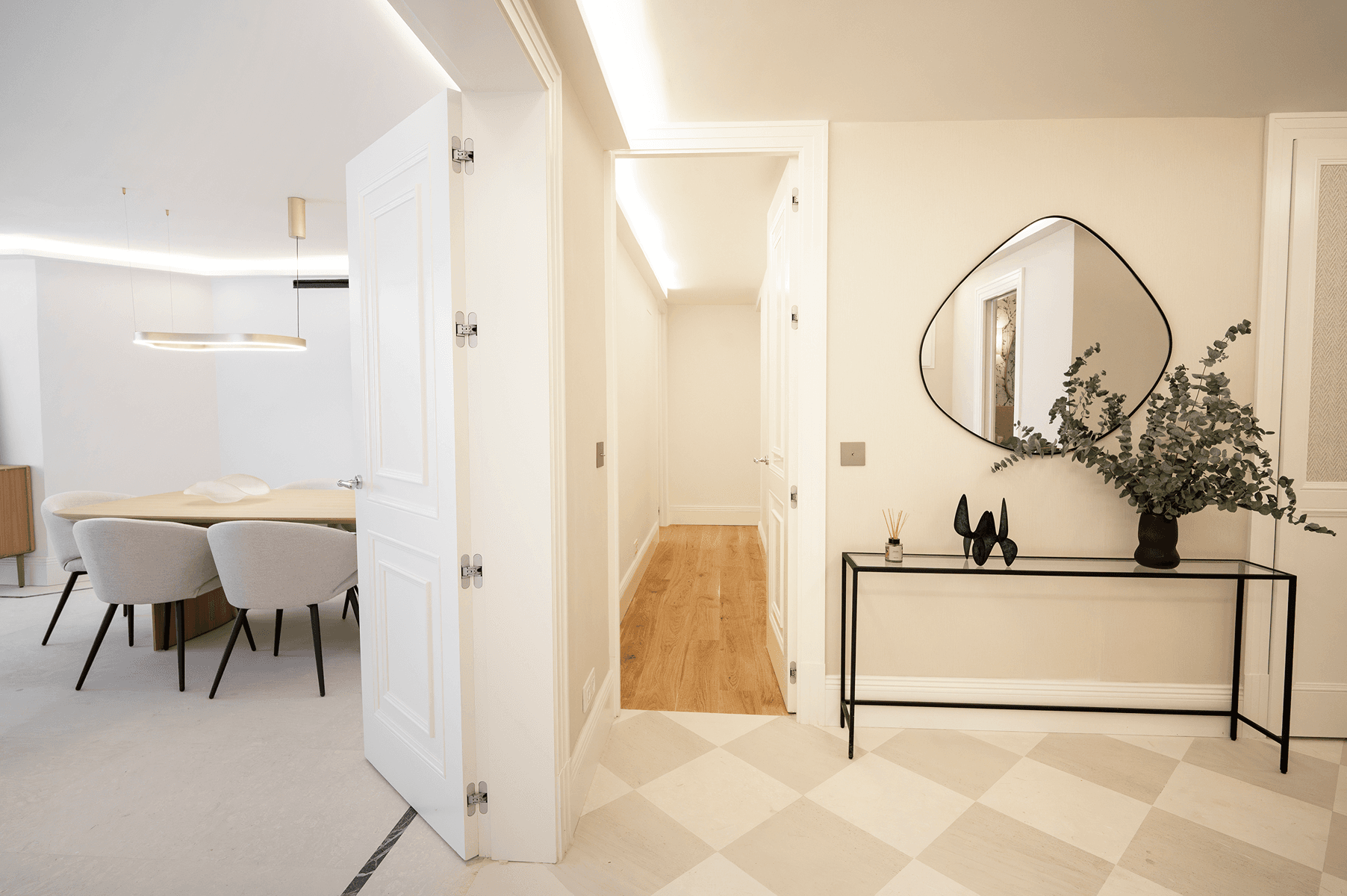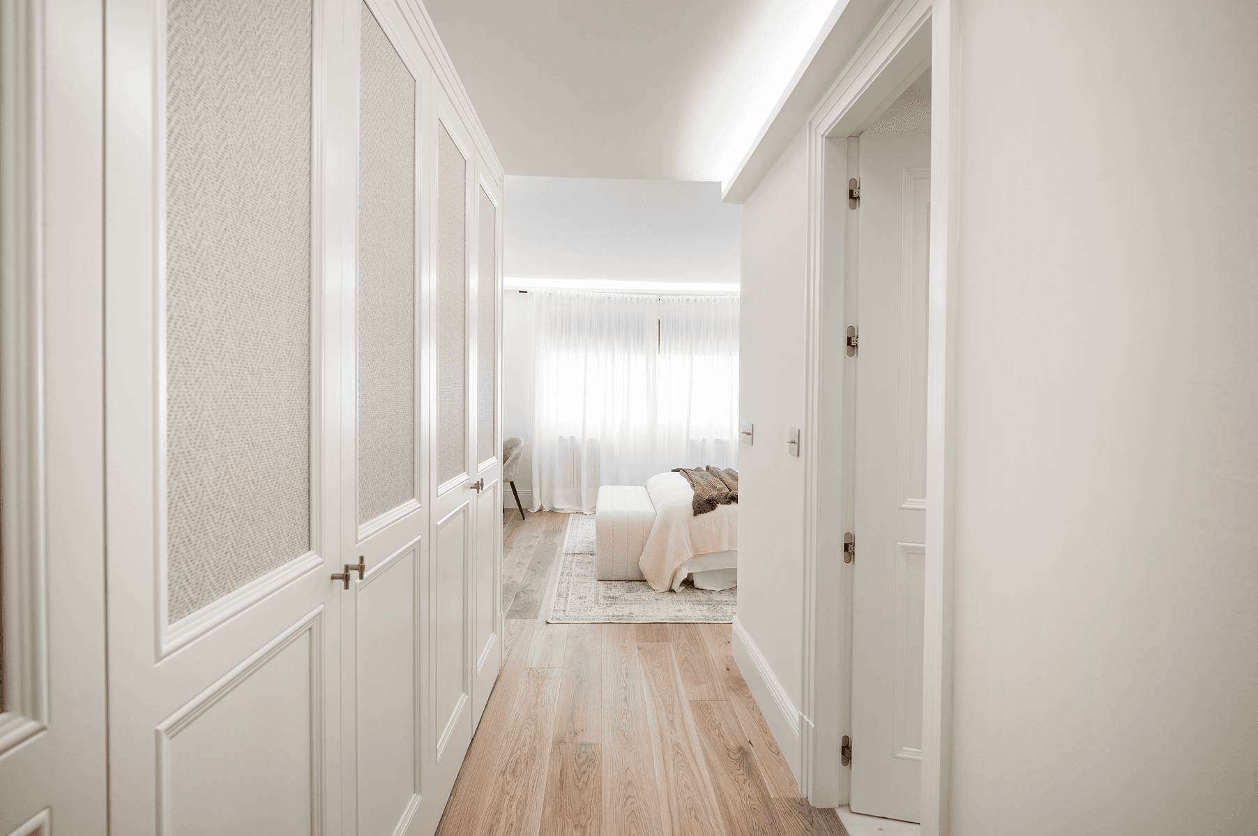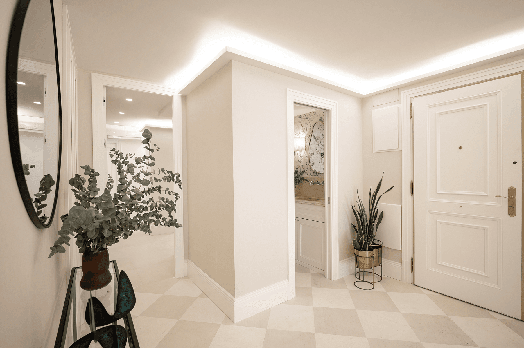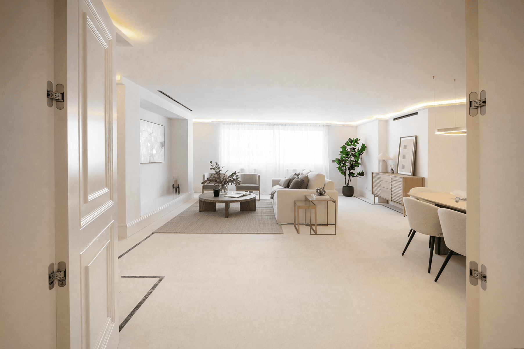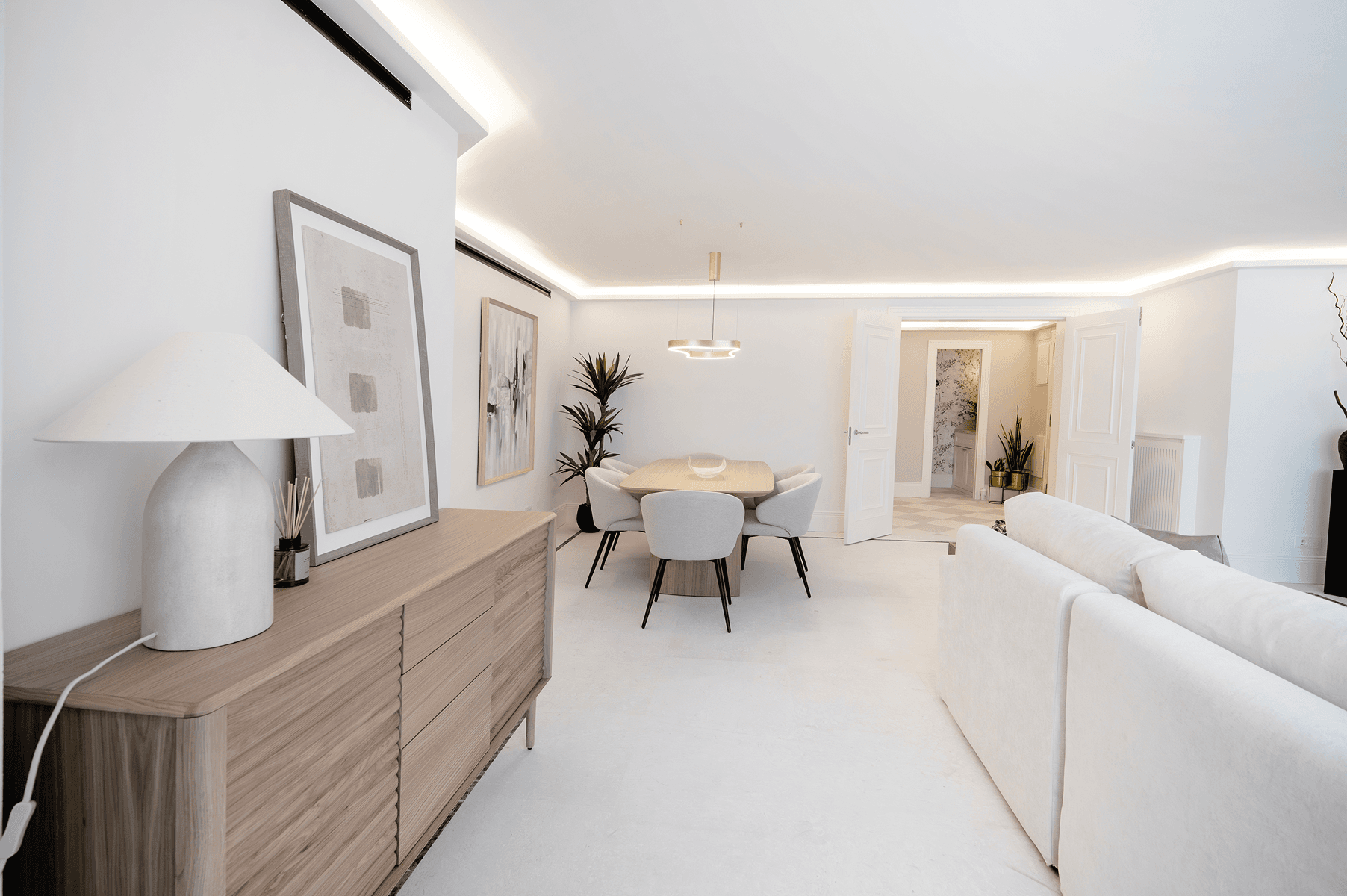 On Miguel Ángel Street, in the heart of the Almagro neighborhood, is this 176 m² home that combines the character of classical Madrid architecture with a contemporary and functional interior design.