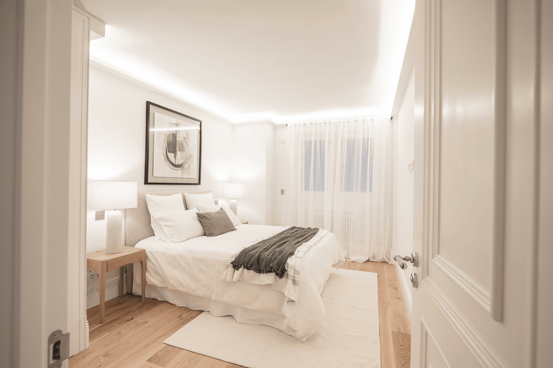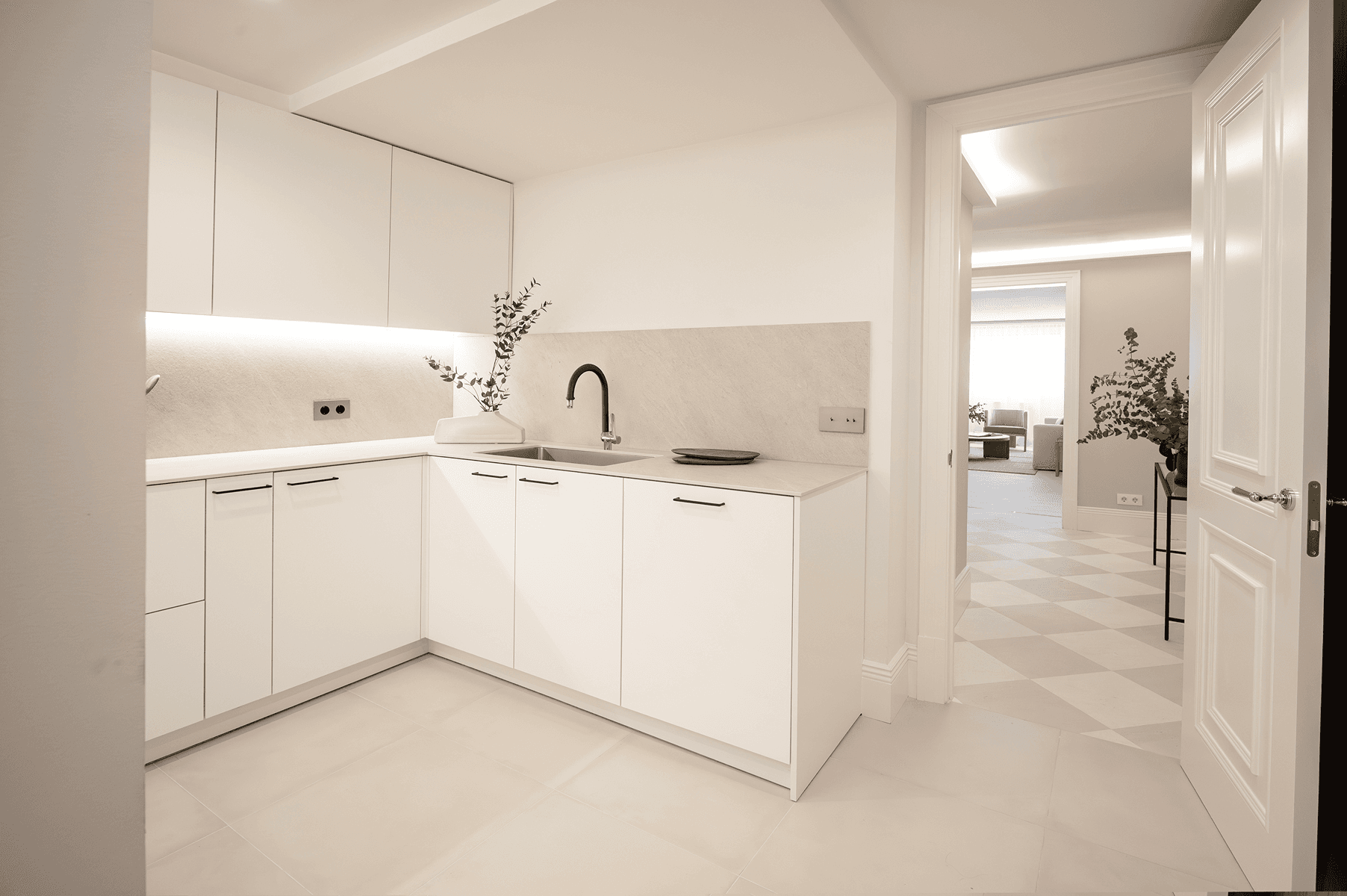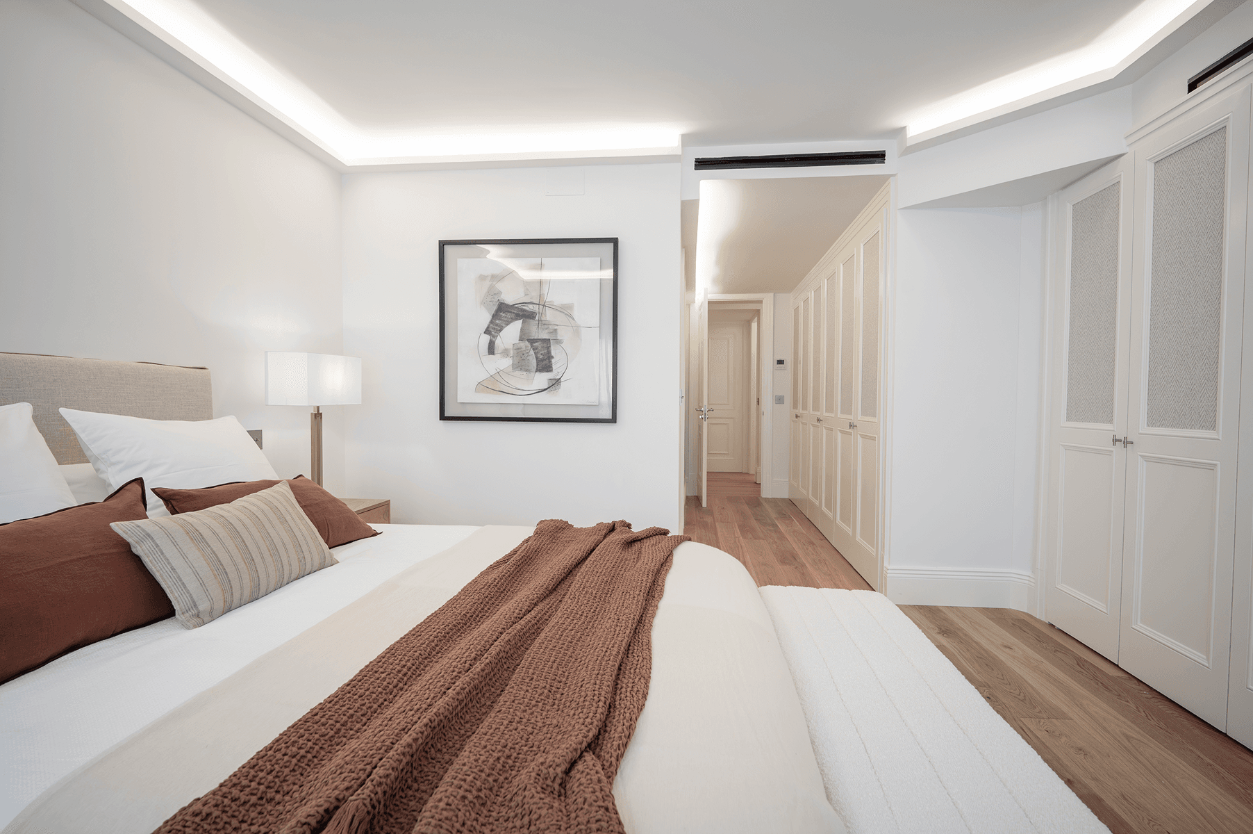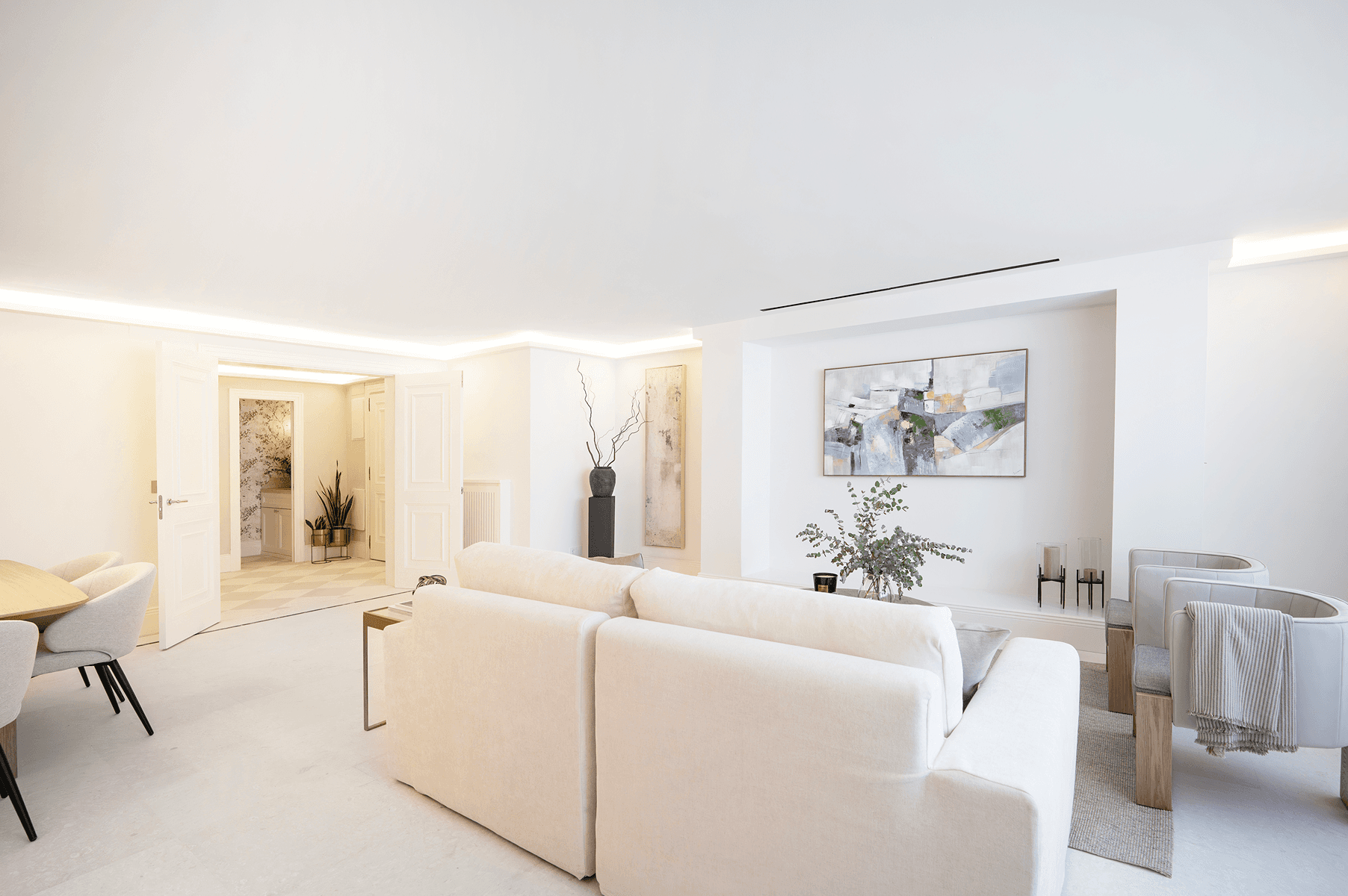 On Miguel Ángel Street, in the heart of the Almagro neighborhood, is this 176 m² home that combines the character of classical Madrid architecture with a contemporary and functional interior design.