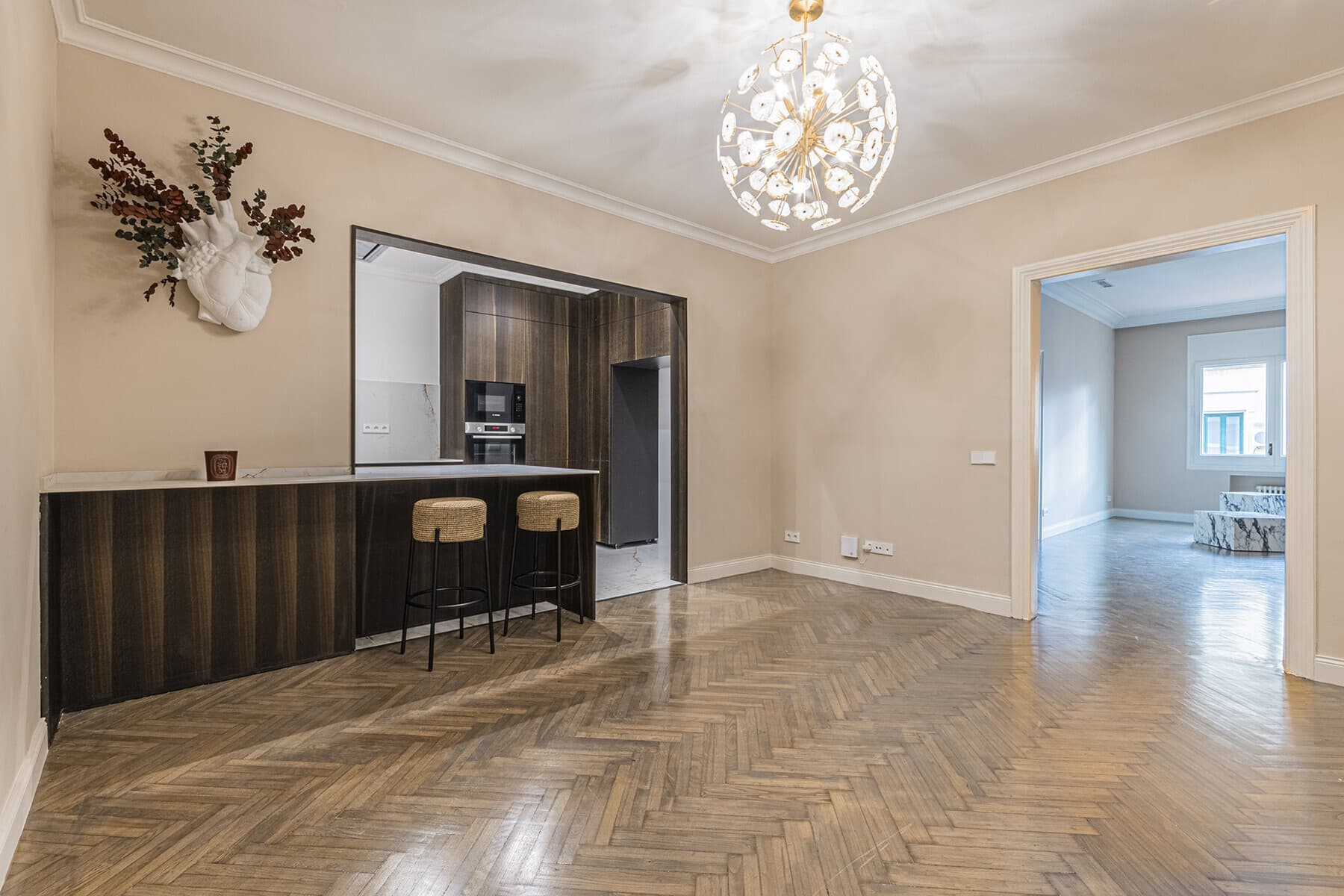 In the heart of Eixample Esquerra Alta, between Passeig de Gràcia and Francesc Macià, lies this high-floor apartment (4th real) of 218 m², set in a stately building with concierge service, original mouldings, and a beautifully preserved classical façade. A home that blends the elegance of historic Eixample with the comfort of modern living.