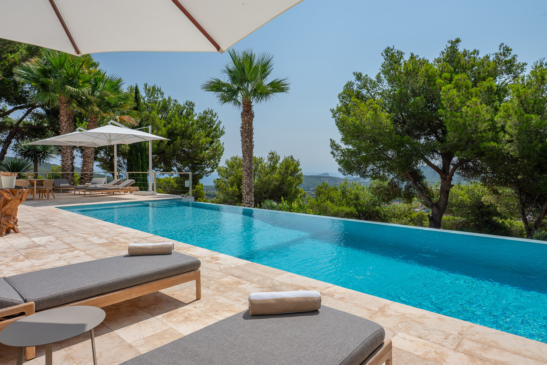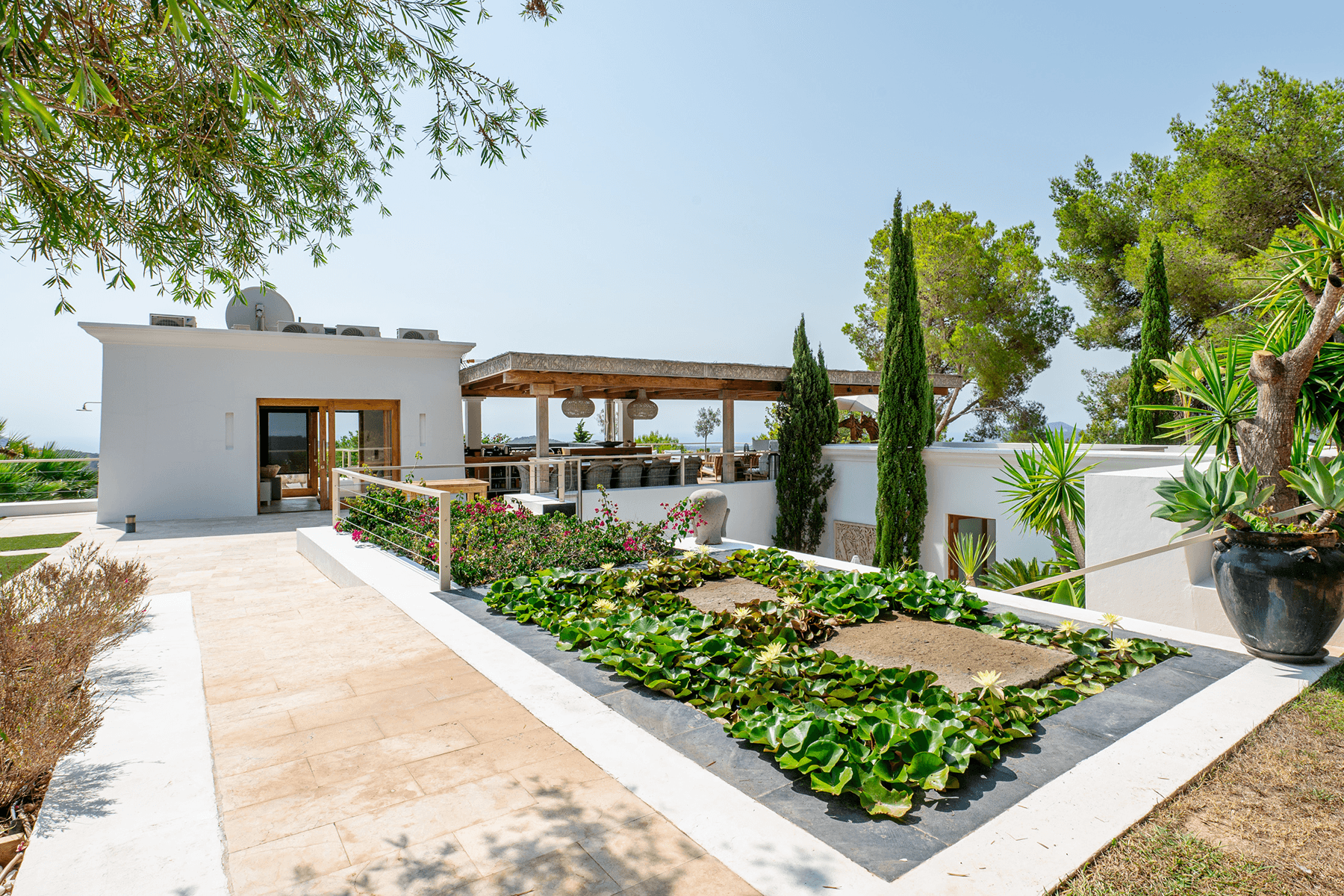 Located at the top of a private hill, Villa Sa Barda is an extraordinary luxury property for sale in Ibiza, offering stunning 270-degree views over the pristine valley of Morna and the Mediterranean Sea.