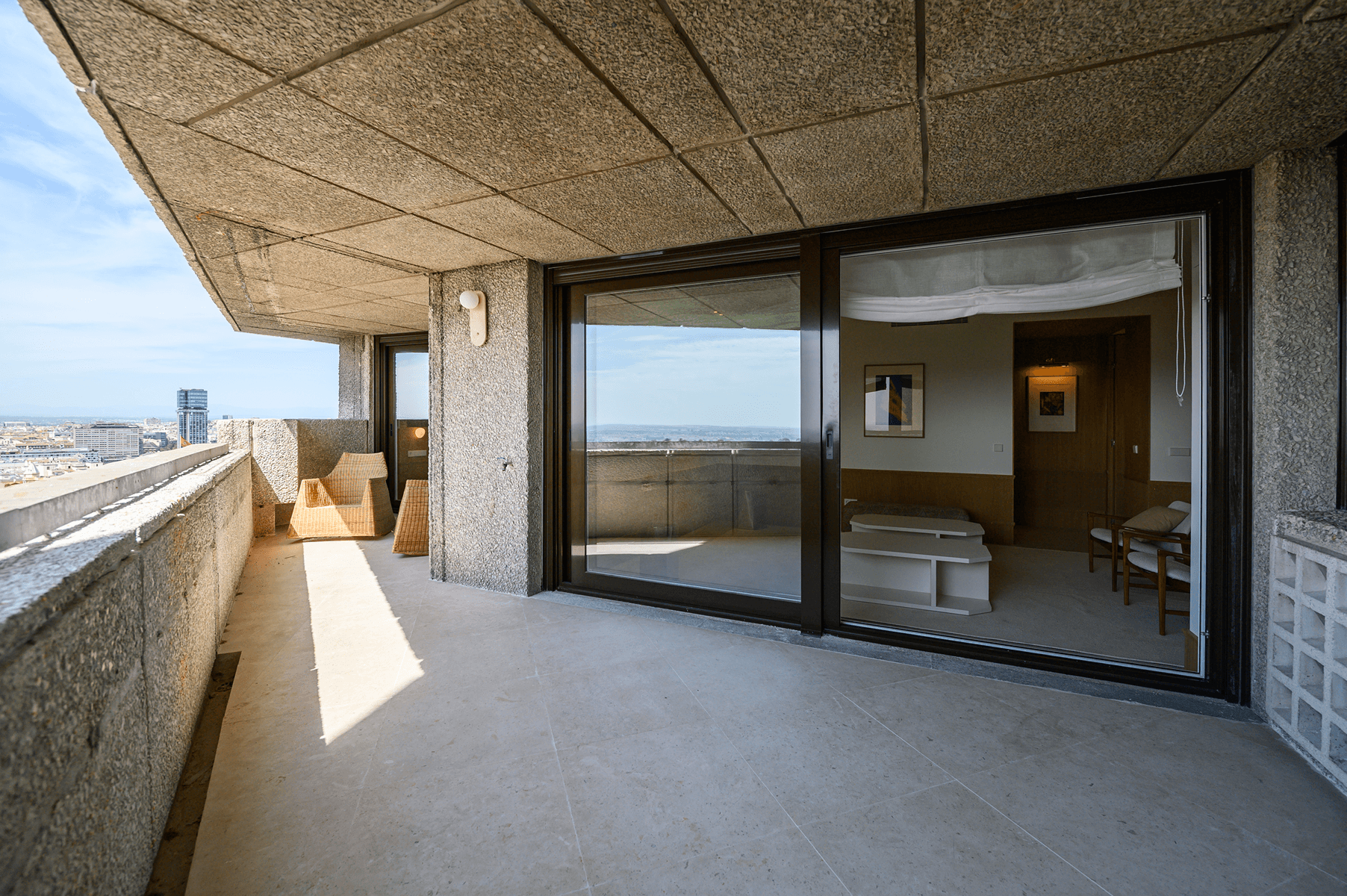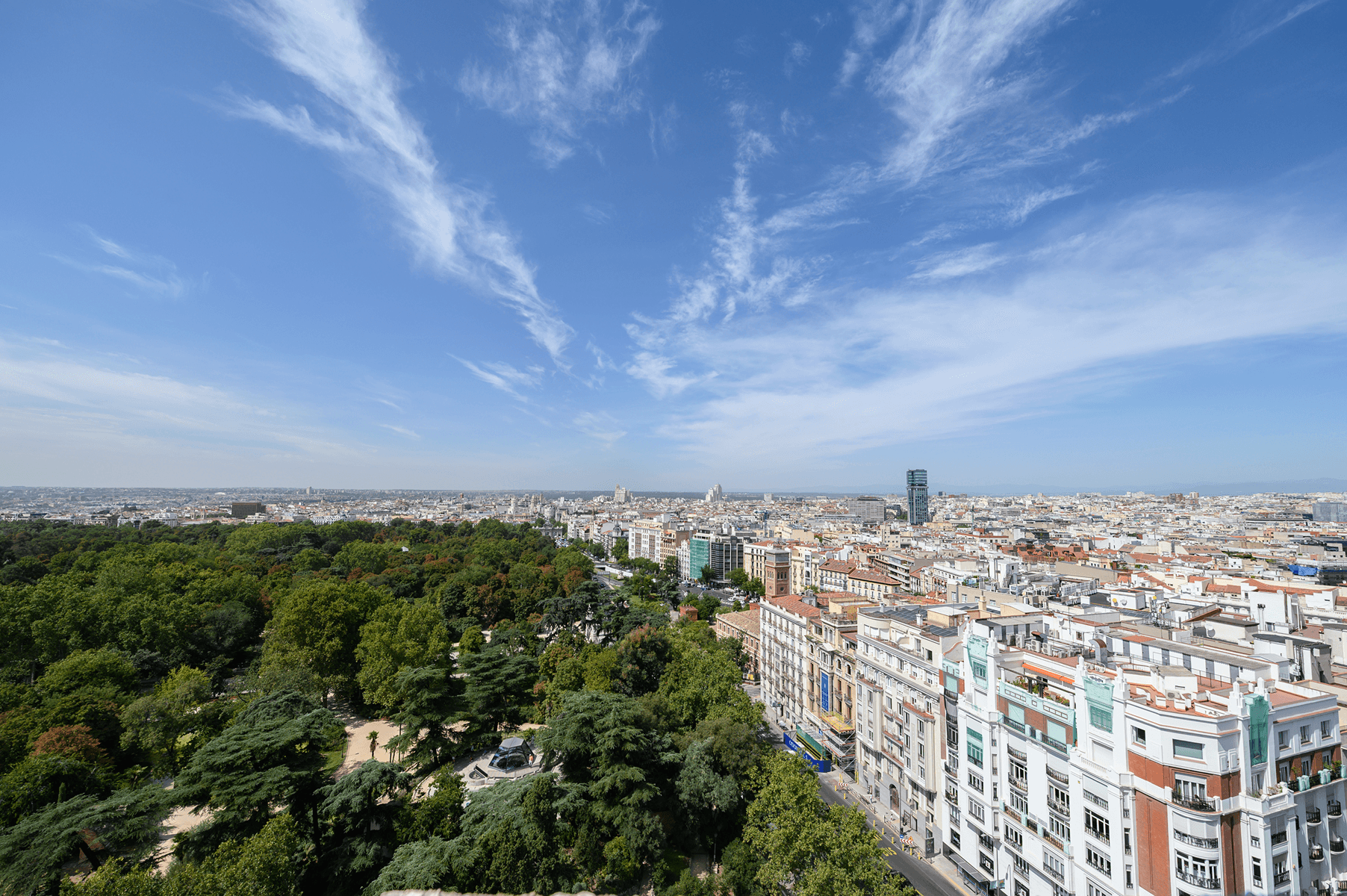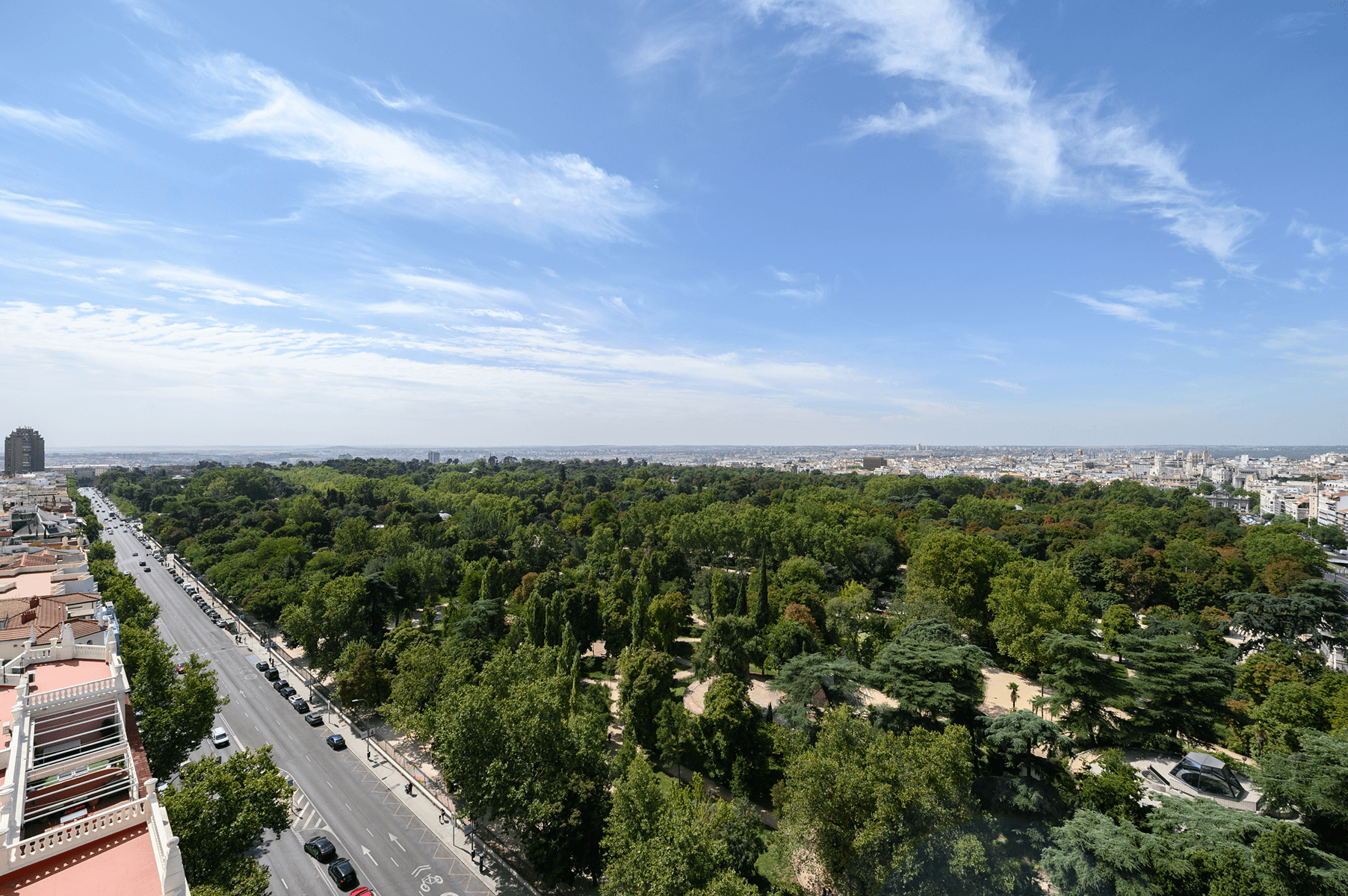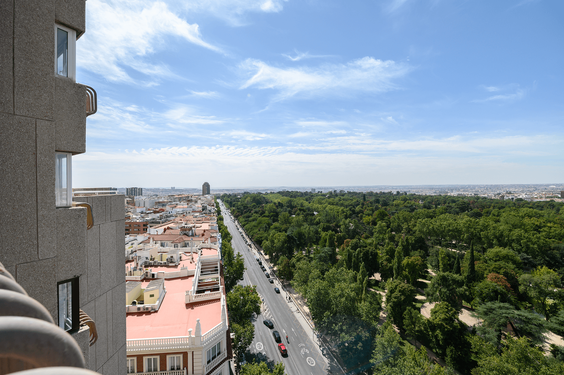 On the 16th floor of the emblematic Torre de Valencia, this extraordinary newly renovated home is located, redefining contemporary luxury in the heart of Madrid. A unique home, not only for its privileged location facing Retiro Park, but also for its impressive open views of Puerta de Alcalá, the city skyline, and Retiro itself, which seem to stretch to infinity.