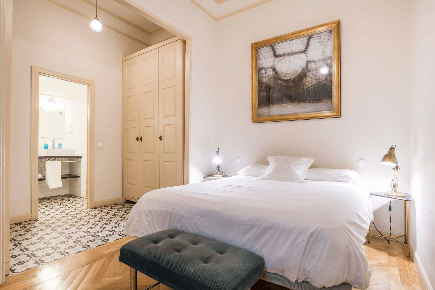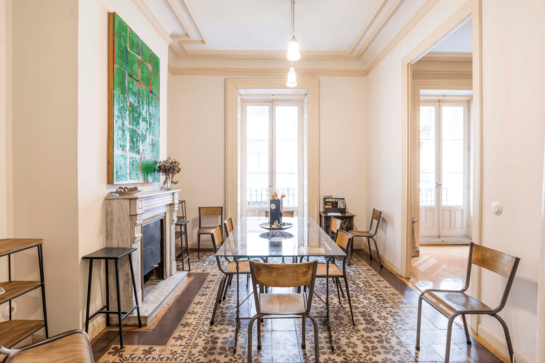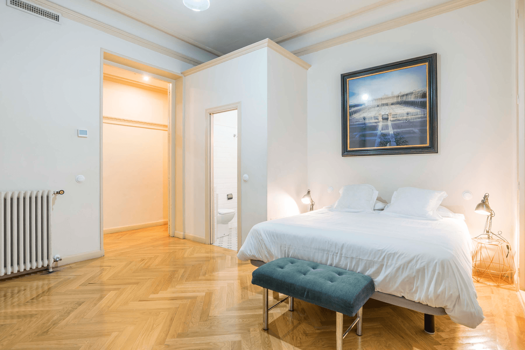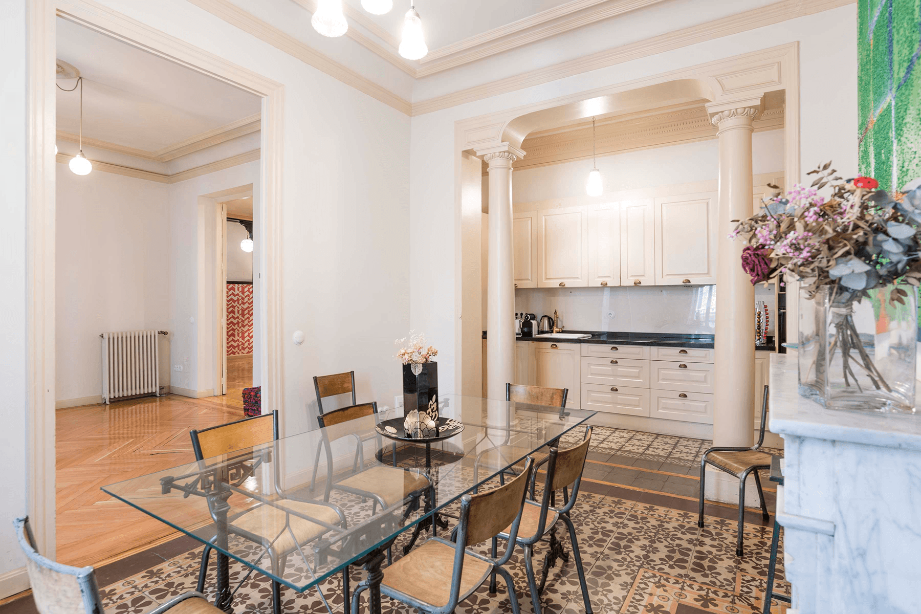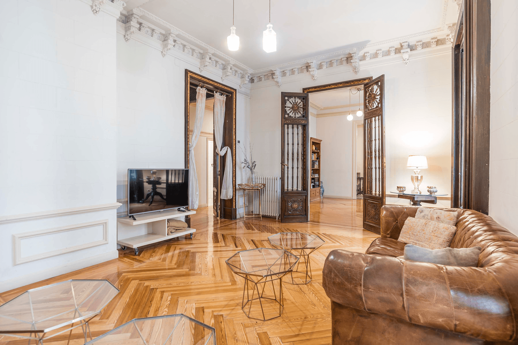 In the historic neighborhood of Justicia stands this majestic 296 m² apartment, located in a classic building from the early 20th century. Its ceilings, which exceed three meters in height, crowned by original moldings, evoke the elegance of another era and interact with the sobriety of a recent renovation that respects its essence. The result is a space that combines architectural memory with the harmony of the contemporary.